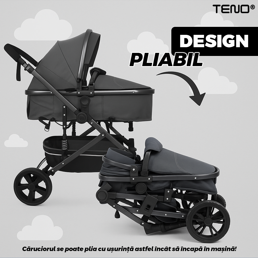 Caruciorul se poate transforma cu usurinta in landou, carucior sport sau scoica auto, adaptandu-se nevoilor fiecarui moment. Aceasta versatilitate il face o alegere practica si economica pentru parintii care doresc un singur produs complet.