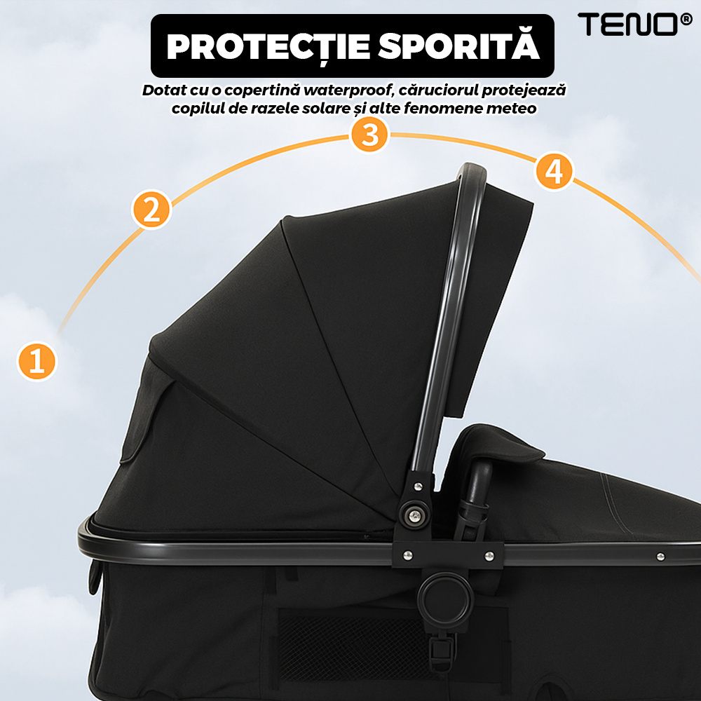 Copertina reglabila protejeaza copilul impotriva razelor UV, vantului si ploii usoare. Poate fi extinsa sau retrasa in functie de vreme, oferind un confort sporit in timpul plimbarilor.