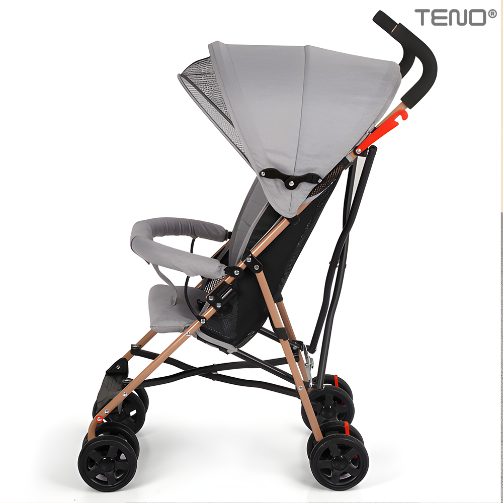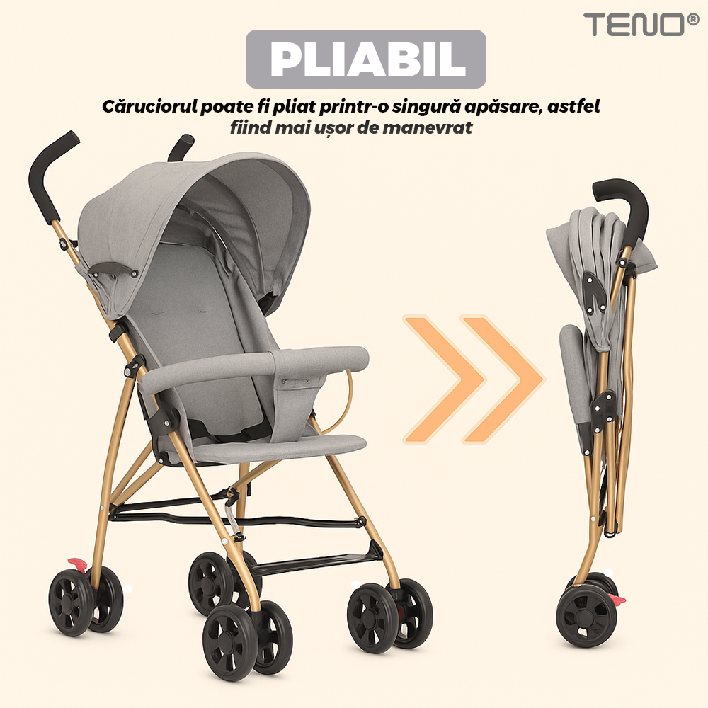 Carucior Sport pentru Bebeluși Teno2037, pliabil, usor de carat, spatios, copertina retractabila, greutate maxima suportata 25 kg, gri deschis