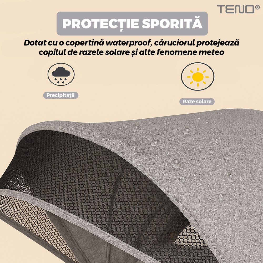 Copertina mare ofera o protectie excelenta impotriva razelor soarelui, asigurand umbra si confort copilului in zilele calduroase. Materialul rezistent si extensibil permite adaptarea in functie de intensitatea luminii, astfel incat plimbarile sa fie placute indiferent de vreme.