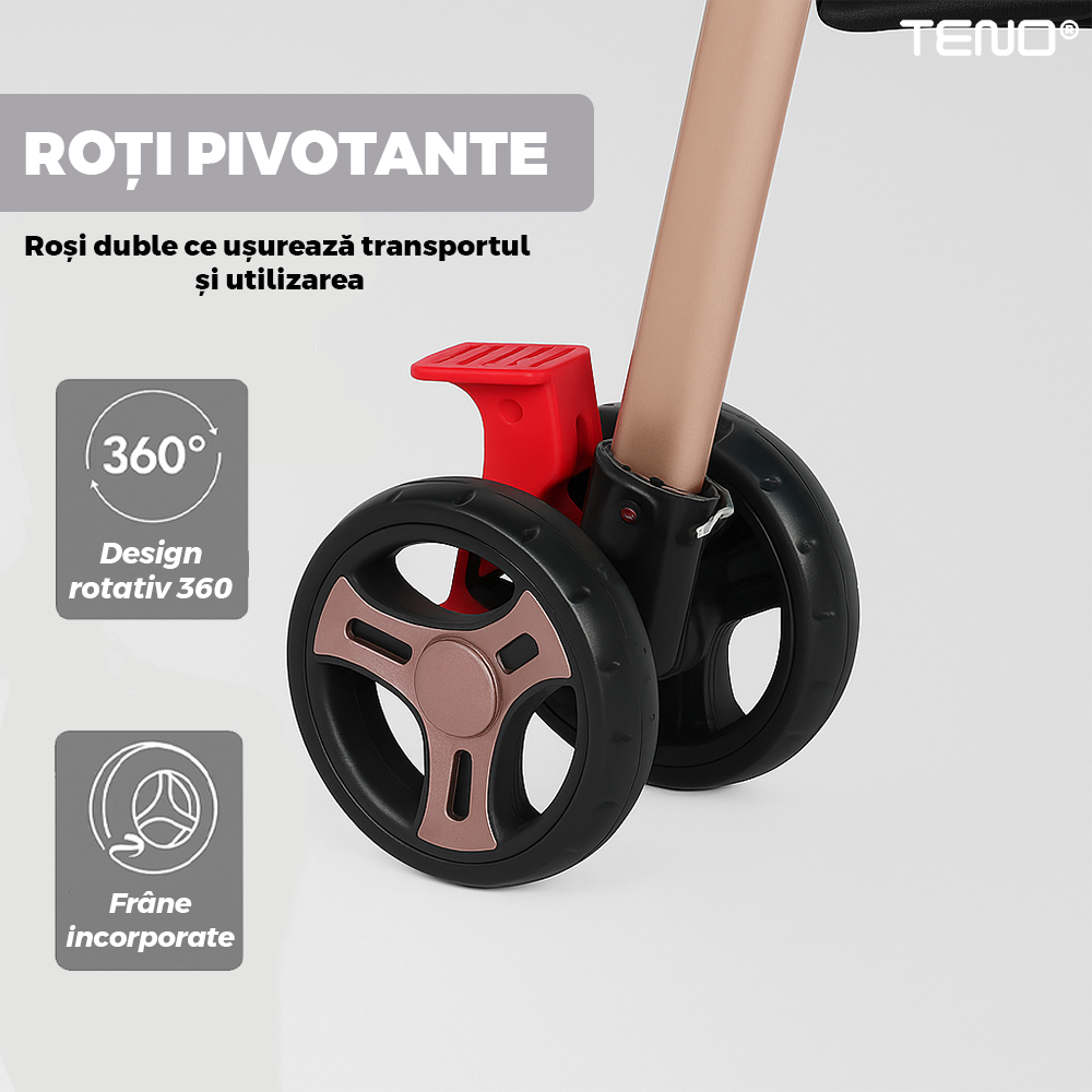 Echipat cu roti duble pivotante, caruciorul asigura o manevrabilitate excelenta si stabilitate pe diverse tipuri de teren. Rotile pot fi blocate pentru mers drept, oferind control deplin si siguranta sporita in timpul plimbarilor.