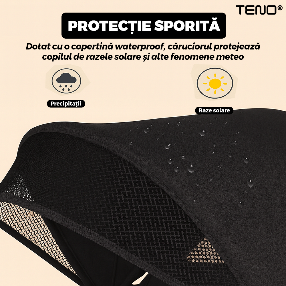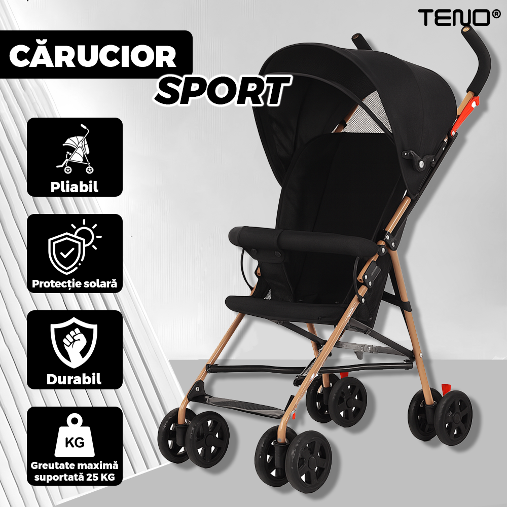 Carucior Sport pentru Bebeluși Teno2038, pliabil, usor de carat, spatios, copertina retractabila, greutate maxima suportata 25 kg, negru