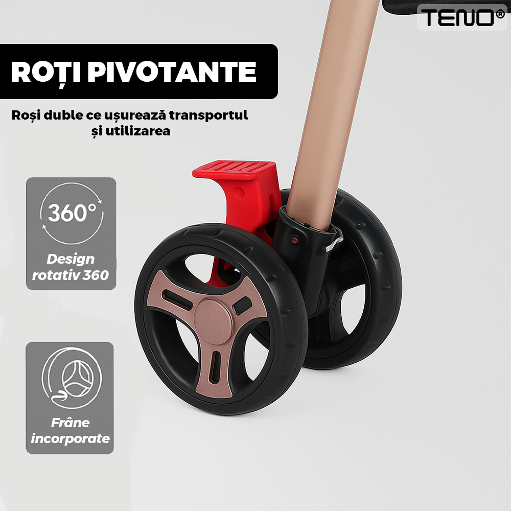 Echipat cu roti duble pivotante, caruciorul asigura o manevrabilitate excelenta si stabilitate pe diverse tipuri de teren. Rotile pot fi blocate pentru mers drept, oferind control deplin si siguranta sporita in timpul plimbarilor.