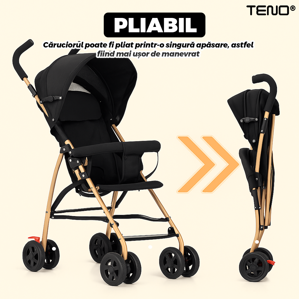 Caruciorul se pliaza usor, intr-un singur gest, devenind compact si usor de transportat sau depozitat. Este ideal pentru parintii activi, care au nevoie de un carucior practic, ce poate fi luat fara efort in masina sau in calatorii.
