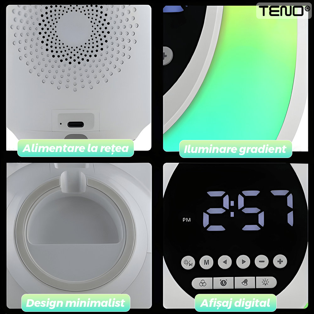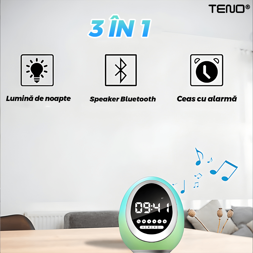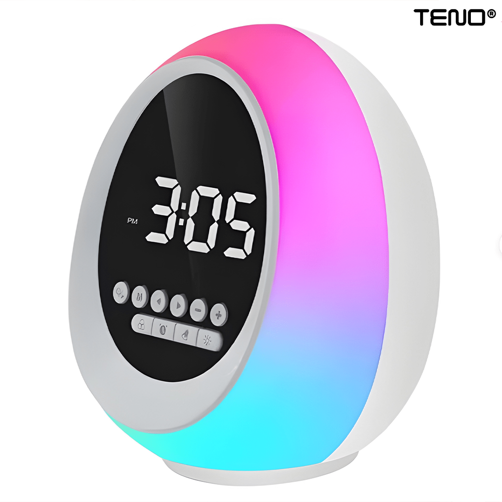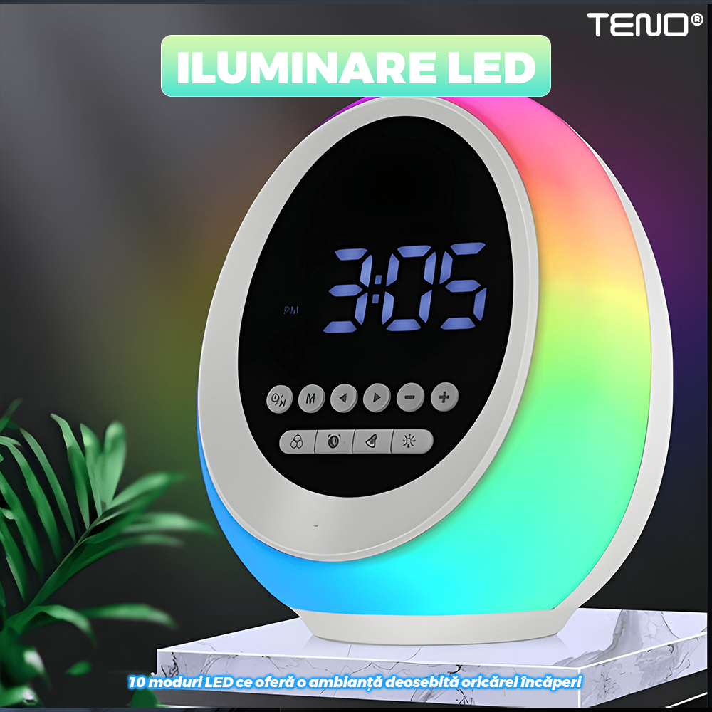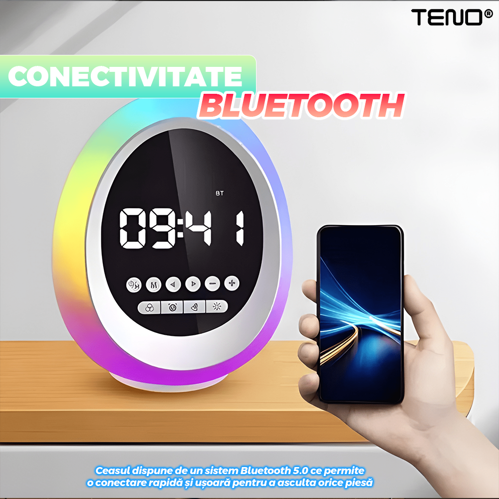 Ceas Desteptator Multifunctional Teno2093, Bluetooth, functie de alarma, functie de radio, lumini RGB, autonomie ridicata, oval