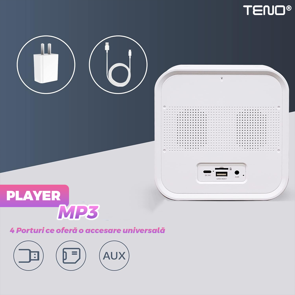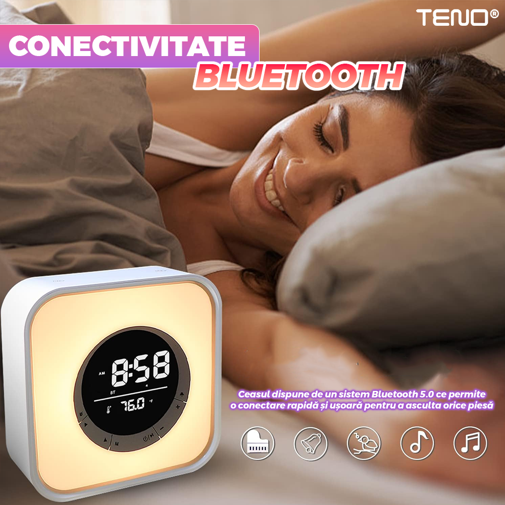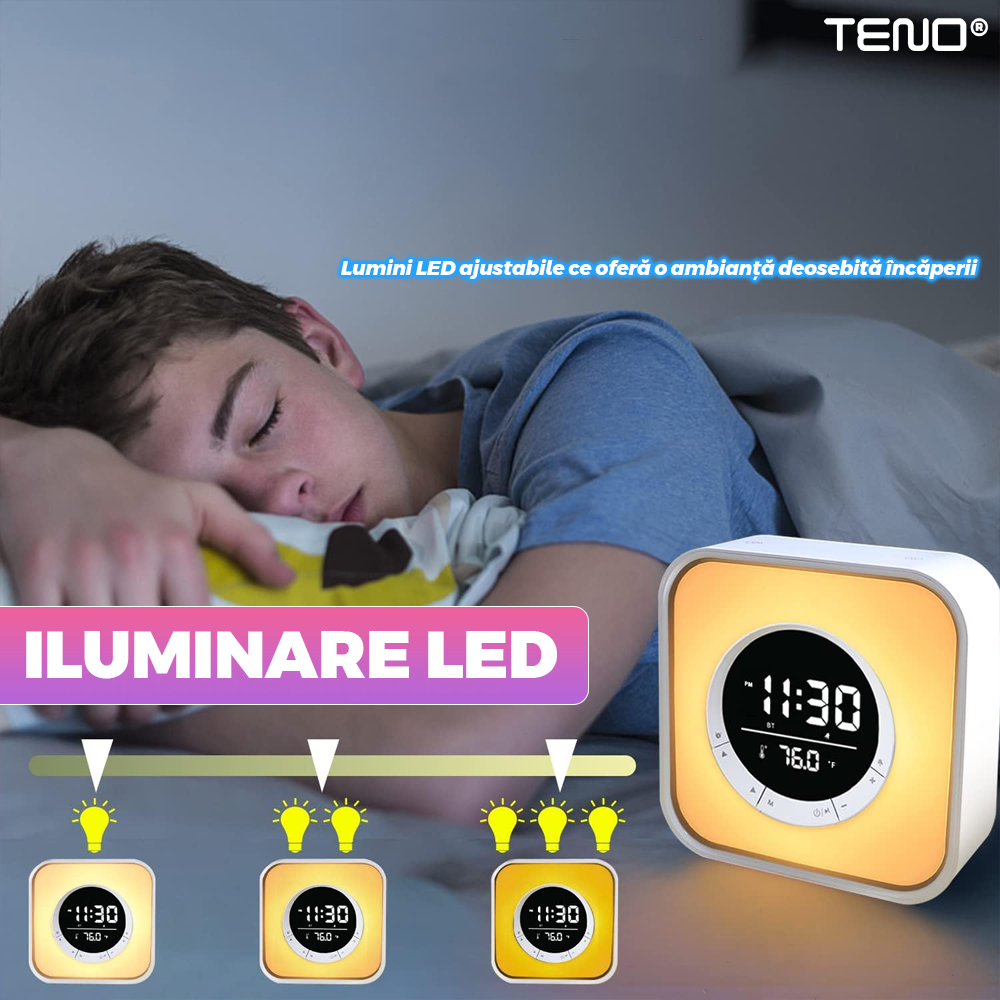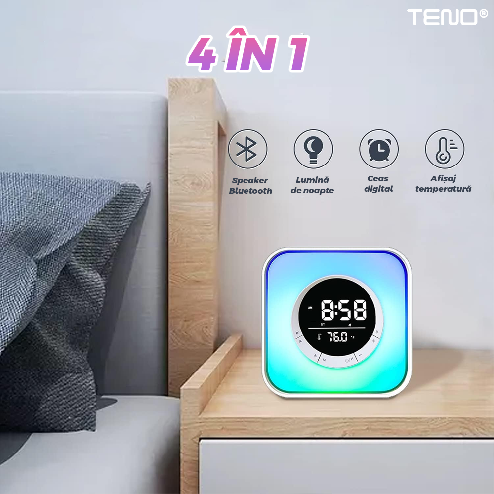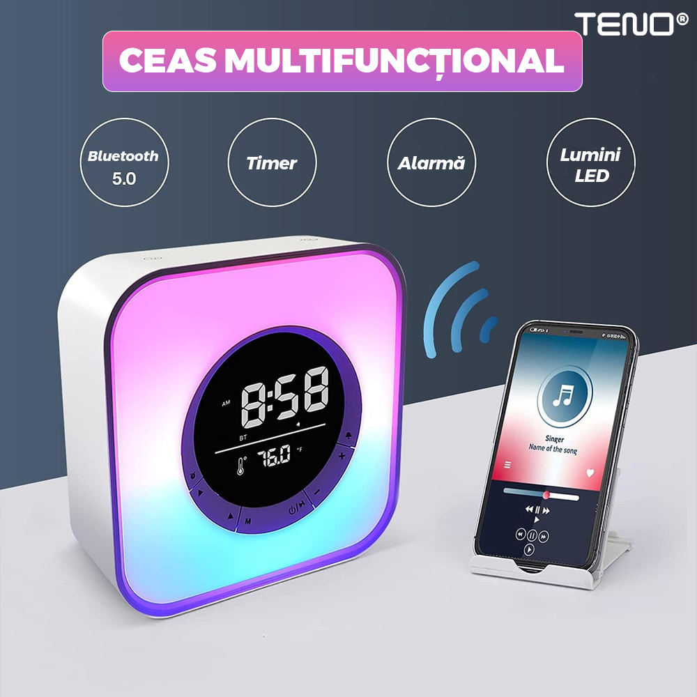 Ceas Desteptator Multifunctional Teno2094, Bluetooth, functie de alarma, functie de radio, afisaj temperatura, lumini RGB, autonomie ridicata, patrat