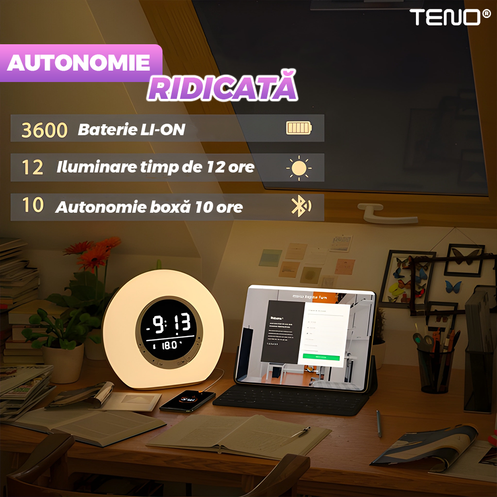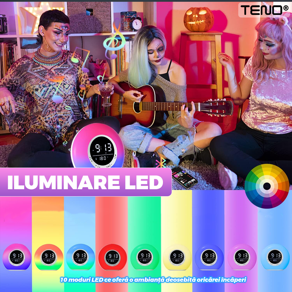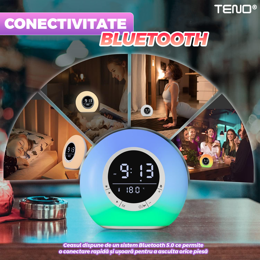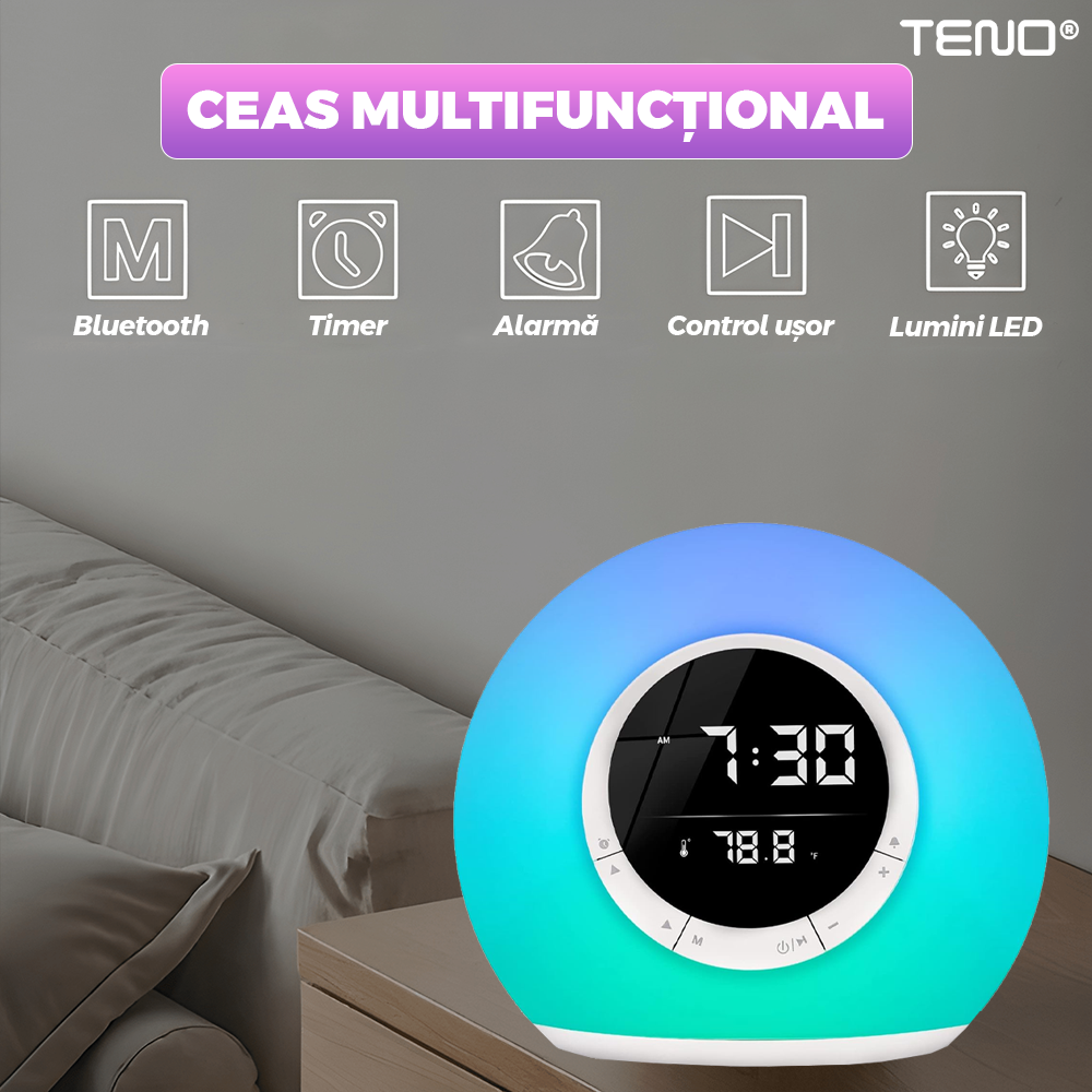 Dispozitivul combina functii intr-un singur produs: afisarea orei si a datei, afisajul temperaturii ambientale, boxa incorporata si redarea muzicii. Aceasta combinatie face din ceas un gadget practic si multifunctional, perfect pentru uz zilnic.