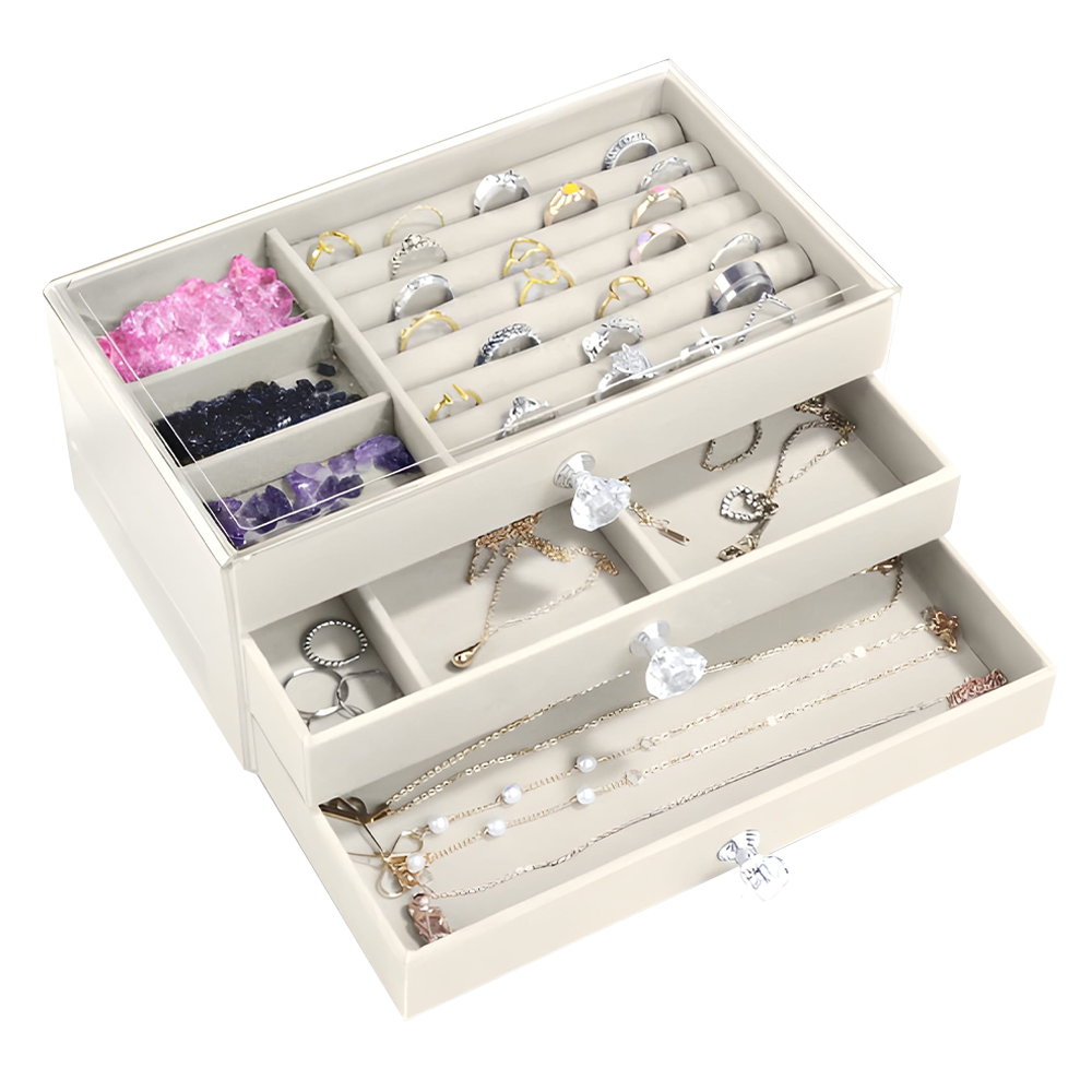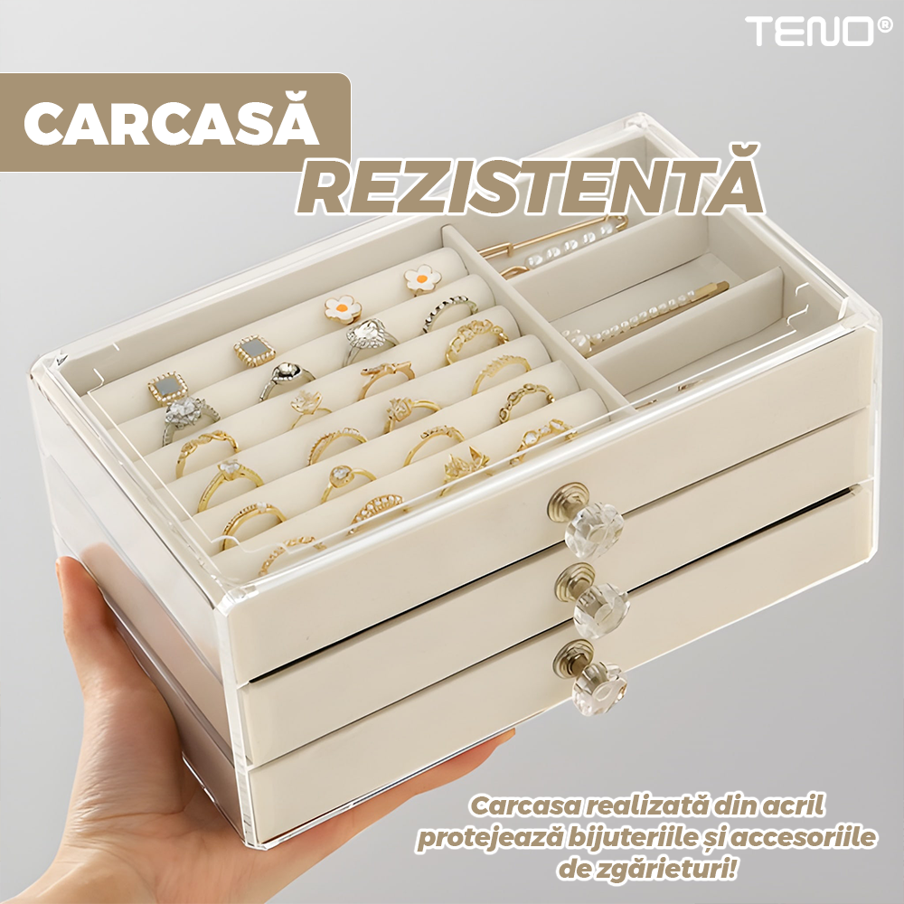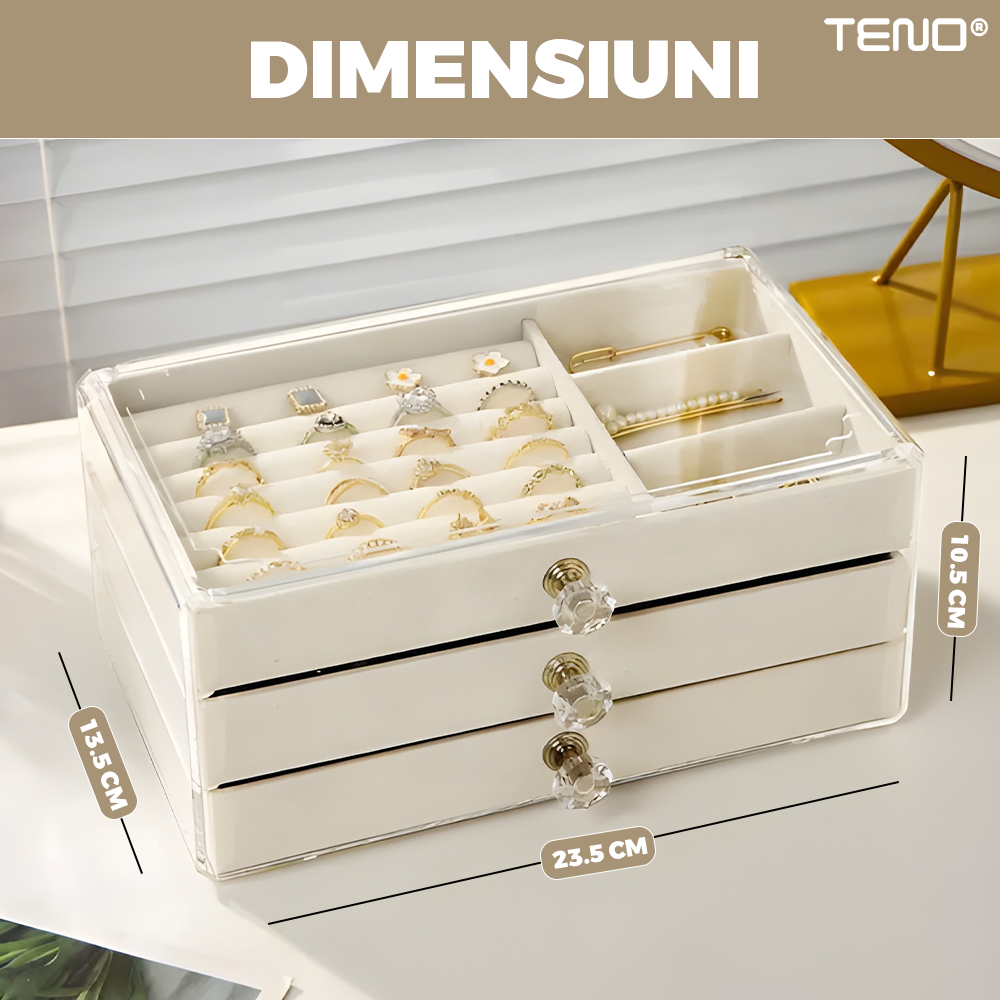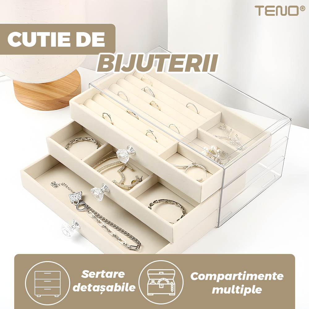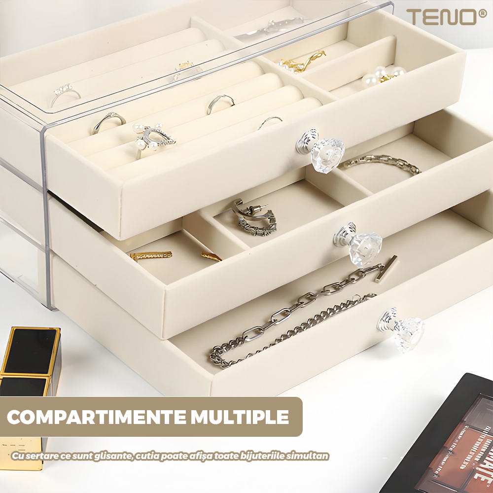 Cutie pentru Bijuterii Teno1924, organizare si depozitare, 3 casete, captuseala din catifea, carcasa transparenta, compartimente inele, bratari, lantisoare, 23.5 x 13.5 x 10.5 cm, bej