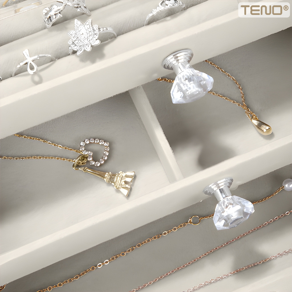 Are compartimente multiple, special gandite pentru a separa inelele, colierele, bratara sau cerceii, astfel incat fiecare obiect sa isi gaseasca locul potrivit.