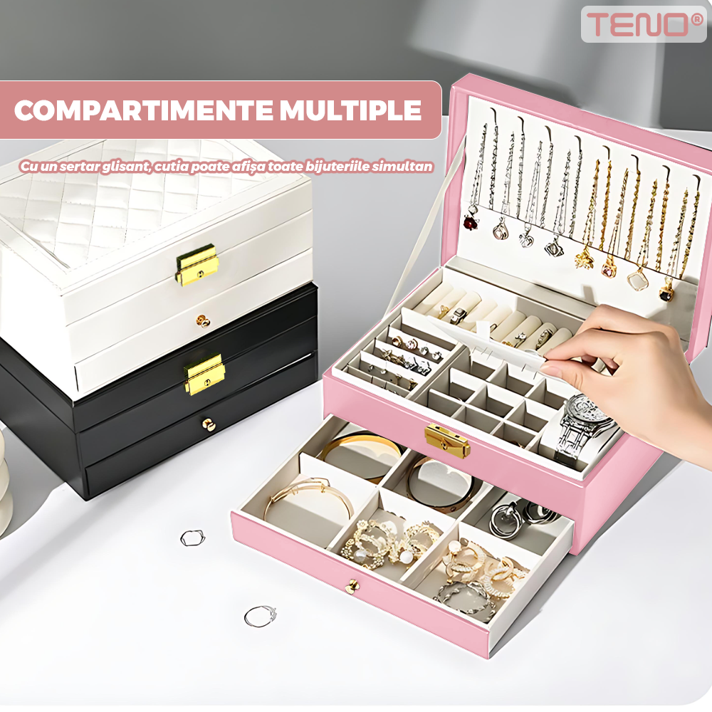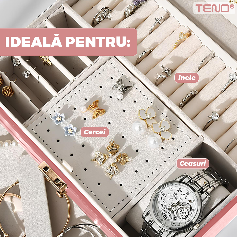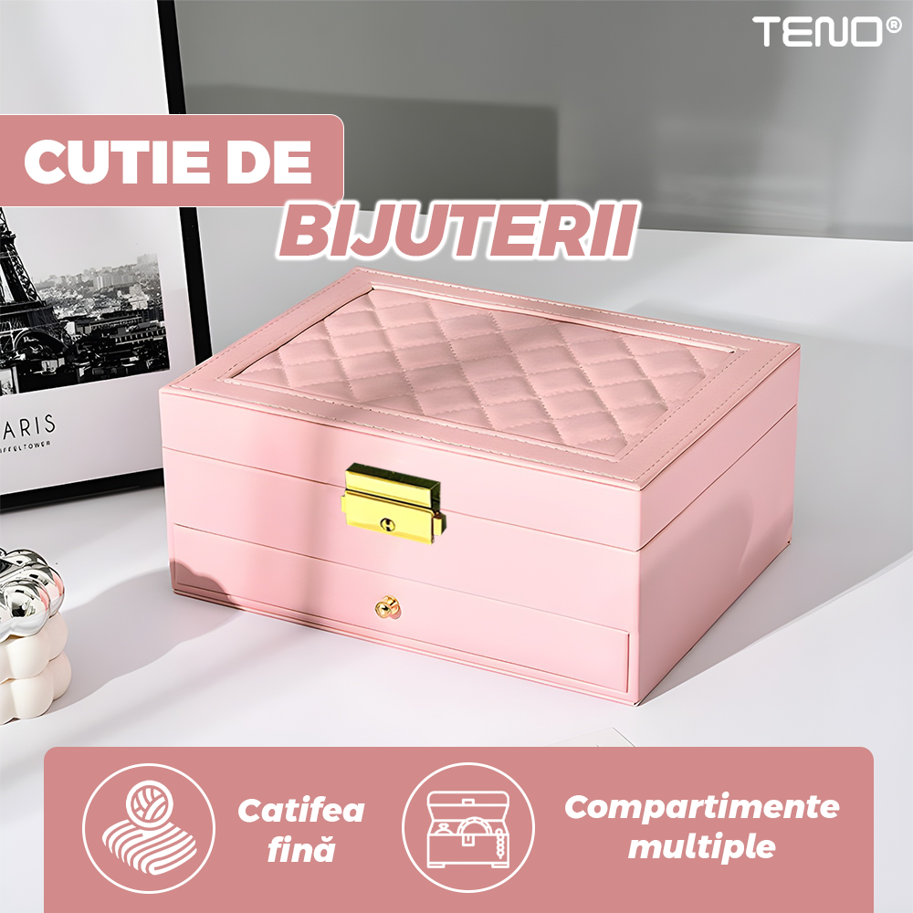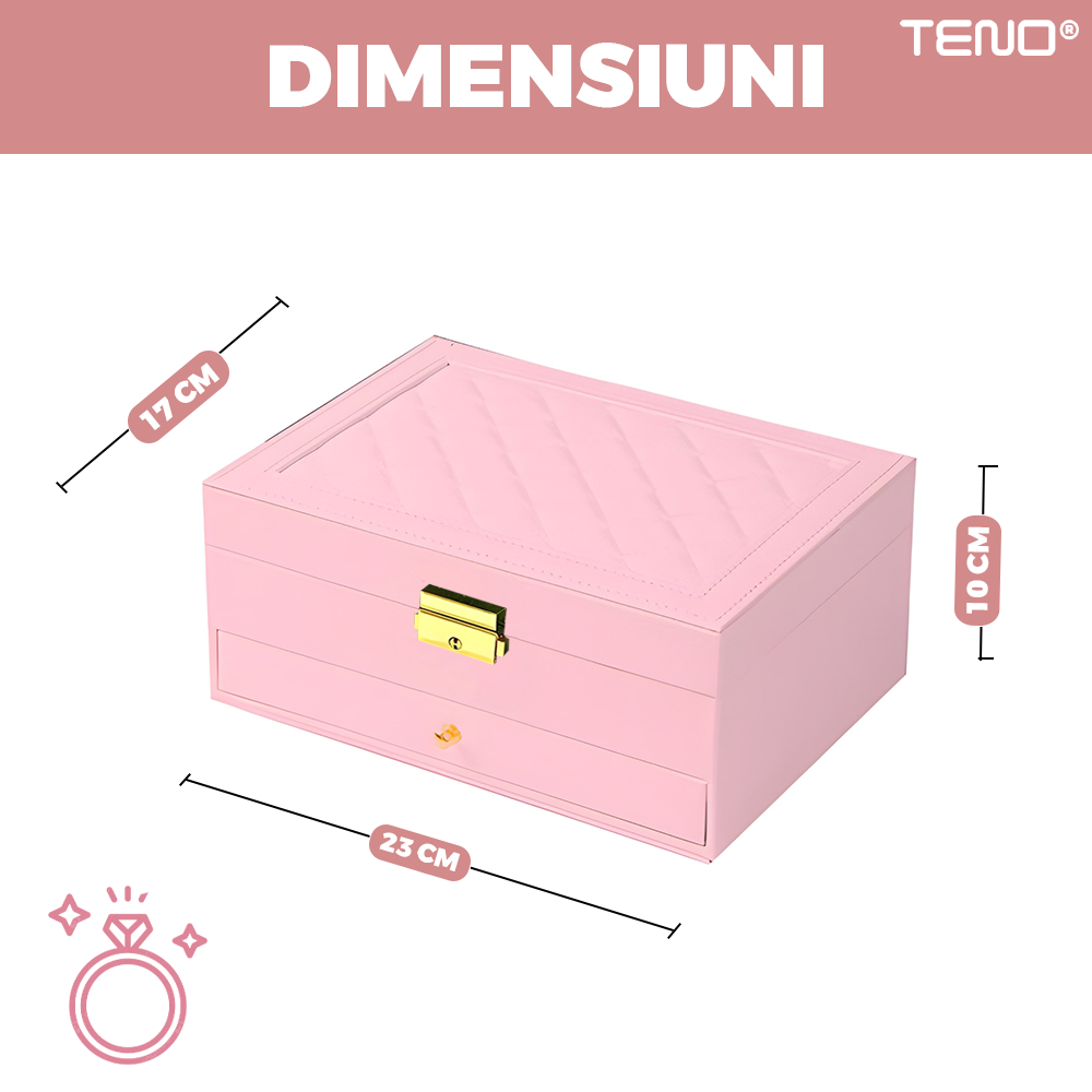 Cutie pentru Bijuterii Teno1930, organizare si depozitare, 2 compartimente, captuseala fina, compartimente inele, bratari, lantisoare, ceasuri, compartiment secret, 23 x 10 x 17 cm, roz