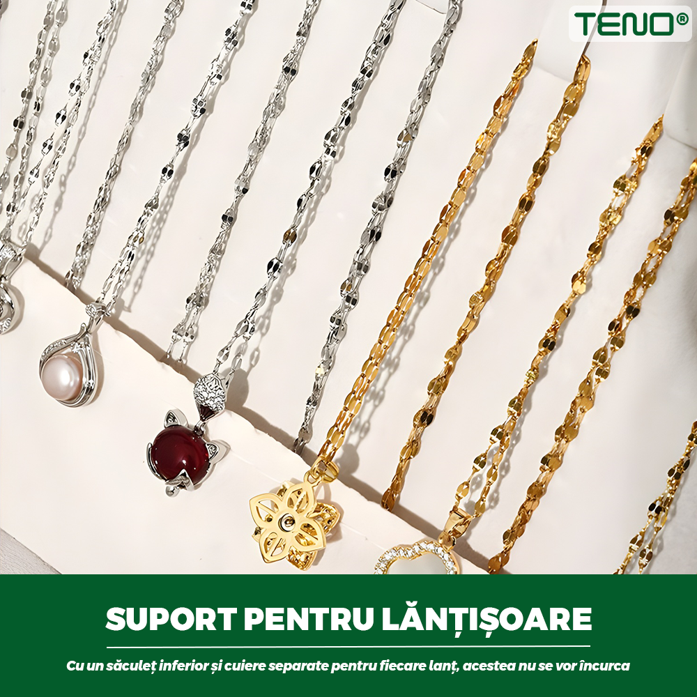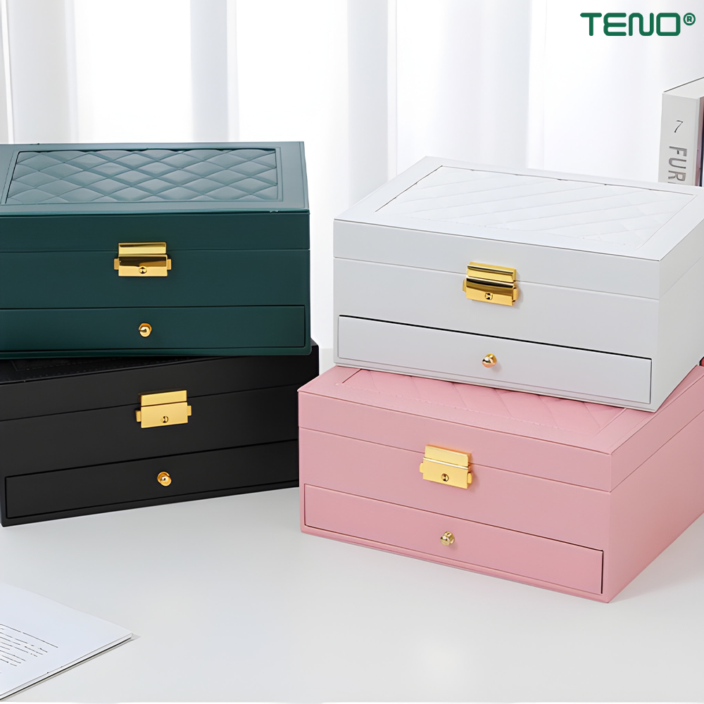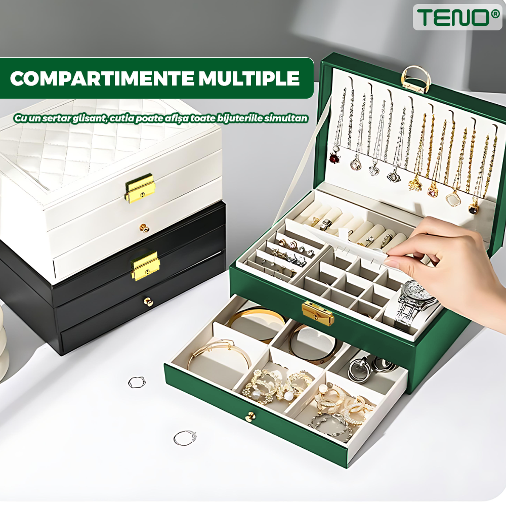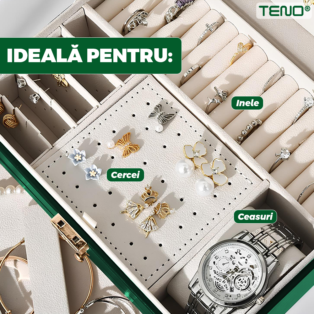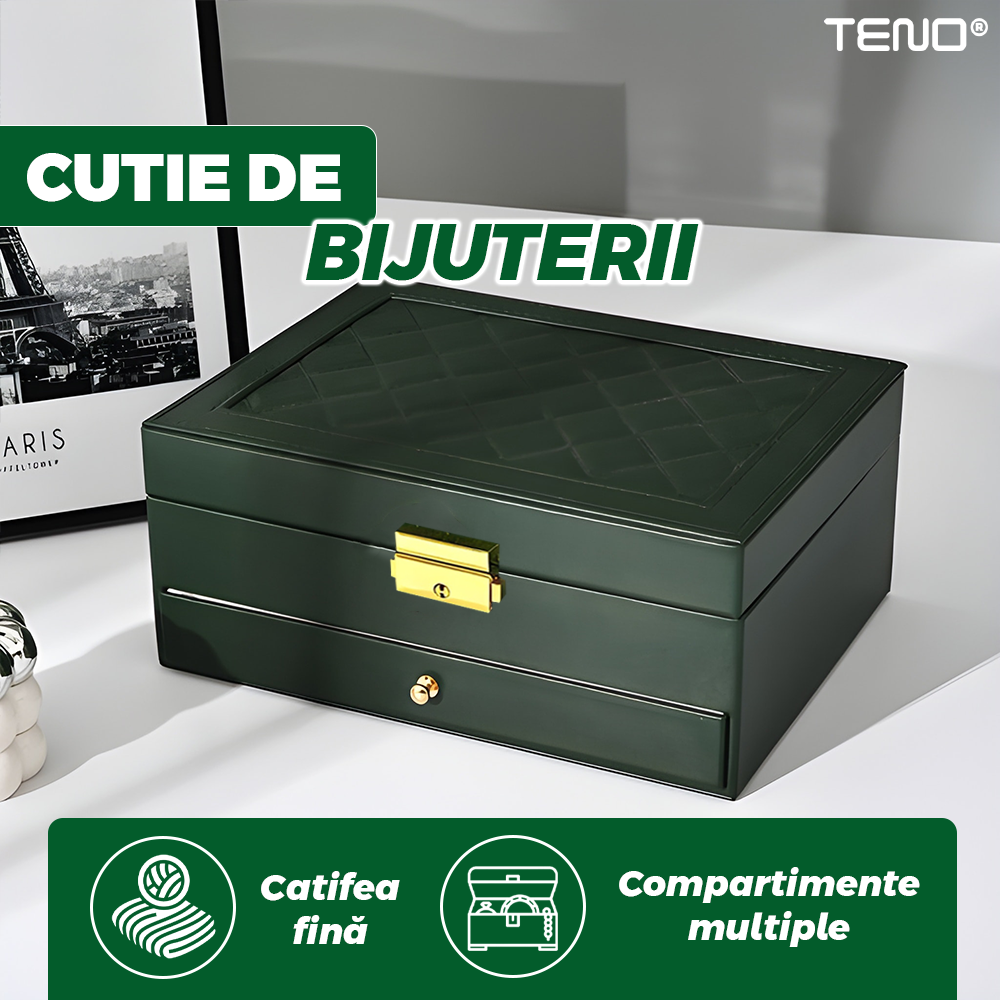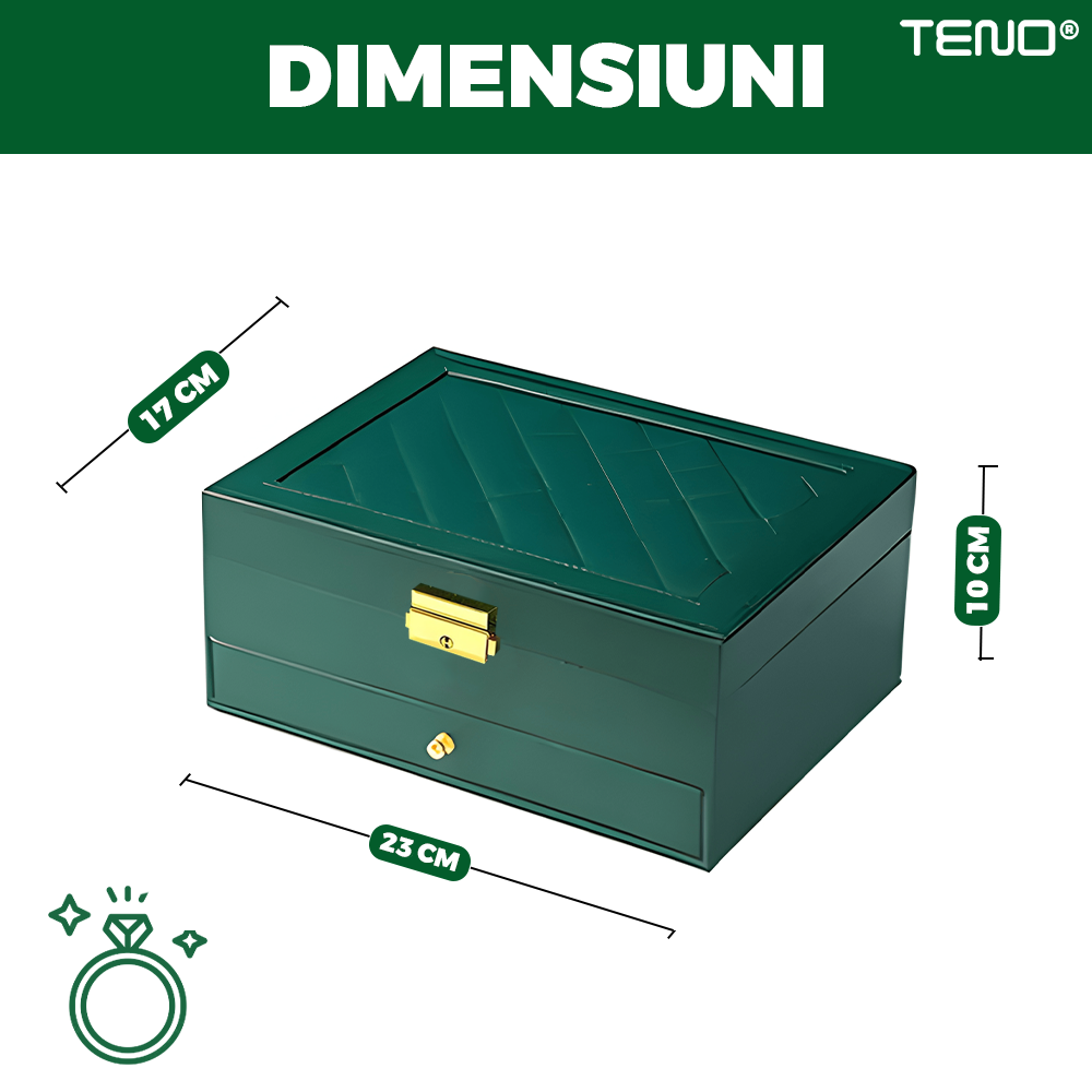 Cutie pentru Bijuterii Teno1931, organizare si depozitare, 2 compartimente, captuseala fina, compartimente inele, bratari, lantisoare, ceasuri, compartiment secret, 23 x 10 x 17 cm, verde