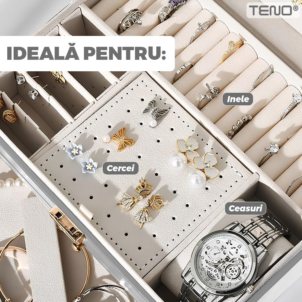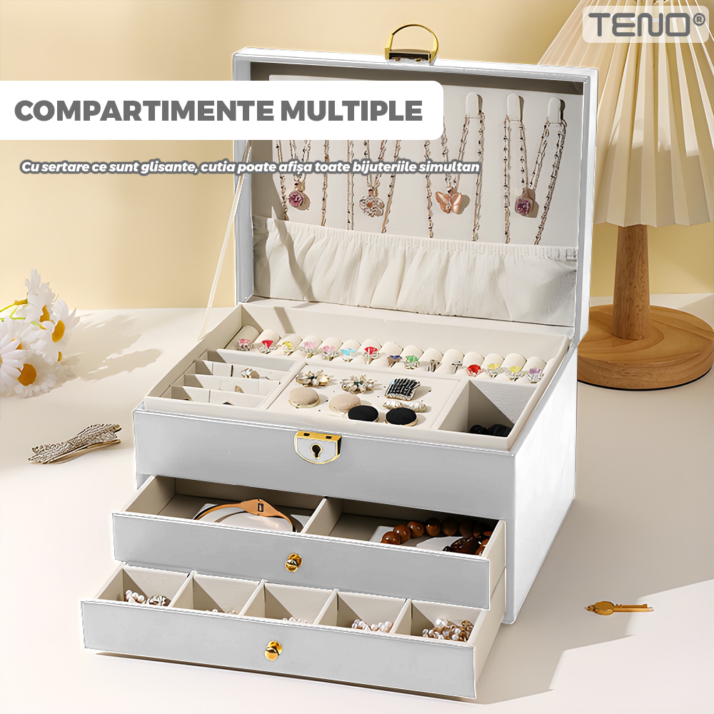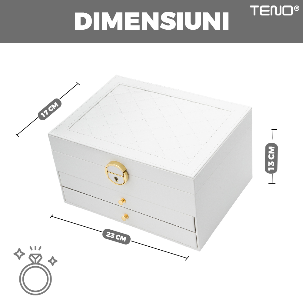 Cutie pentru Bijuterii Teno1933, organizare si depozitare, 3 compartimente, captuseala fina, compartimente inele, bratari, lantisoare, ceasuri, compartiment secret, 23 x 17 x 13 cm, alb