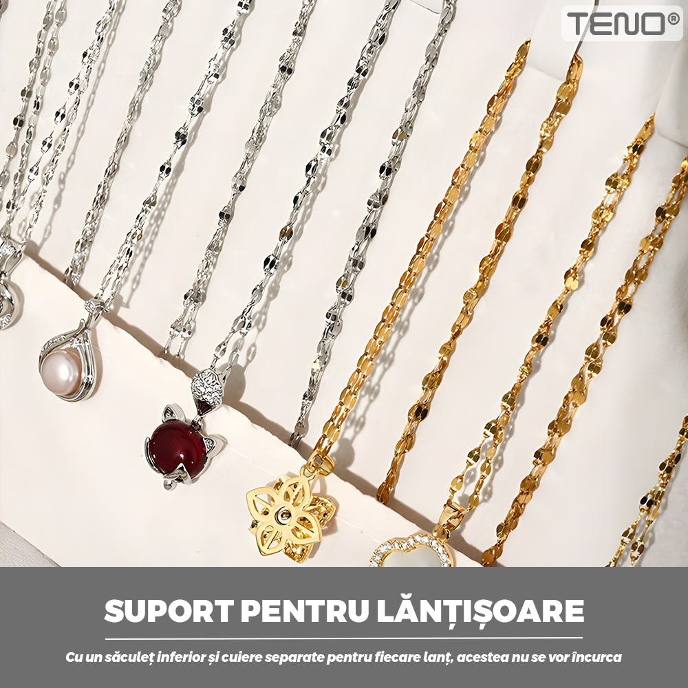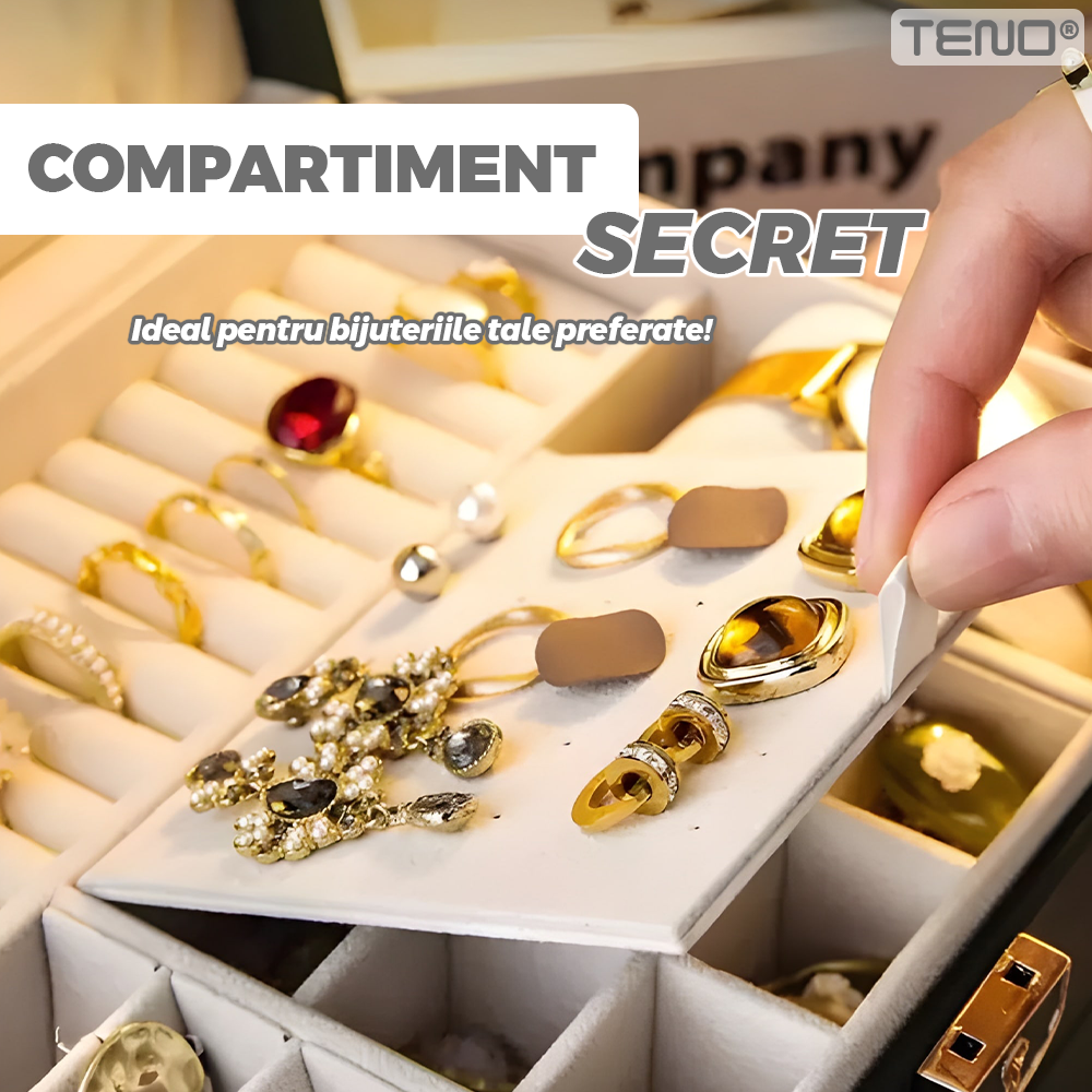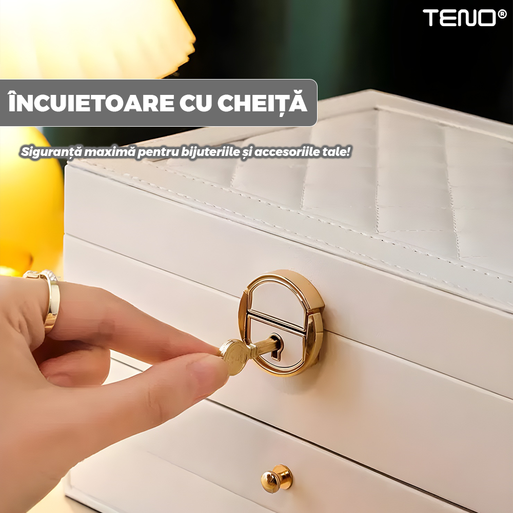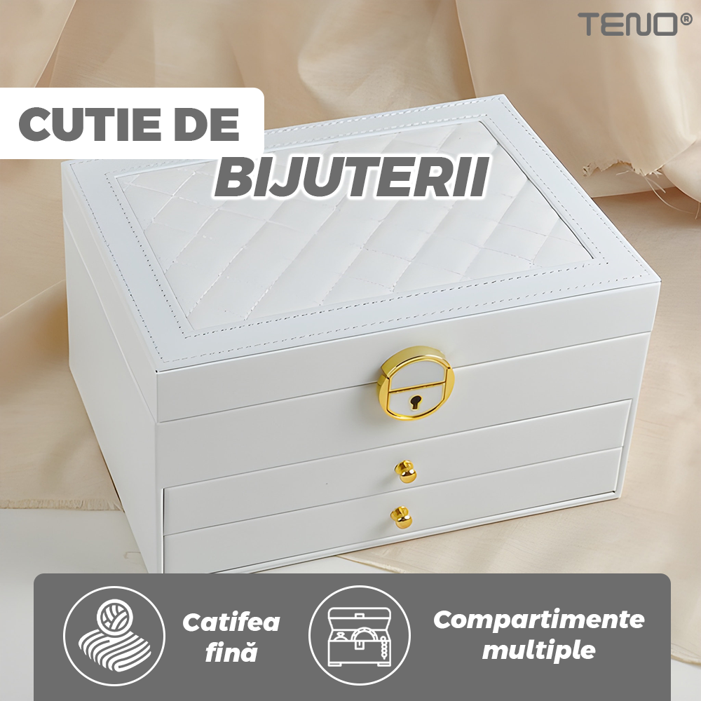 Cutie pentru Bijuterii Teno1933, organizare si depozitare, 3 compartimente, captuseala fina, compartimente inele, bratari, lantisoare, ceasuri, compartiment secret, 23 x 17 x 13 cm, alb