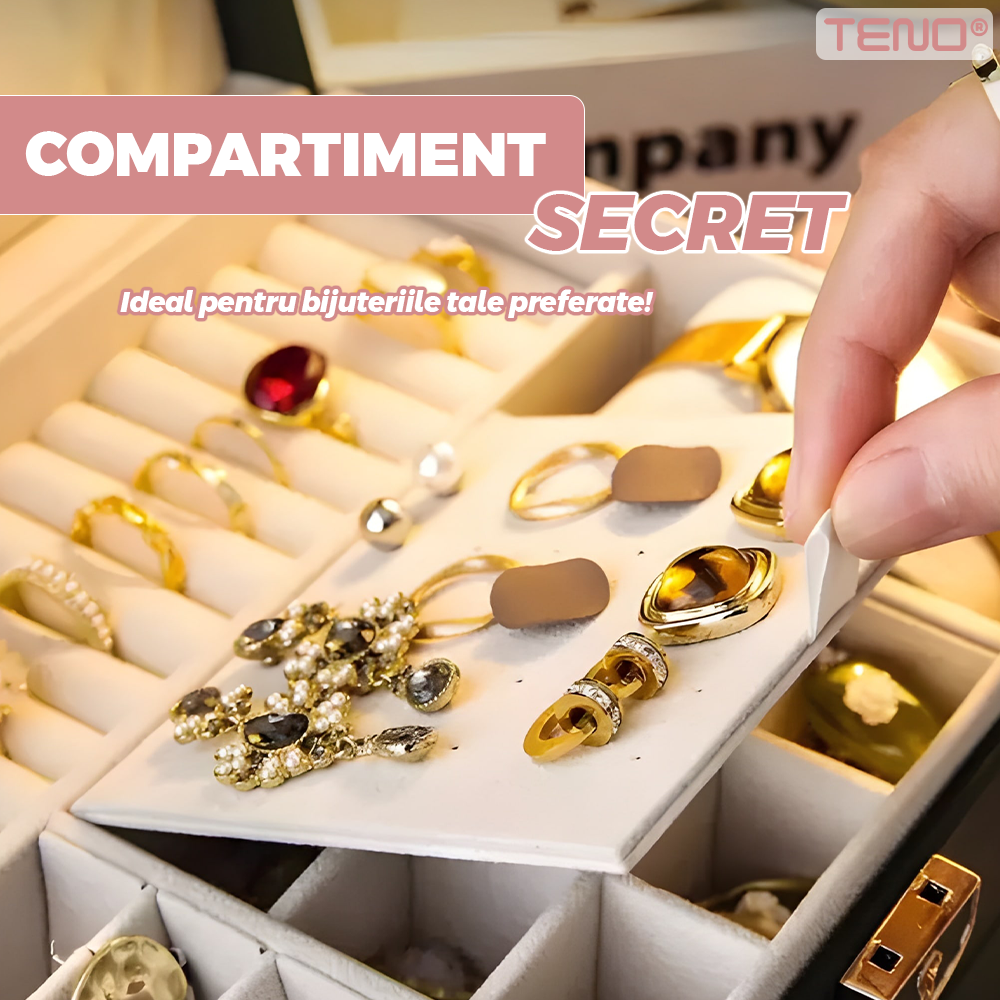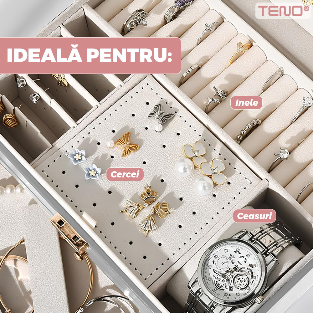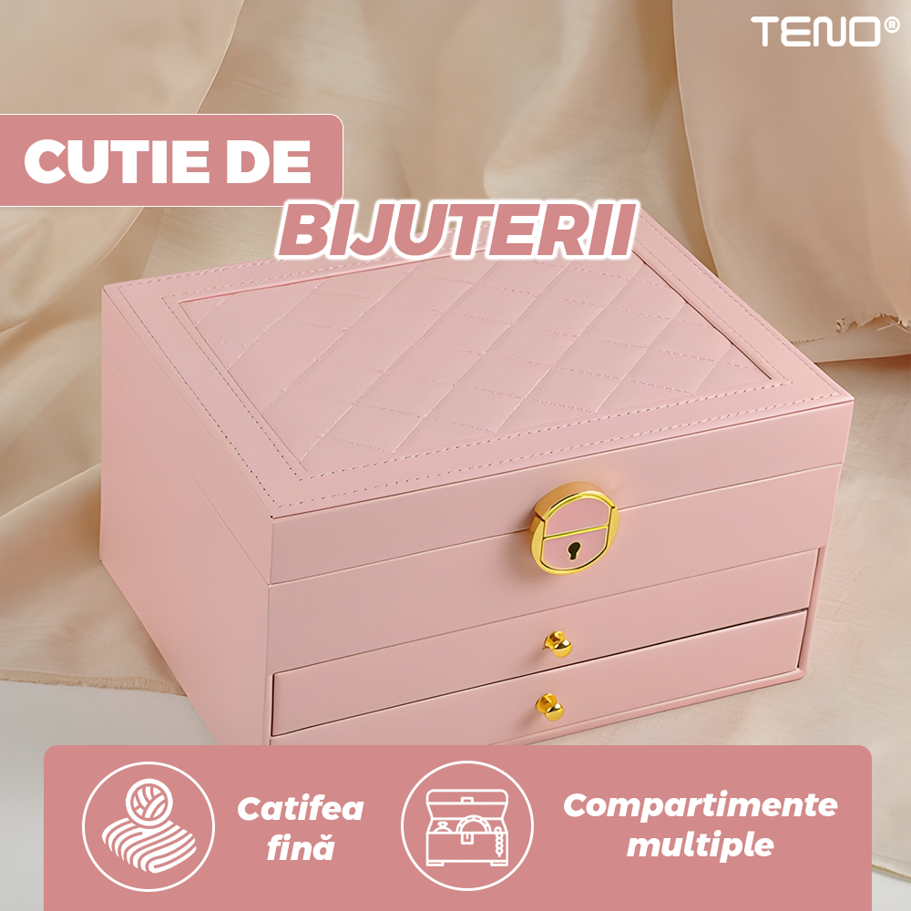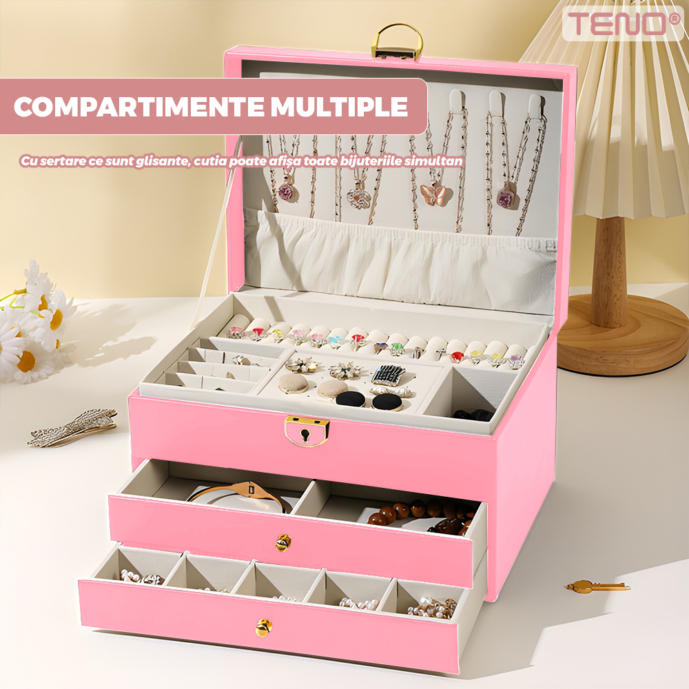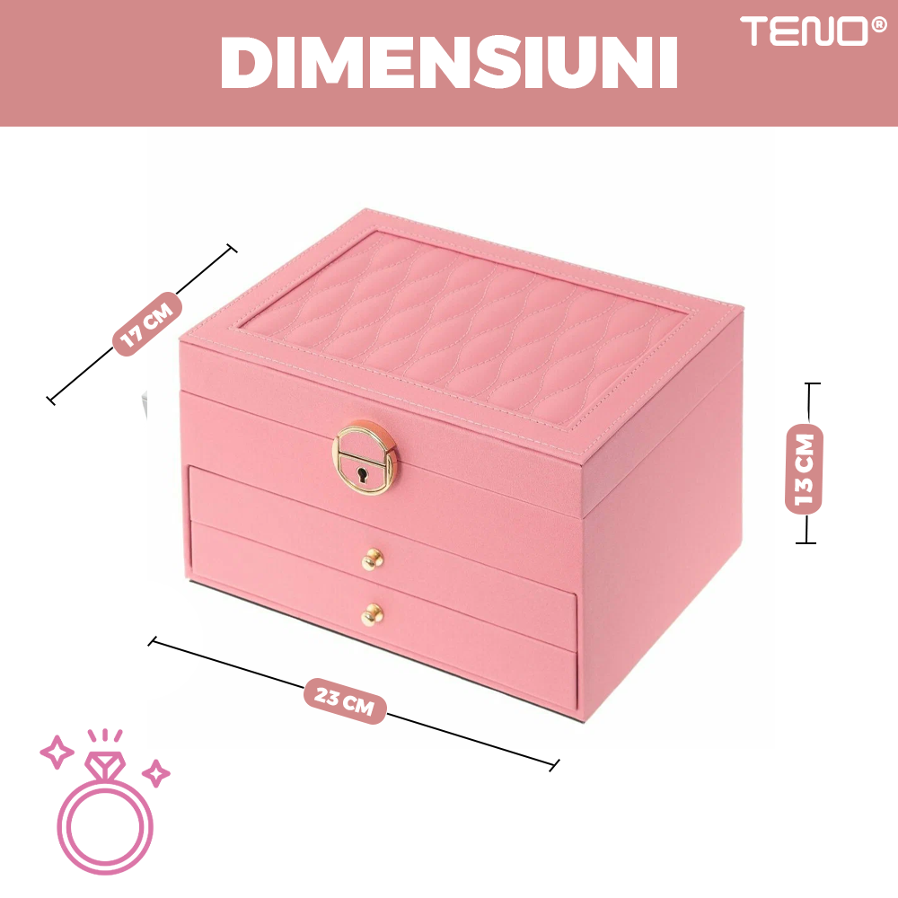 Cutie pentru Bijuterii Teno1934, organizare si depozitare, 3 compartimente, captuseala fina, compartimente inele, bratari, lantisoare, ceasuri, compartiment secret, 23 x 17 x 13 cm, roz