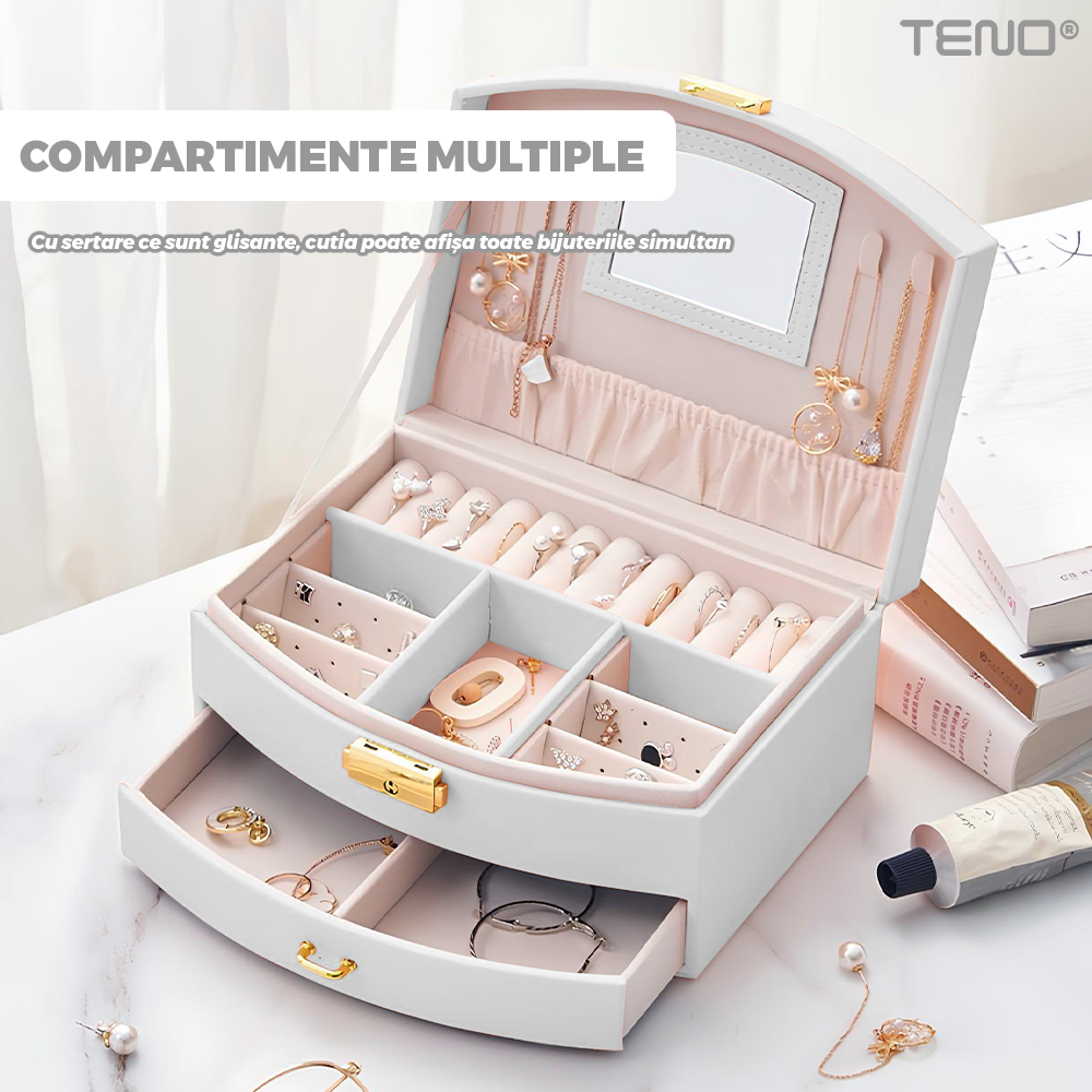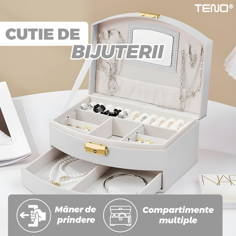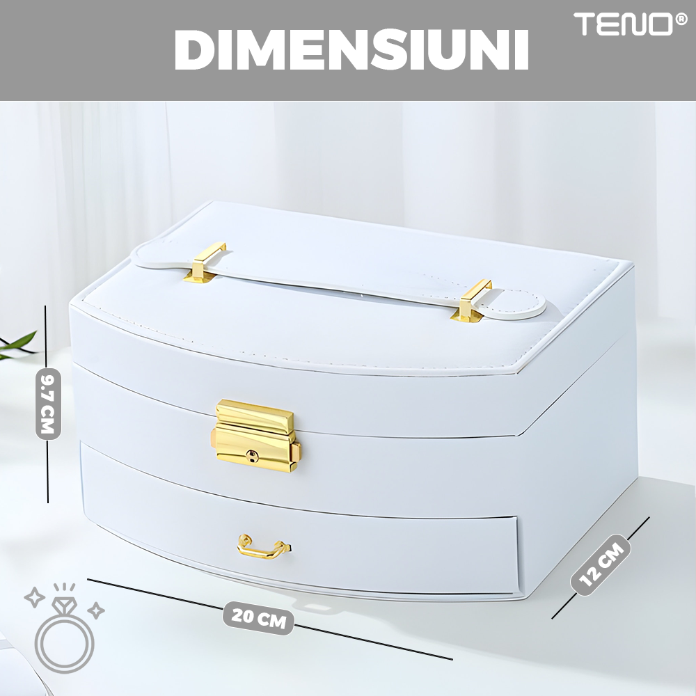 Cutie pentru Bijuterii Teno1938, tip geanta, organizare si depozitare, 2 compartimente, captuseala fina, maner de prindere, compartimente inele, bratari, lantisoare, ceasuri, 20 x 12 x 9.7 cm, alb