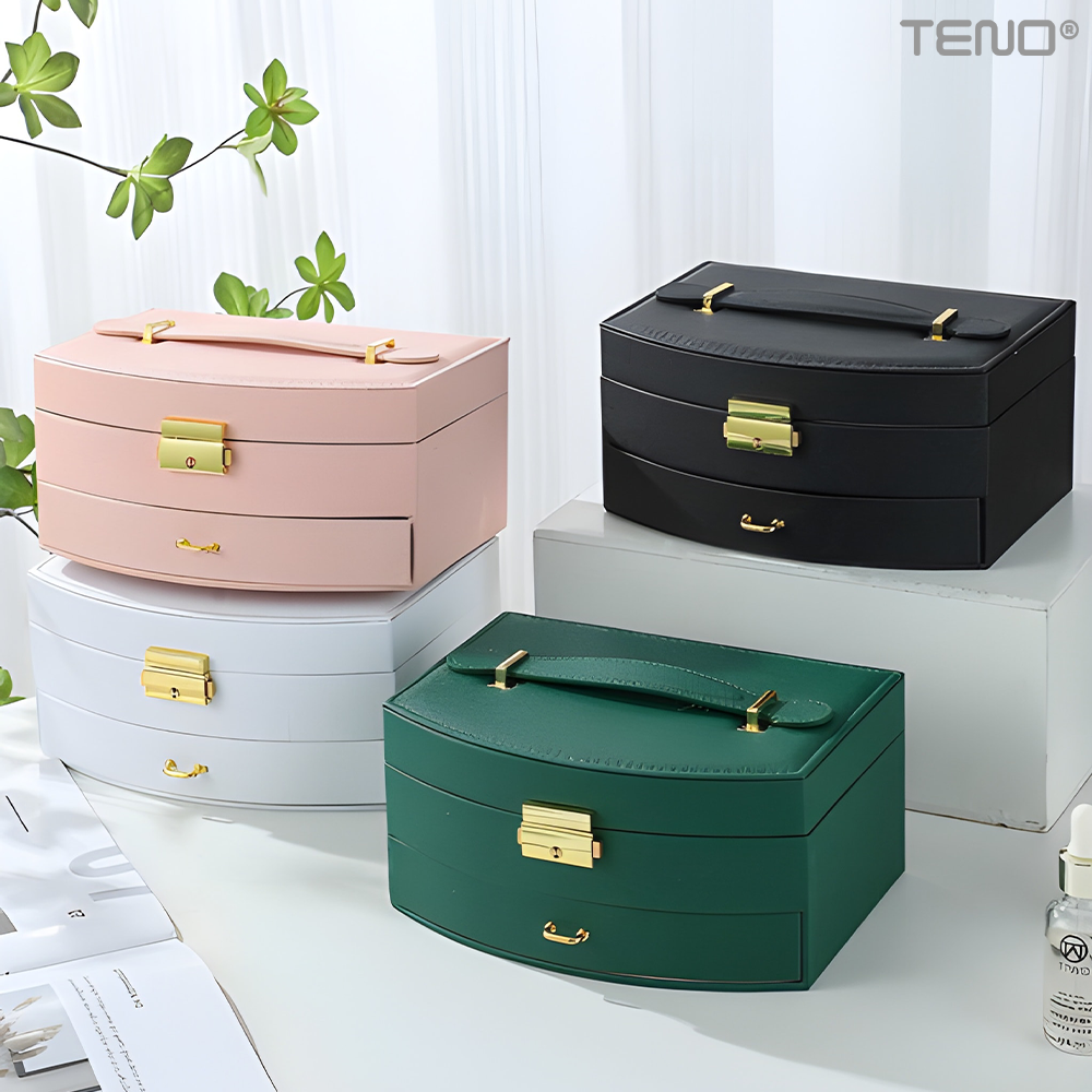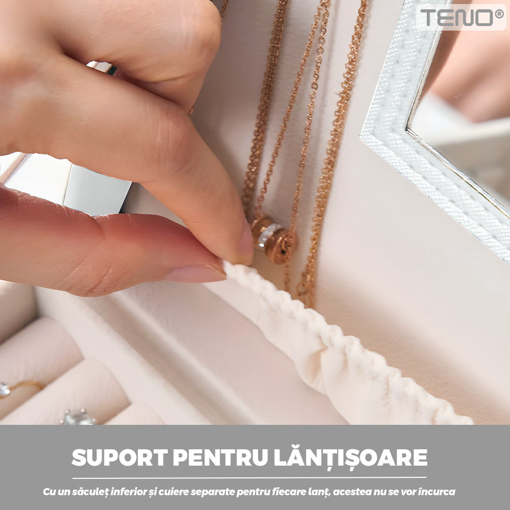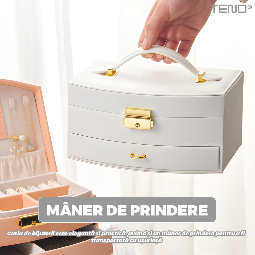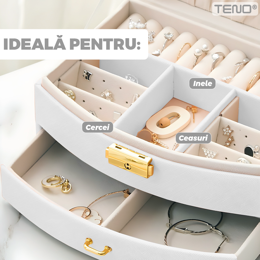 Cutie pentru Bijuterii Teno1938, tip geanta, organizare si depozitare, 2 compartimente, captuseala fina, maner de prindere, compartimente inele, bratari, lantisoare, ceasuri, 20 x 12 x 9.7 cm, alb