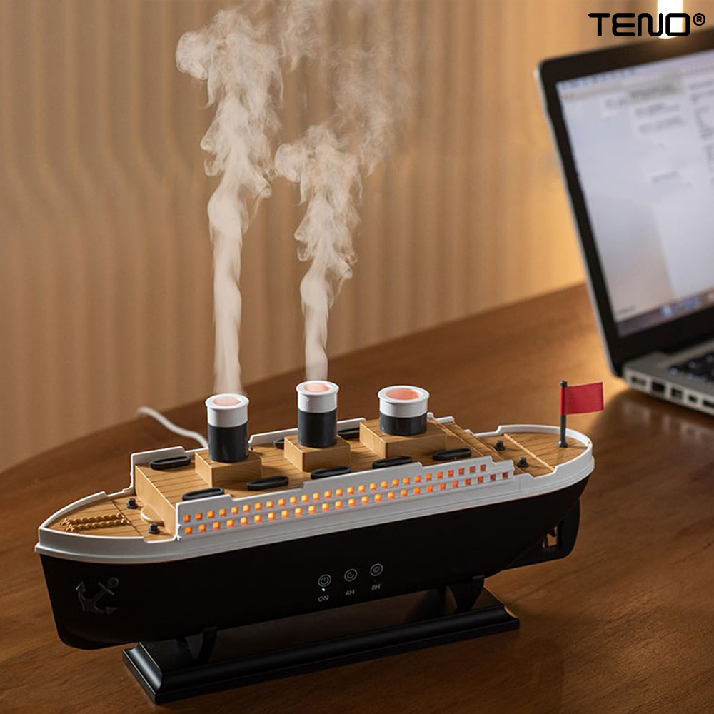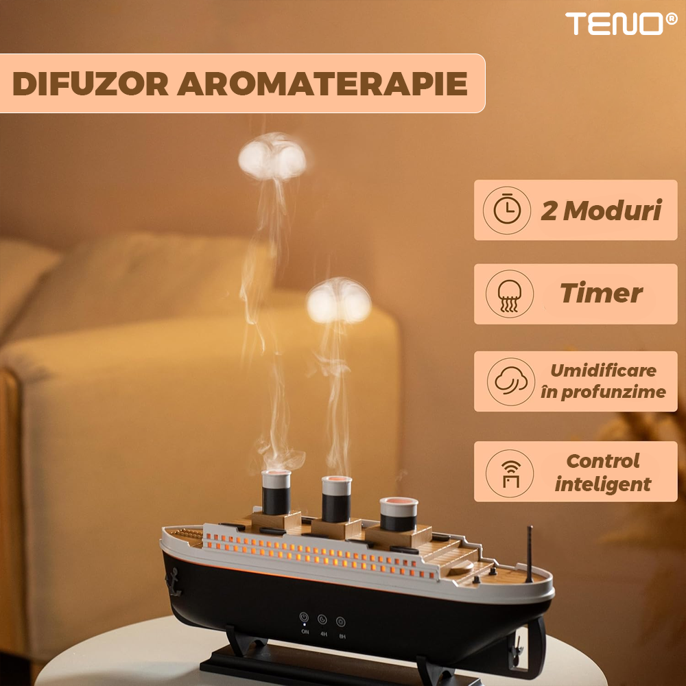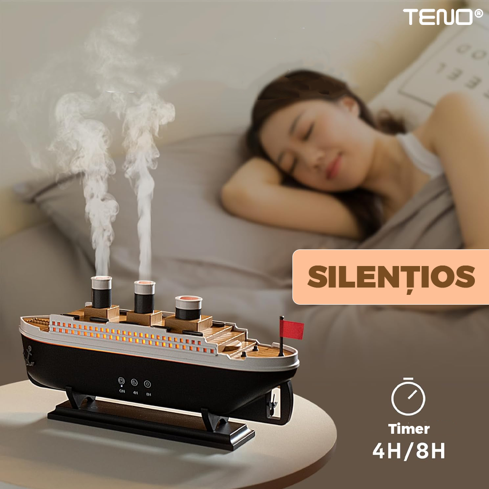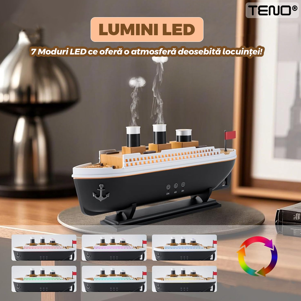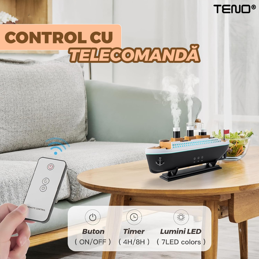 Difuzor Aromaterapie Teno2173, forma de nava de croaziera, 7 culori LED, lumini dinamice, control tactil, capacitate 250ml, silentios, rezerva inclusa, umidifica aerul, negru/alb