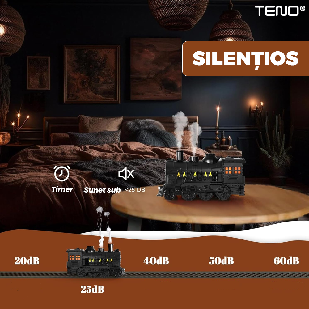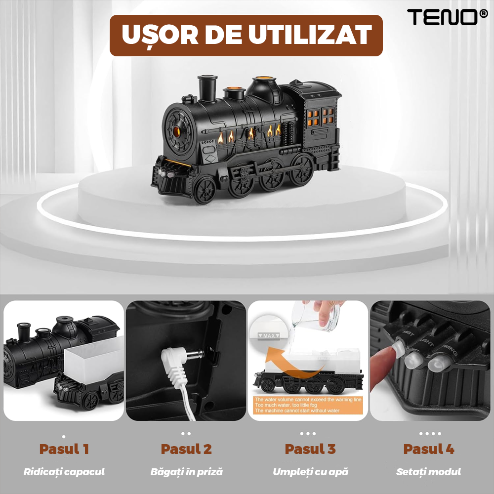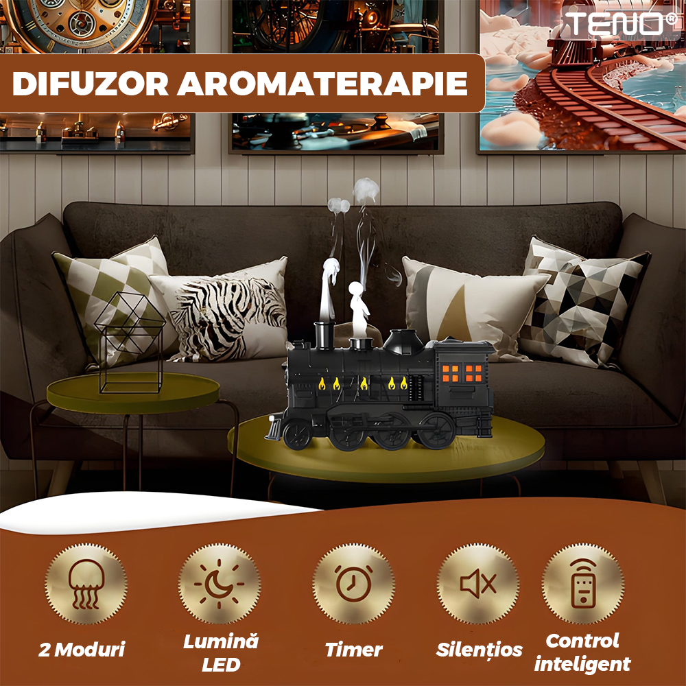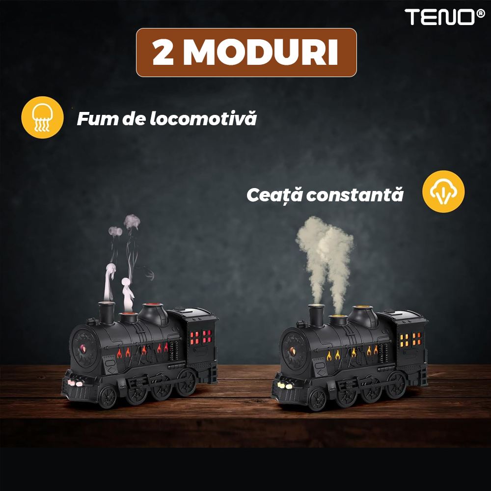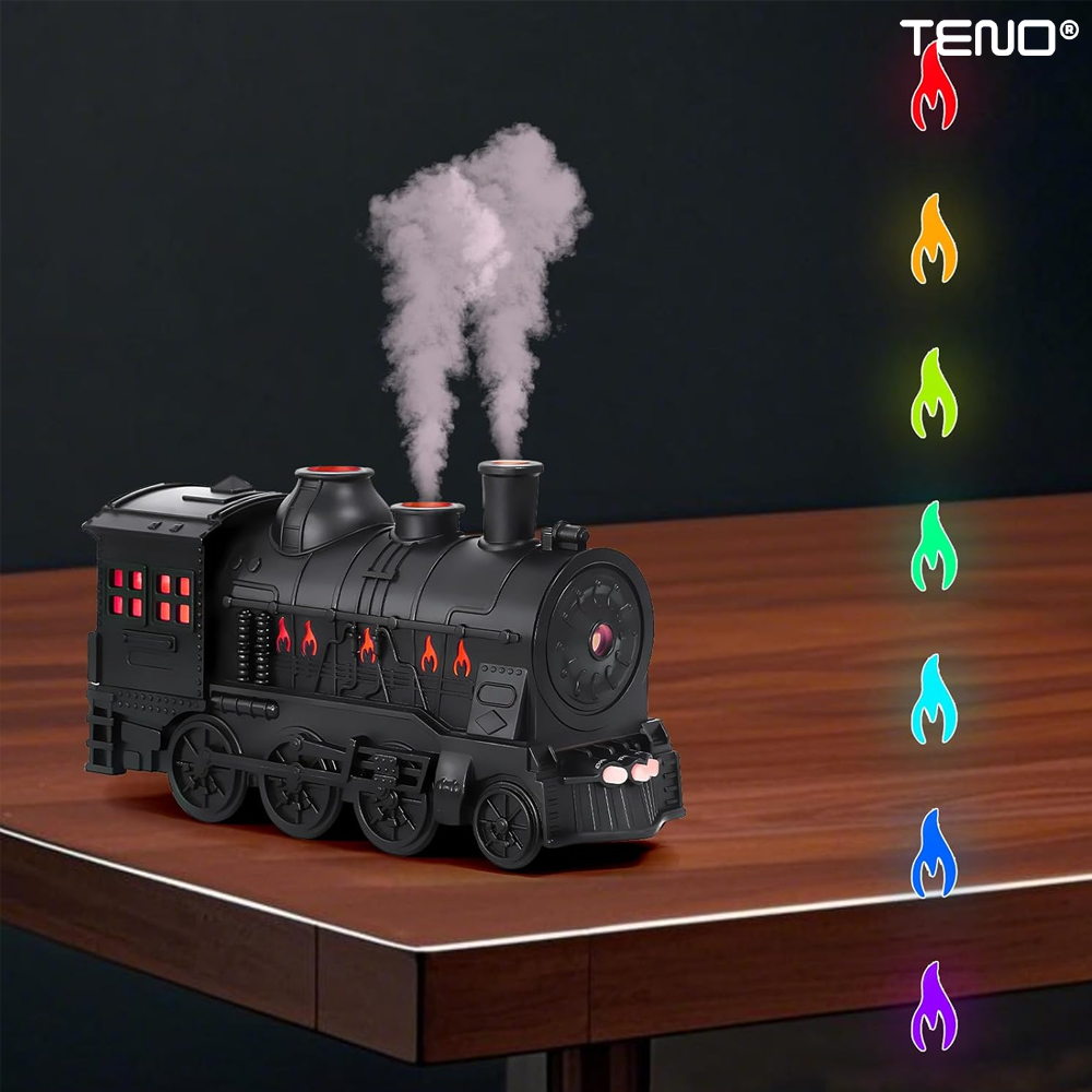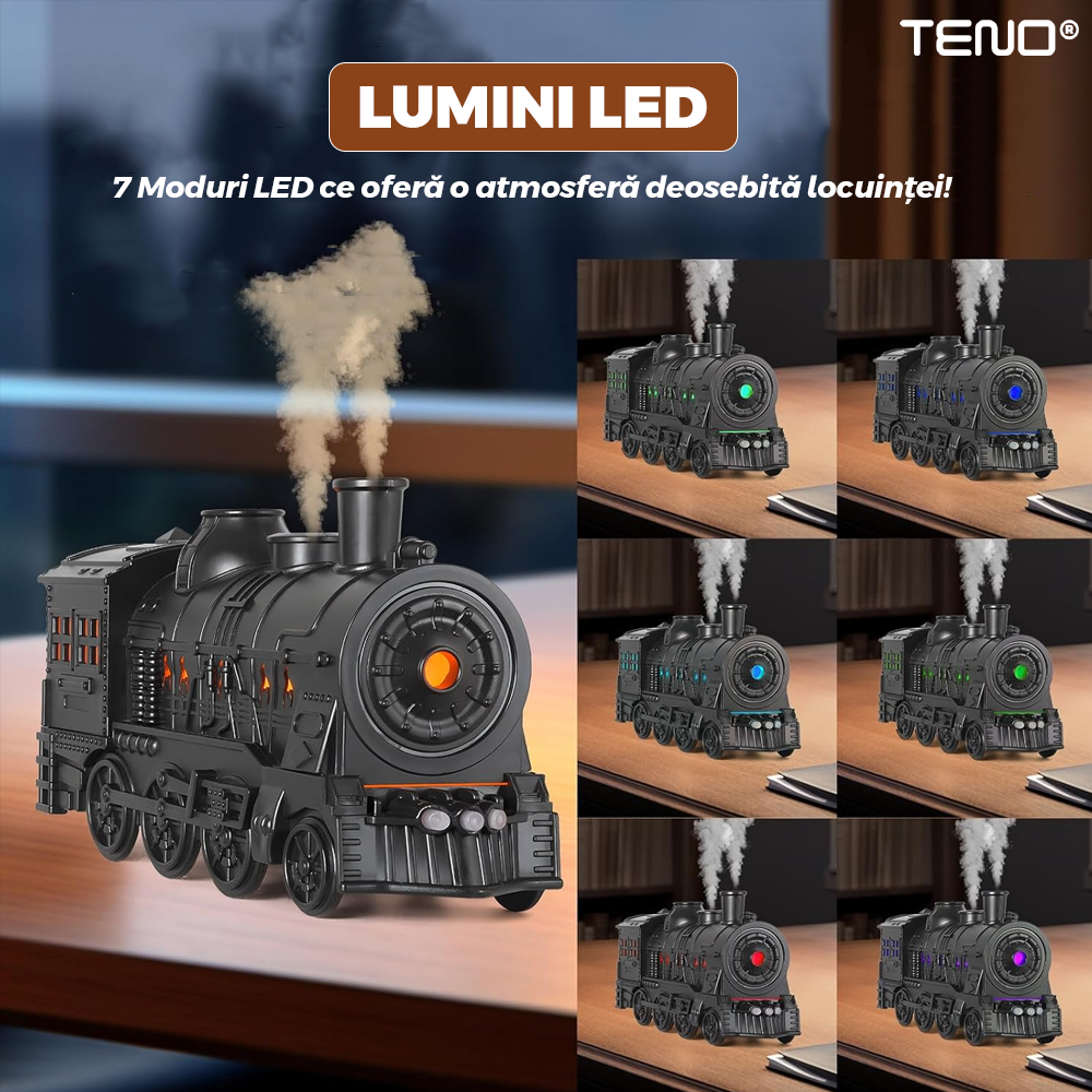 Difuzor Aromaterapie Teno2174, forma de locomotiva, culori LED, lumini dinamice, control cu butoane, 2 moduri, capacitate 300ml, silentios, umidifica aerul, negru