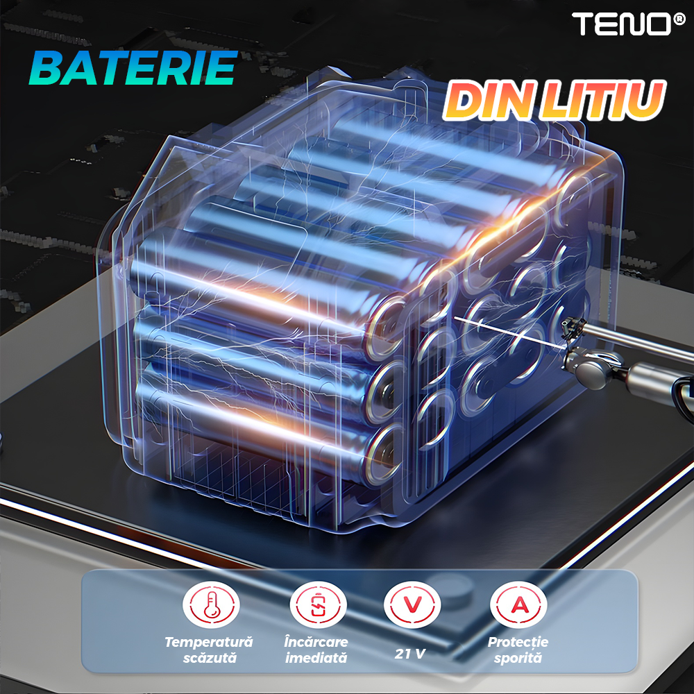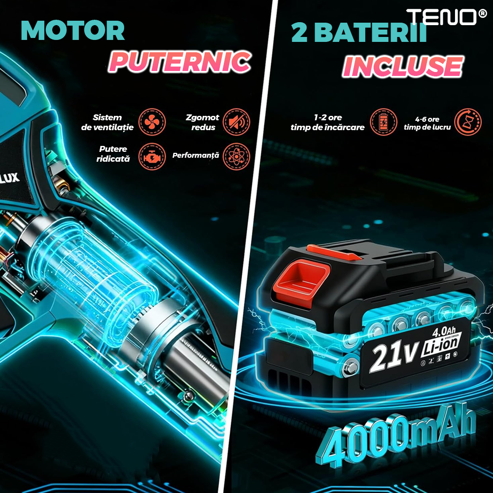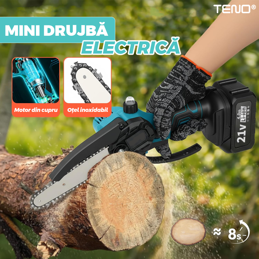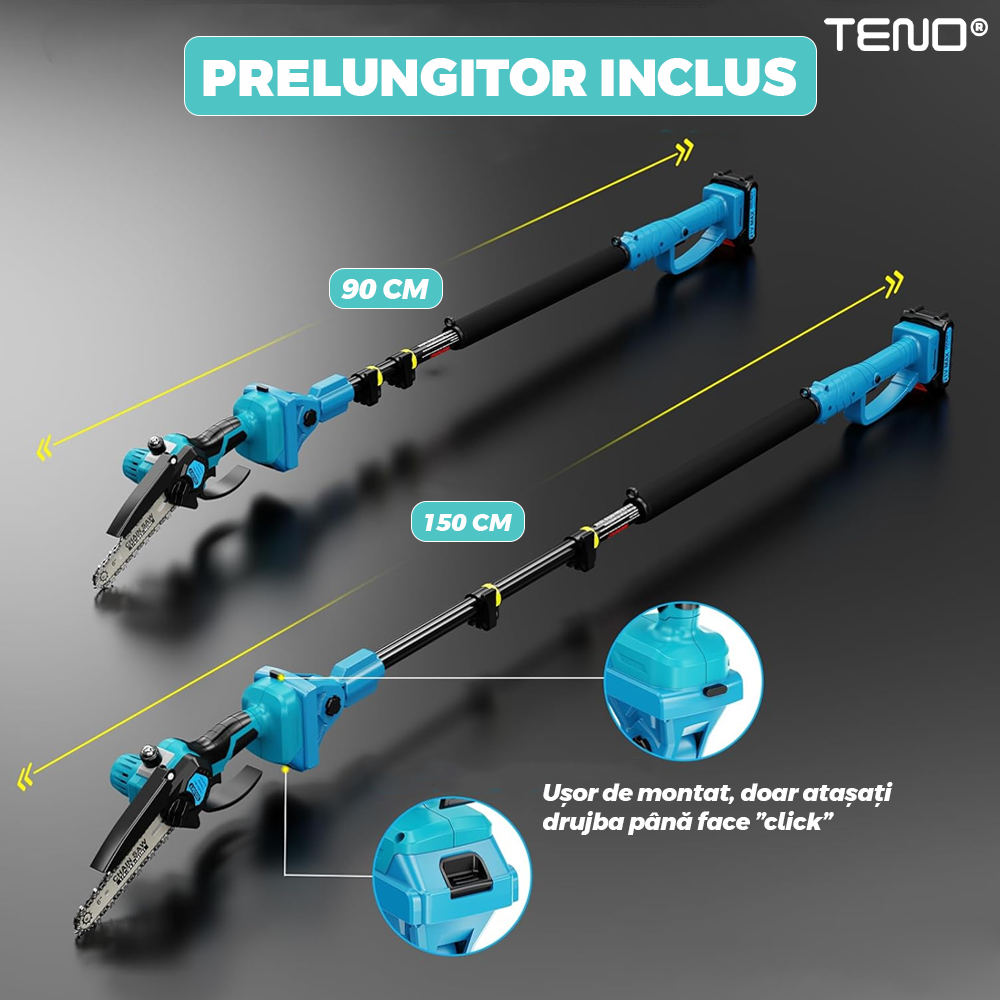 Drujba Electrica Portabila Fara Fir Teno2565, lant puternic, autonomie ridicata, 2 acumulatori de 21 V inclusi, maner reglabil telescopic, pentru taiat crengi, pomi, arbusti si alte materiale, verde