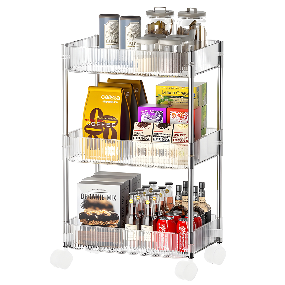 Etajera Teno2251, 3 rafturi din plastic, suport pe roti, spatioasa, robusta, pentru bucatarie/baie/camara, usor de montat, transparent