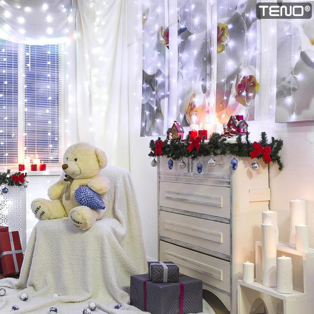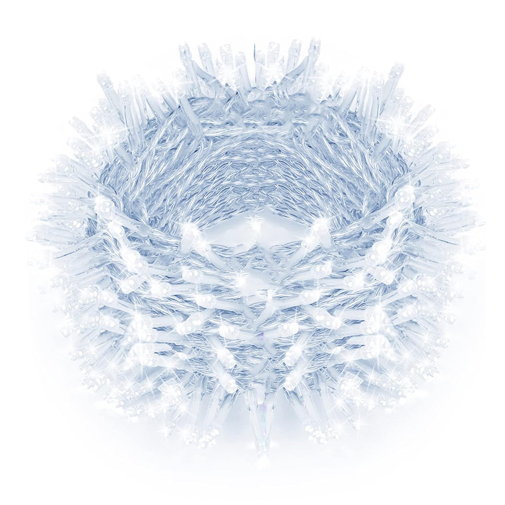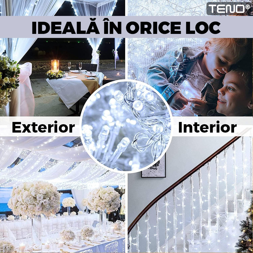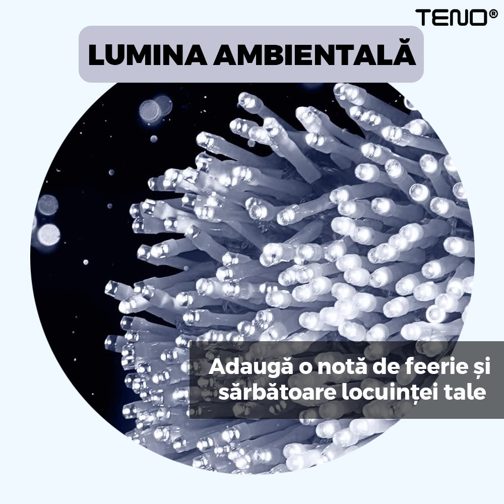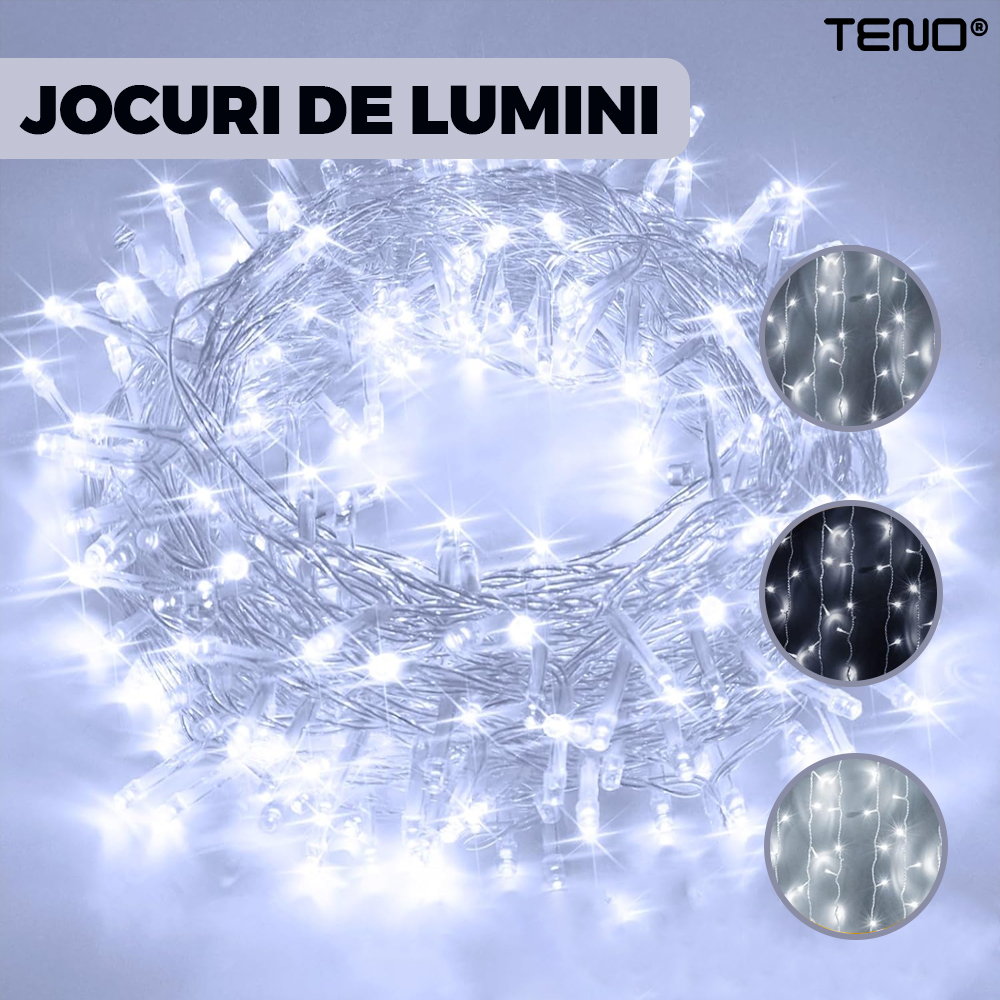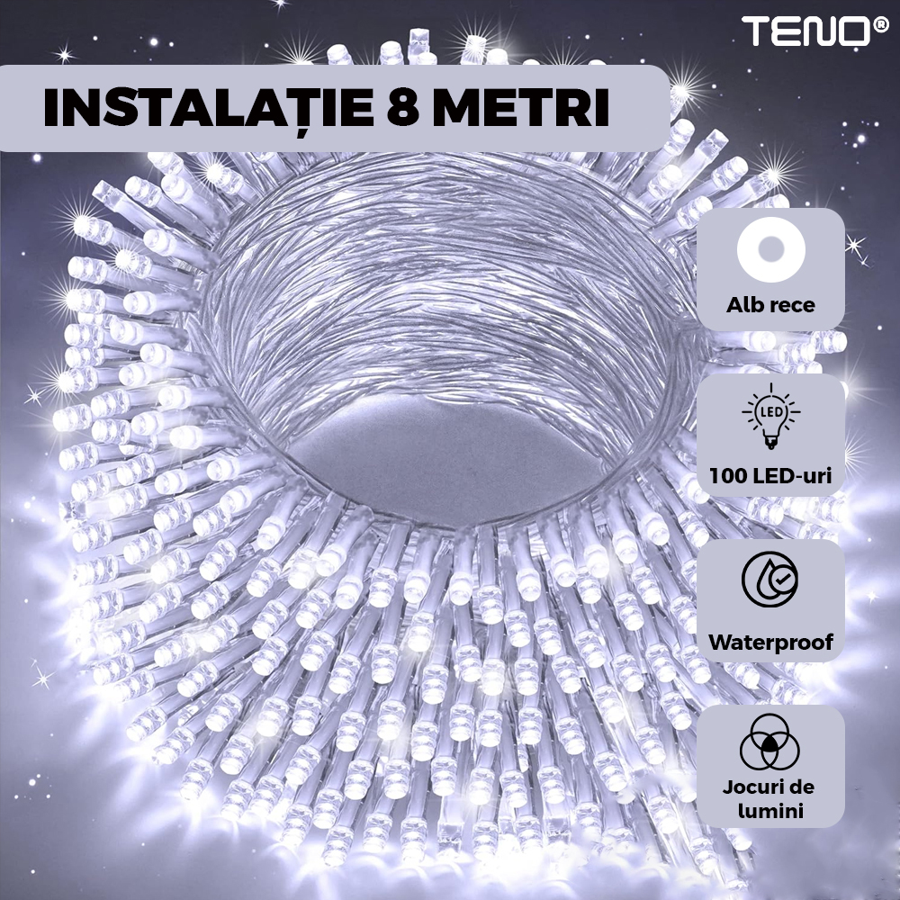 Instalatie de Craciun Liniara Teno396, 100 LED-uri, 8 jocuri de lumini, alimentare la priza, fir transparent, interior/exterior, rezistenta la apa, 8 m, alb rece