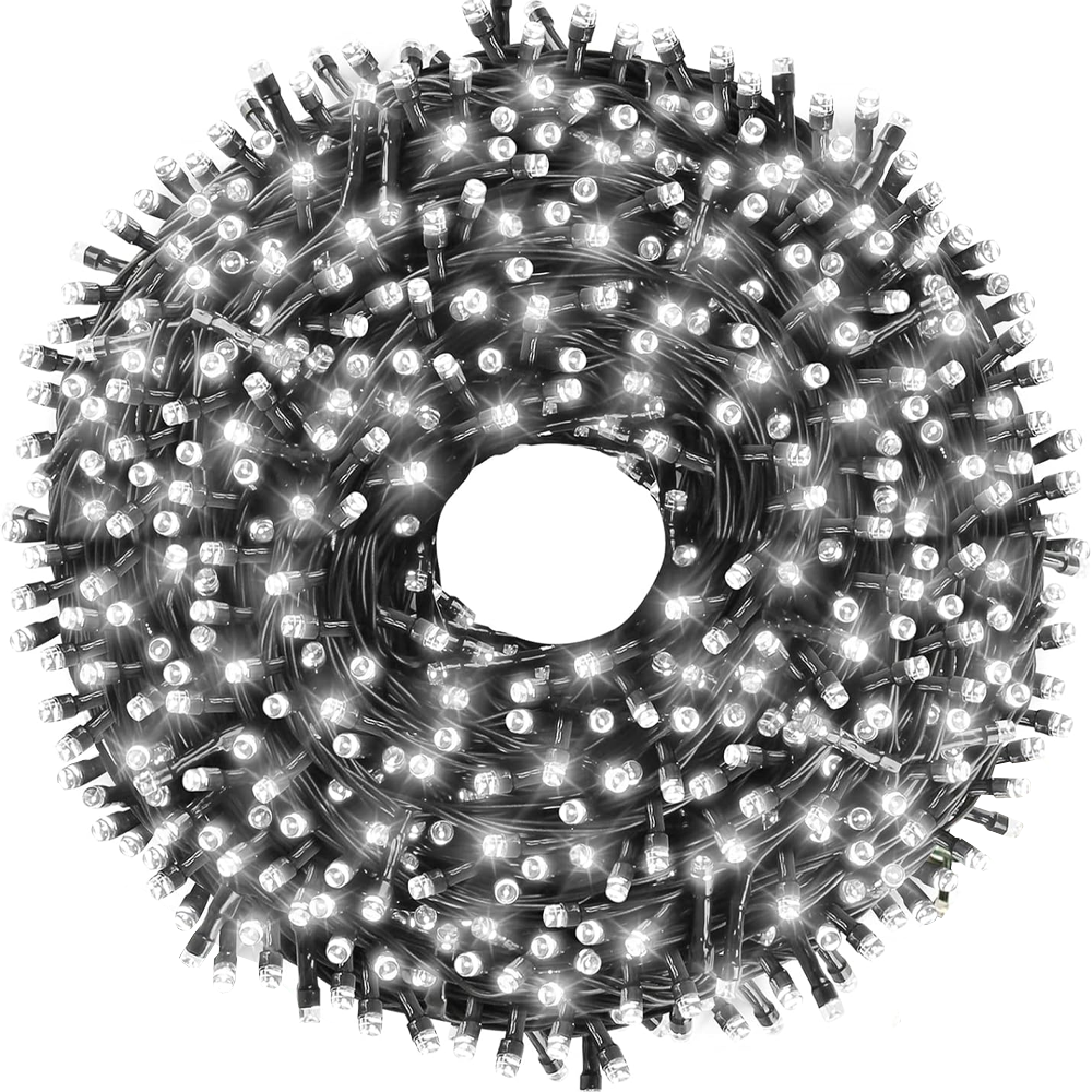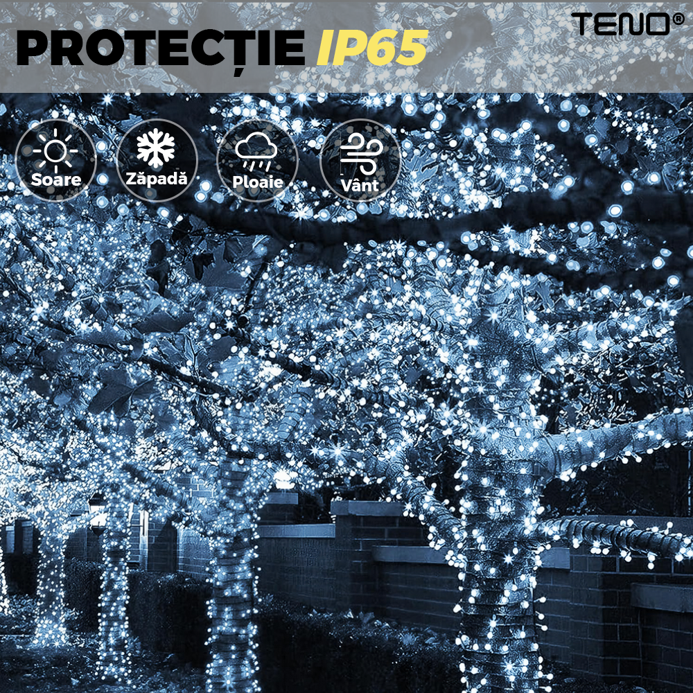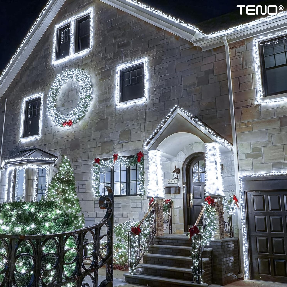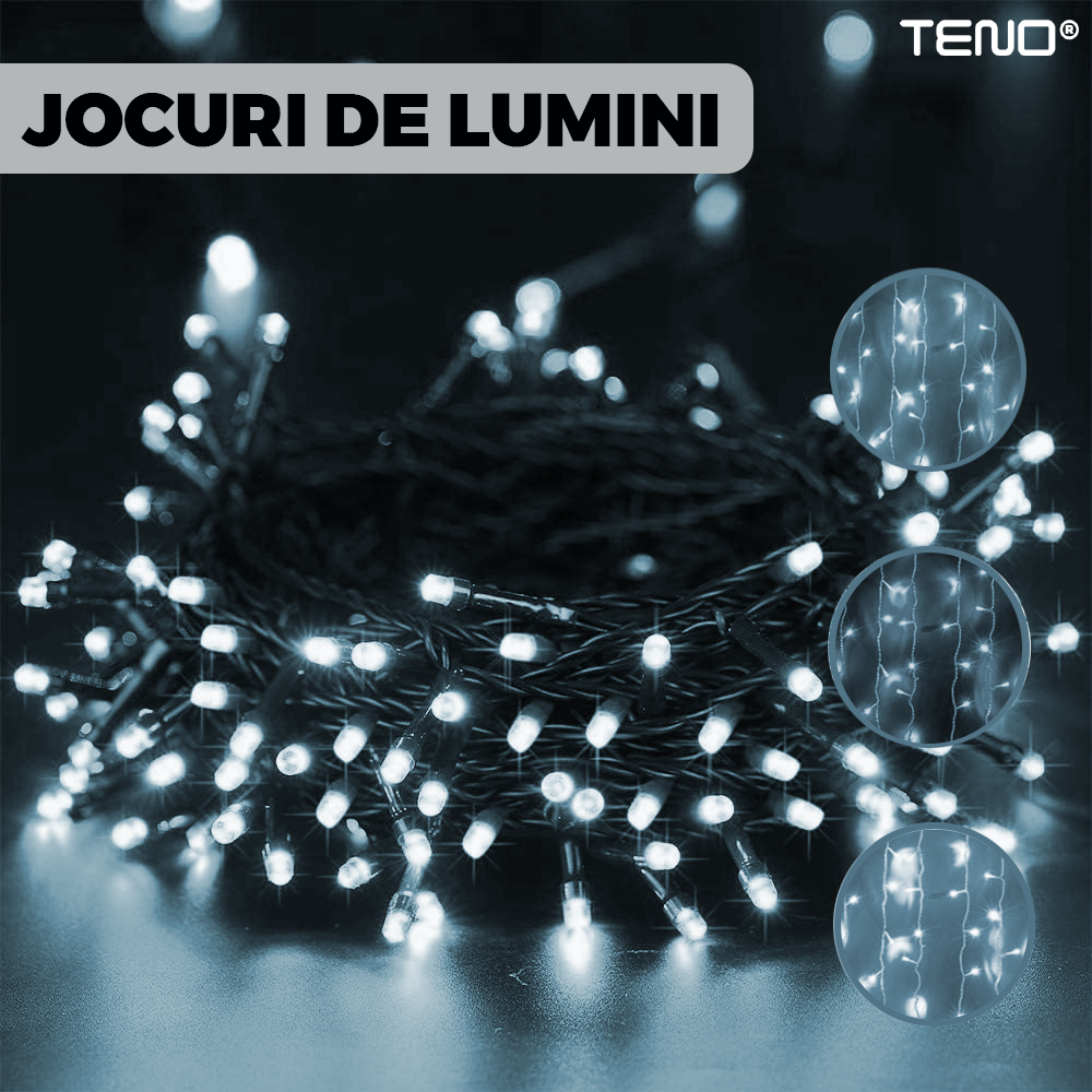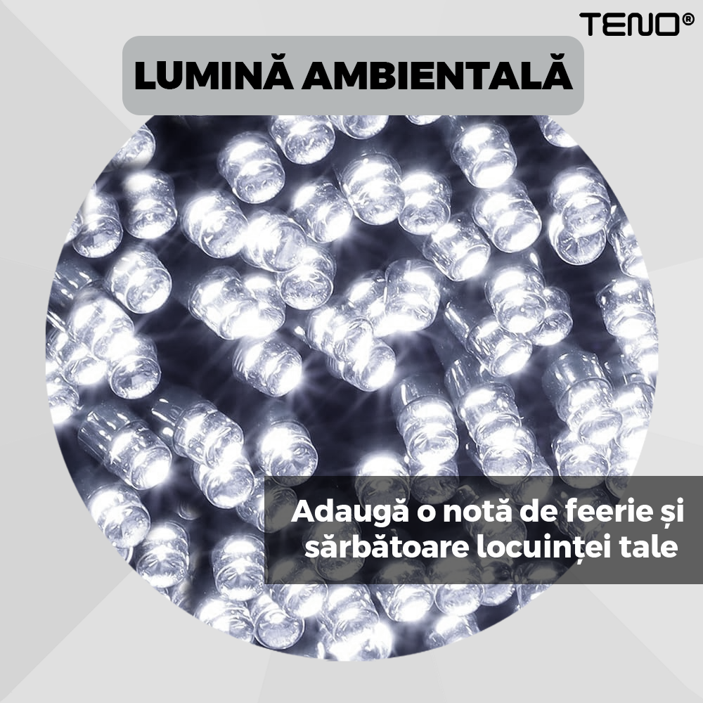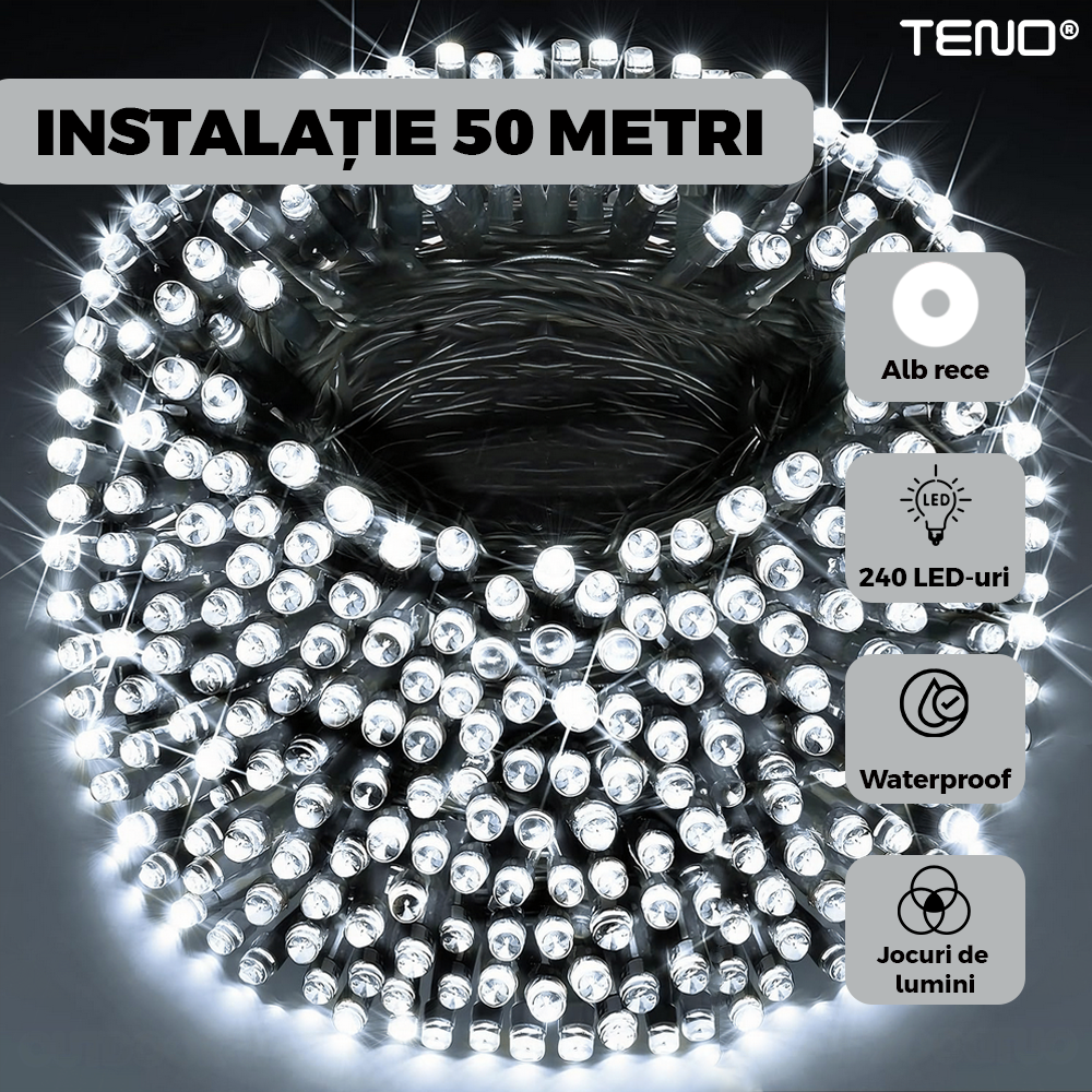 Instalatie de Craciun Liniara Teno1435, 240 LED-uri, 8 jocuri de lumini, alimentare la priza, interior/exterior, rezistenta la apa, 50 m, alb rece