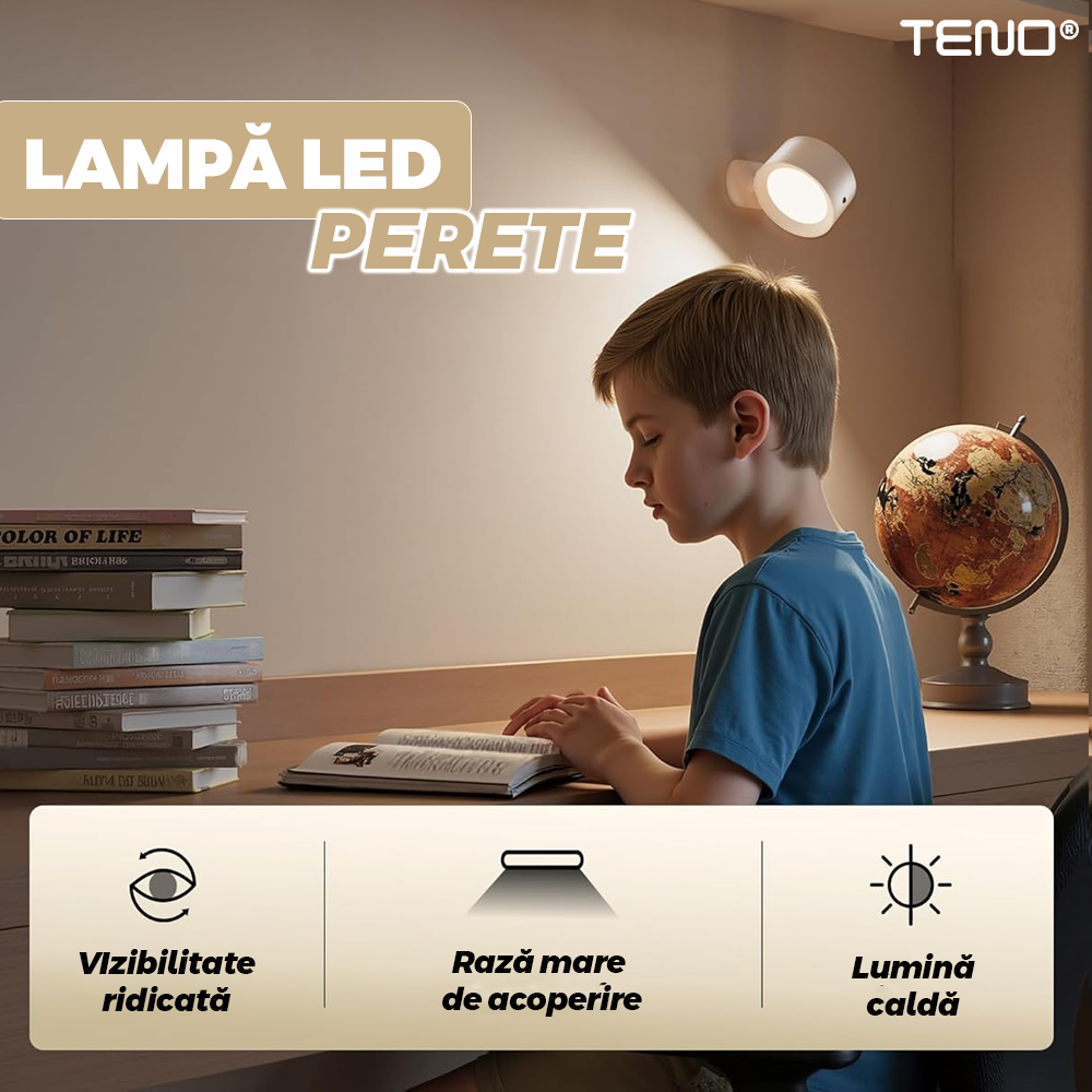Capul lampii permite o rotire completa de 360 de grade, oferindu-ti libertate totala in directionarea luminii acolo unde ai nevoie. Ideal pentru citit, lucru la birou sau pentru a crea o atmosfera ambientala placuta.