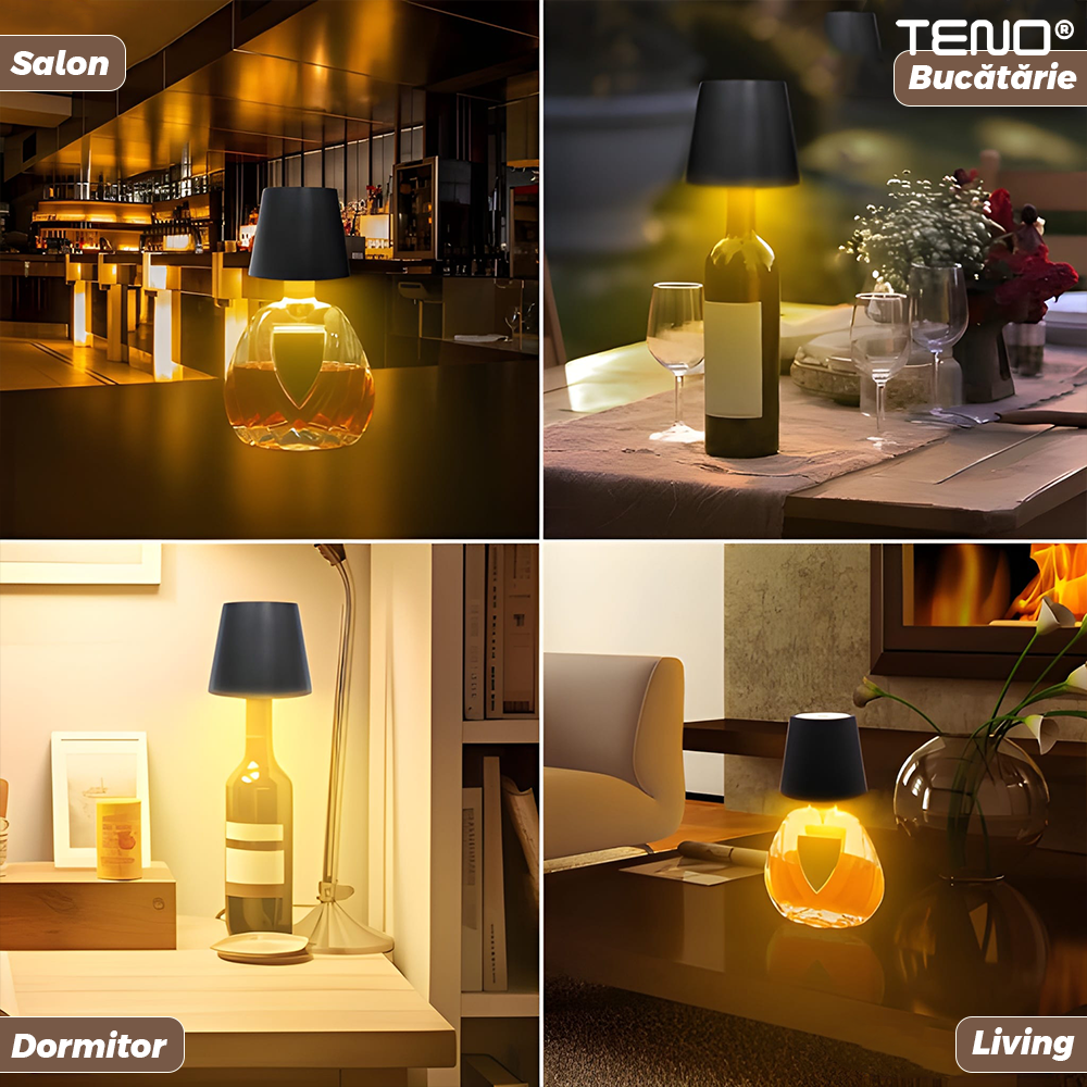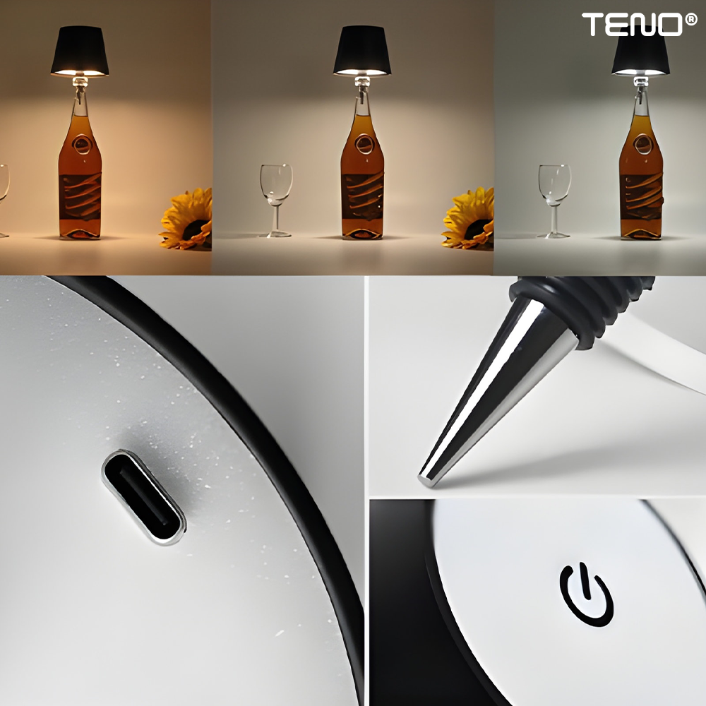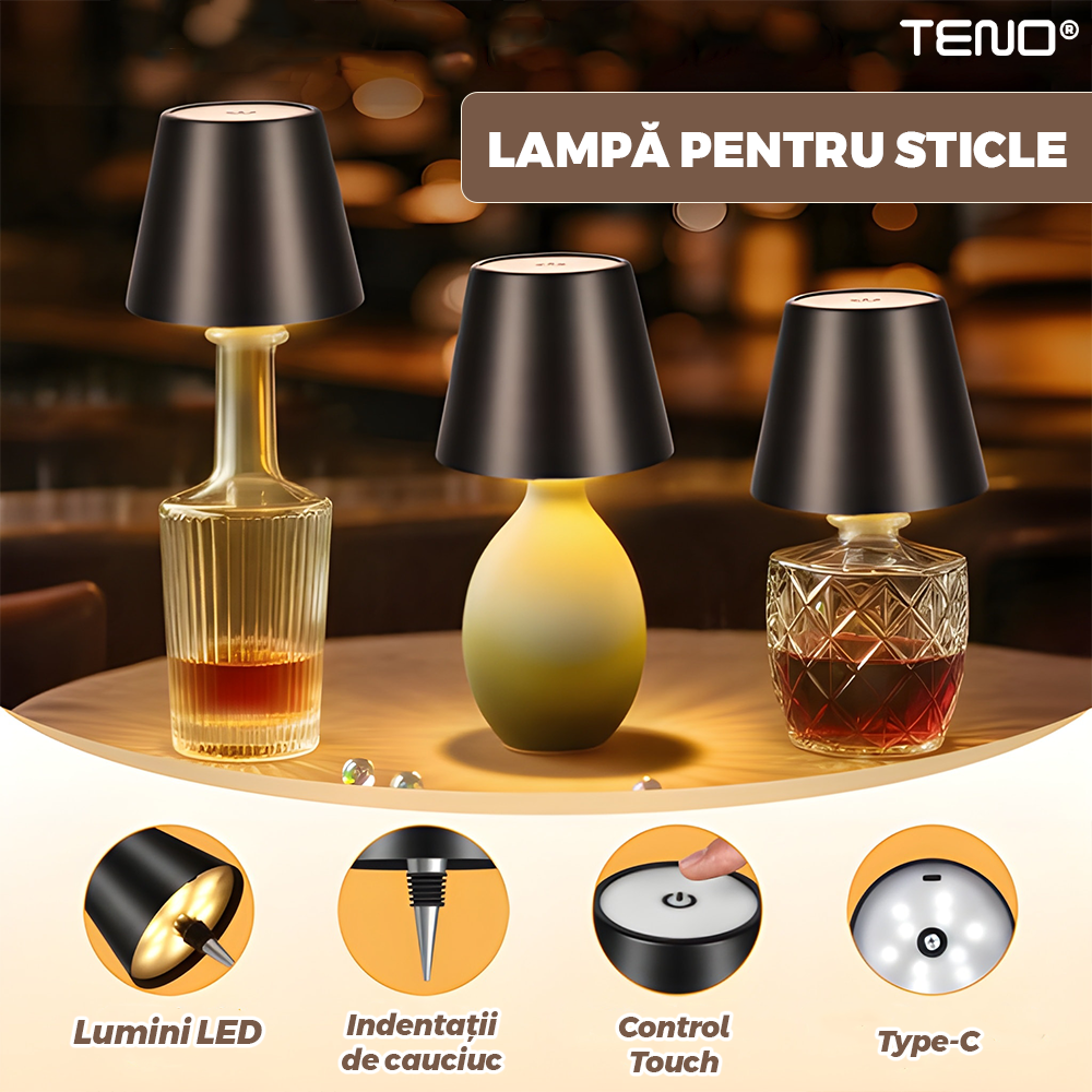 Lampa de Veghe Portabila Teno2153, pentru sticle, lumini LED, reincarcabila, dimabila, 3 moduri de iluminare, autonomie 10-20 ore, 5 W, negru