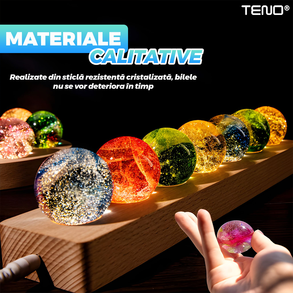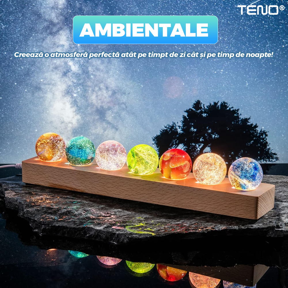 Lampa de Veghe Teno2164, 7 bile de cristal, ambientala, lumini LED, suport de lemn, lumina cu protectie pentru ochi, multicolor