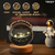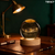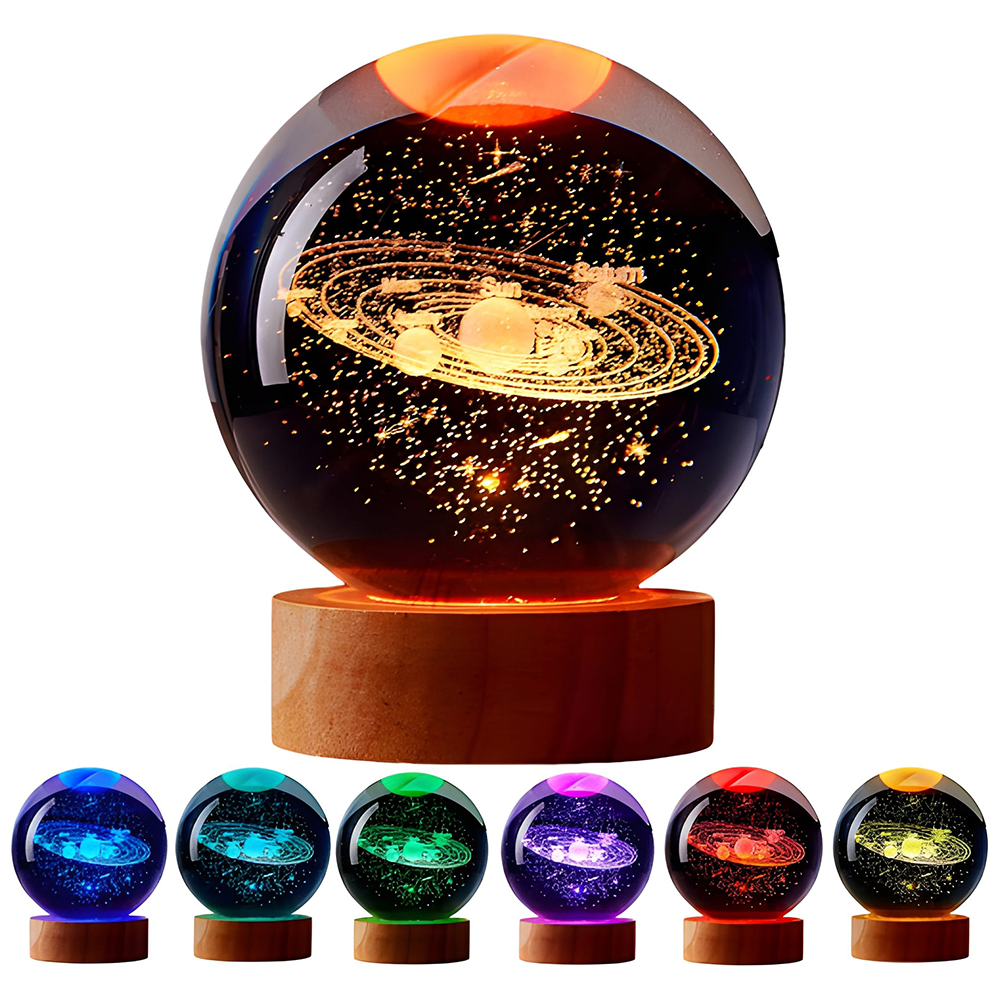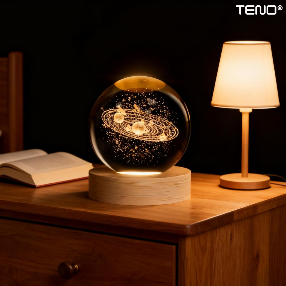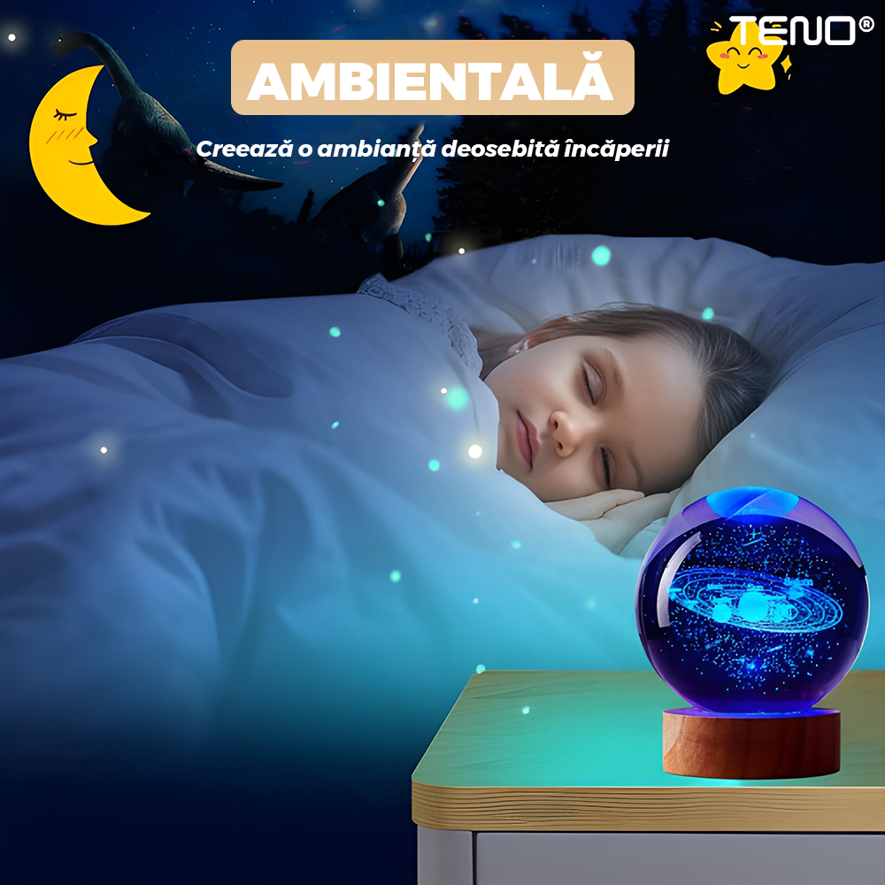 Lampa de Veghe Teno2165, bila de cristal, model sistem solar, lumini LED, suport de lemn, lumina cu protectie pentru ochi, 7 x 8 cm, transparent
