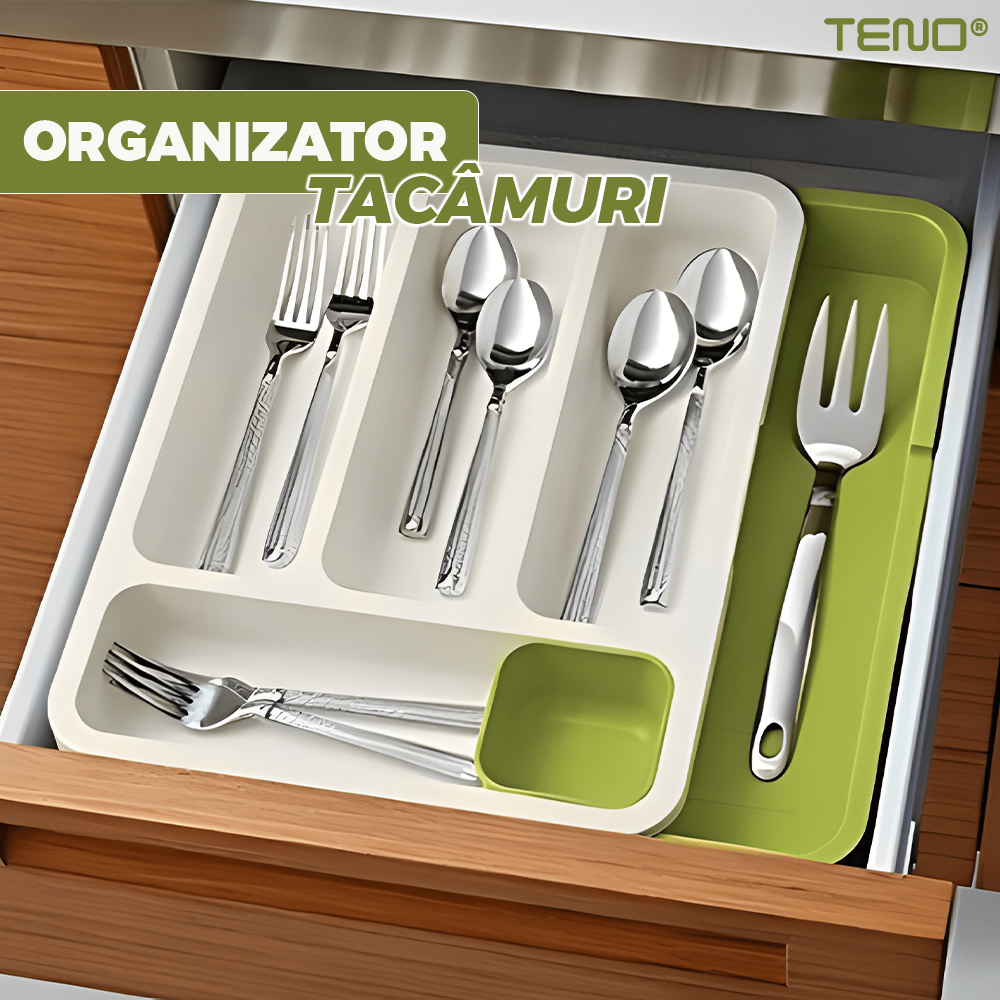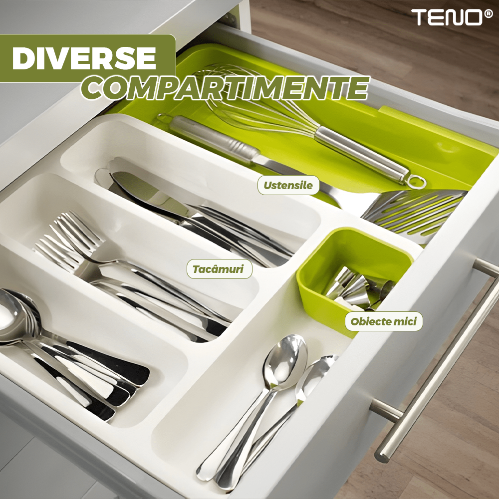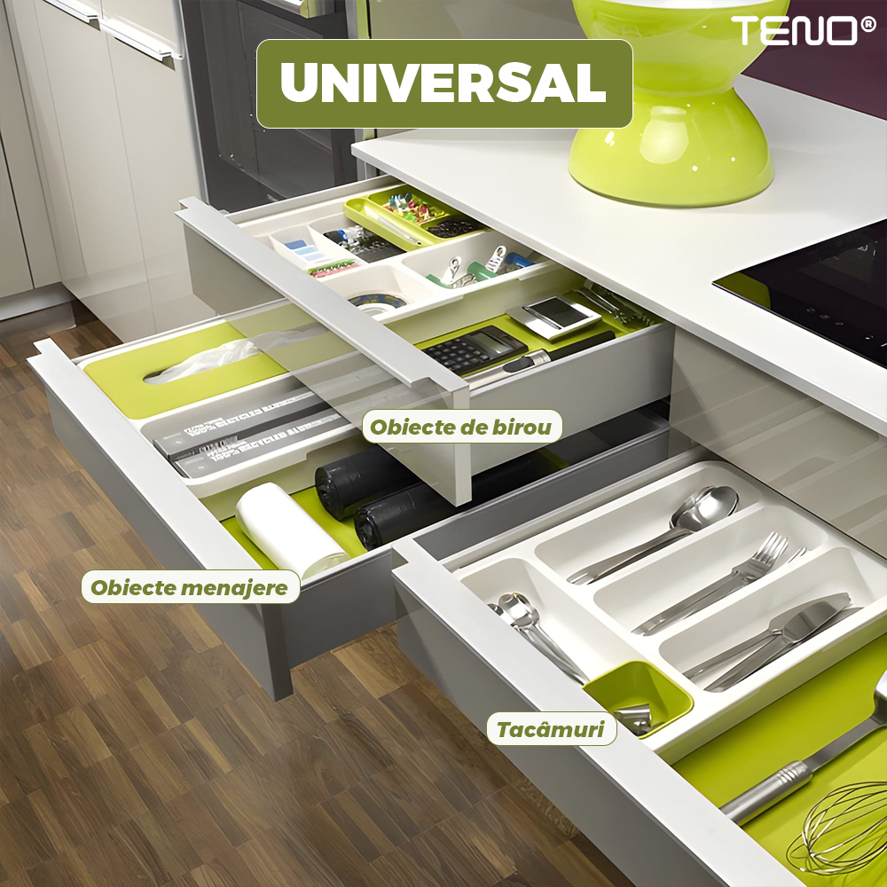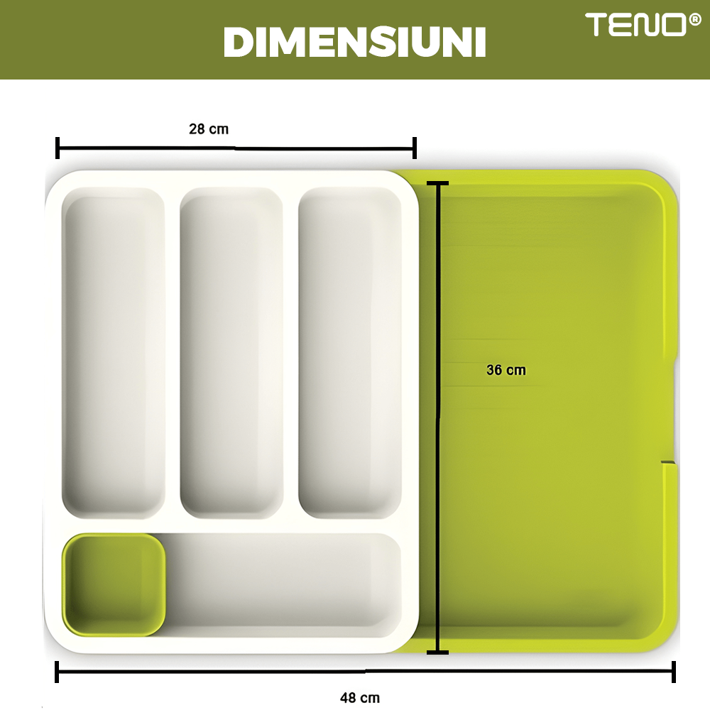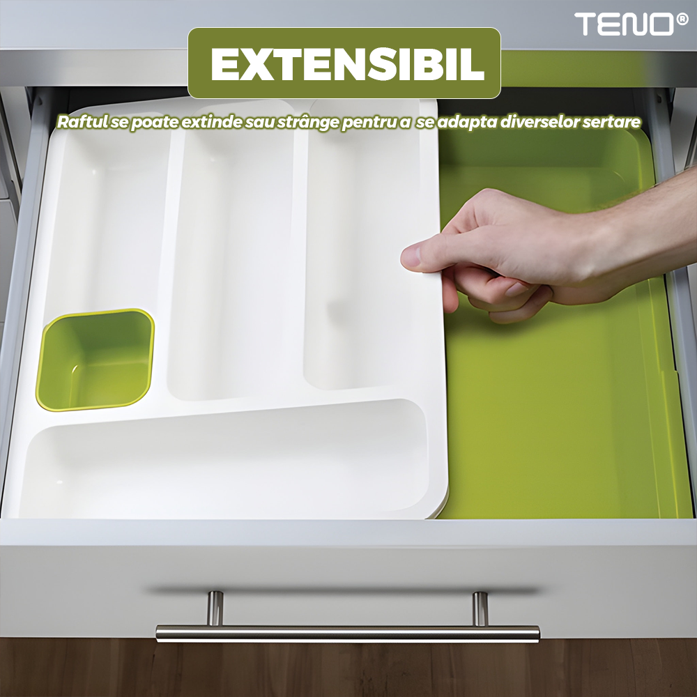 Organizator Extensibil Teno2220, suport sertar, pentru tacamuri/obiecte mici, universal, materiale premium, compartimente de diverse dimensiuni, alb/verde