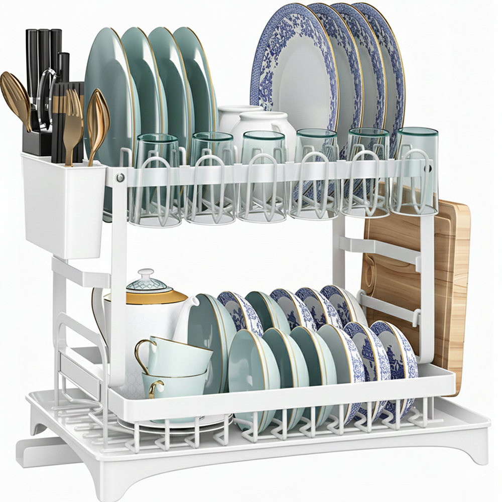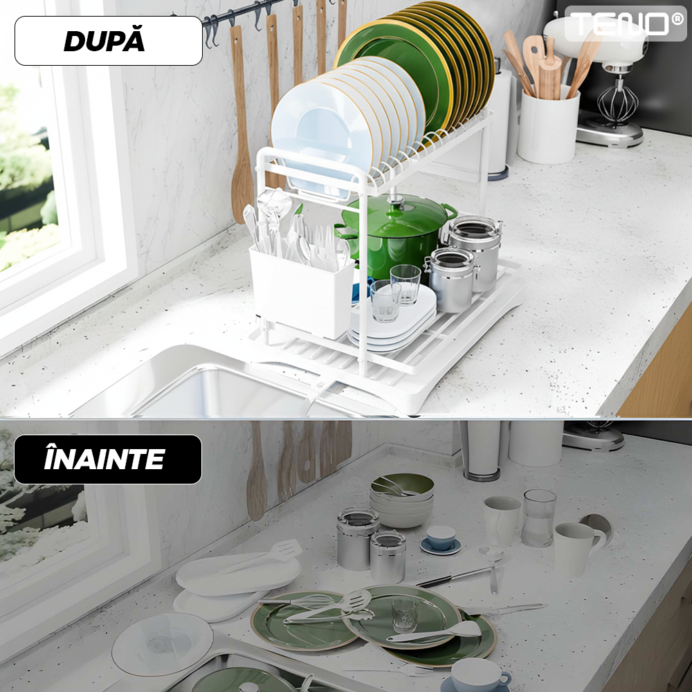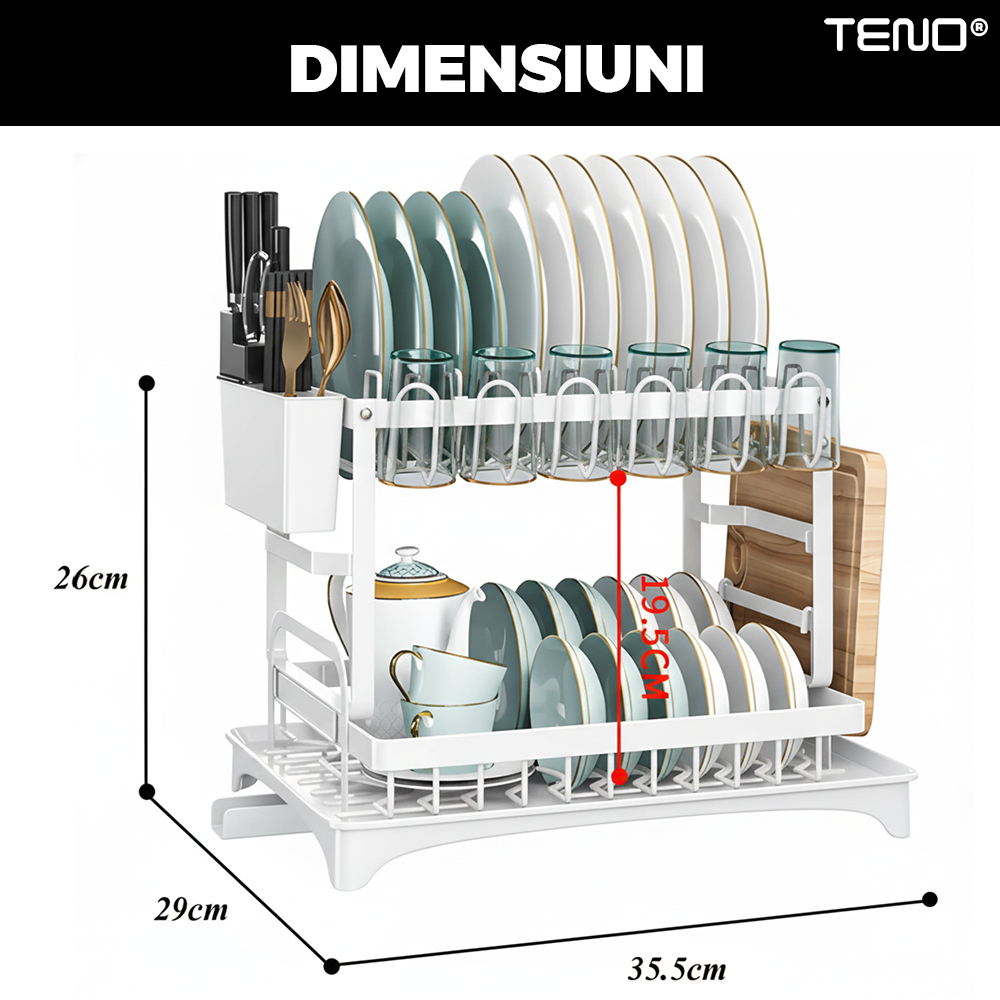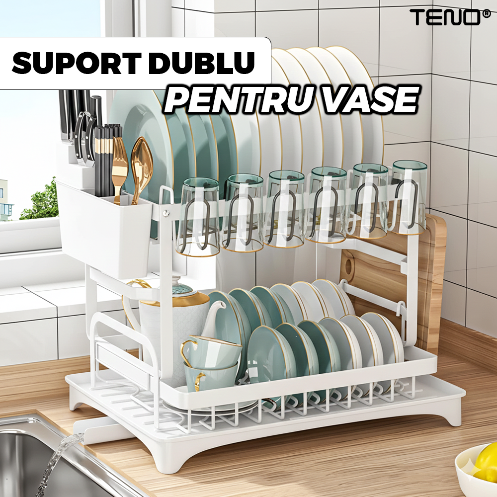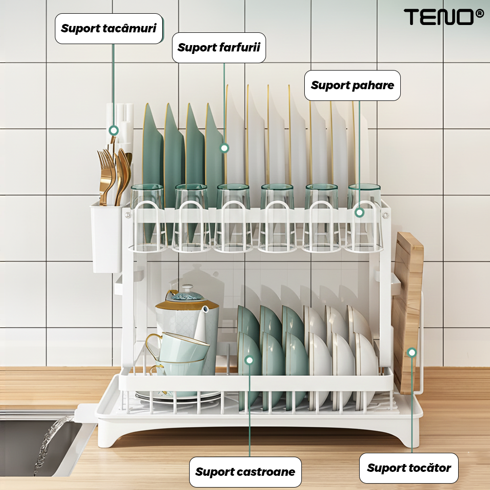 Scurgator de Vase Dublu Teno2124, scurgere automata, suport tacamuri, farfurii, castroane, tocator, pahare/cani, materiale rezistente, usor de montat, alb