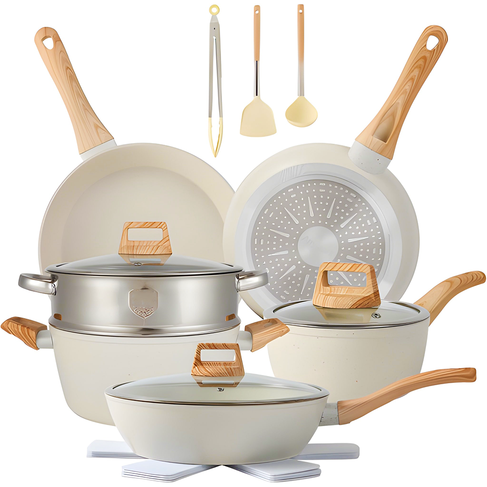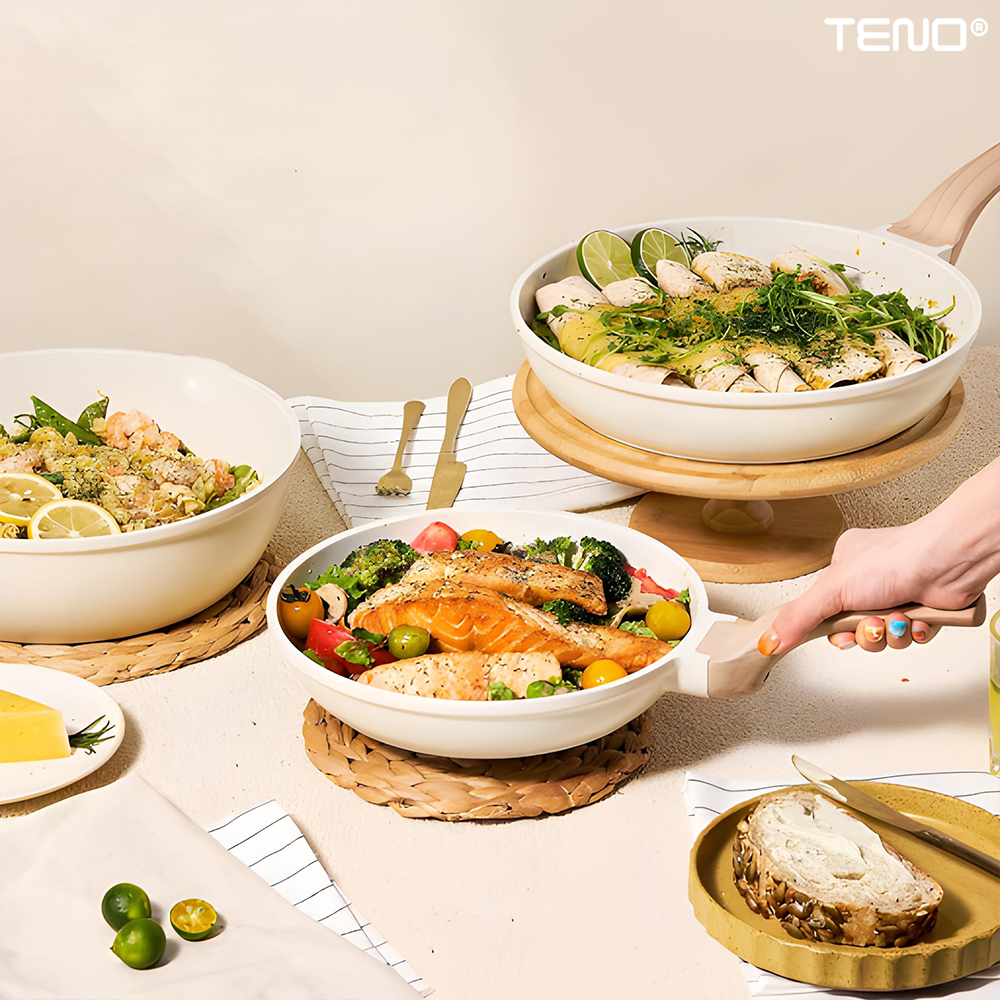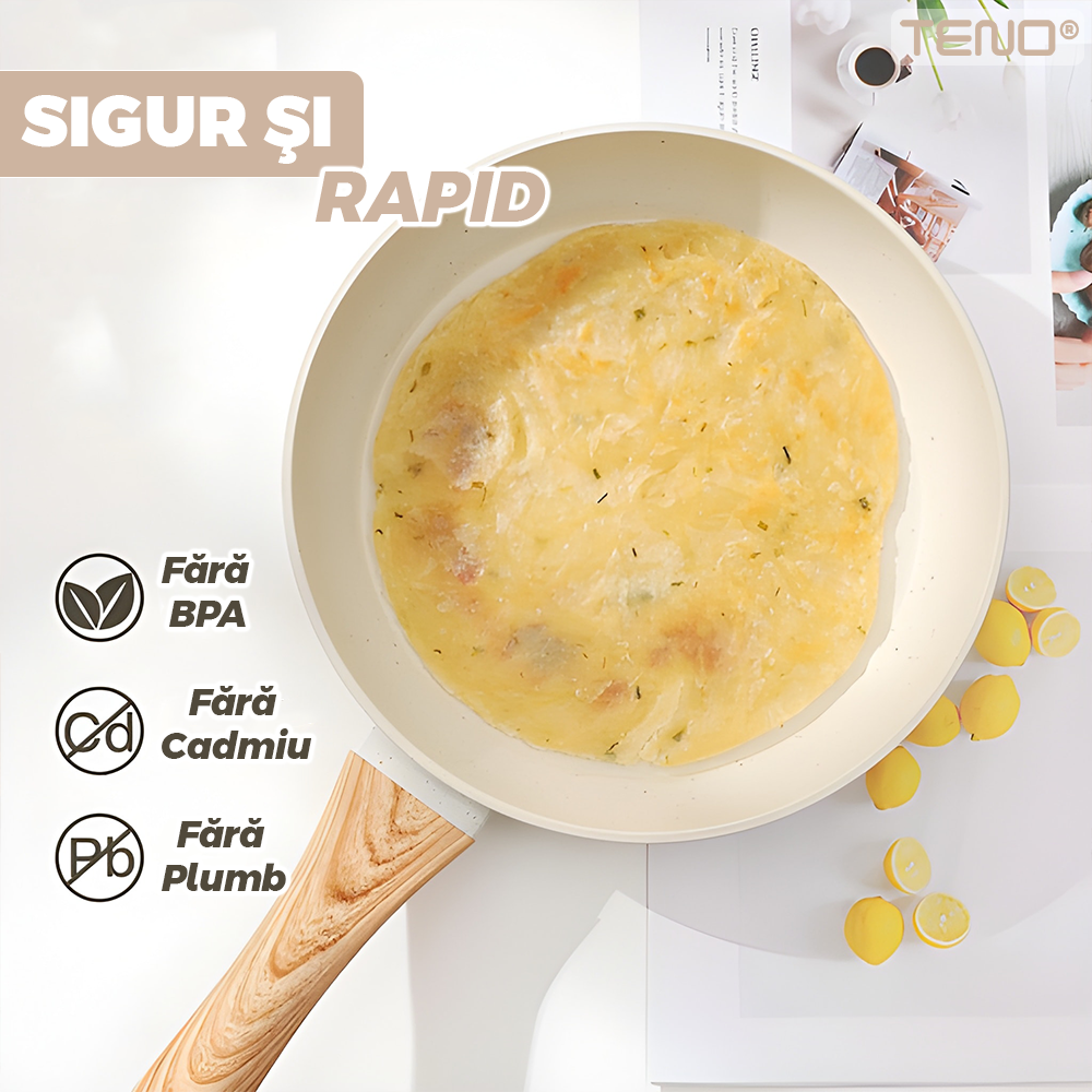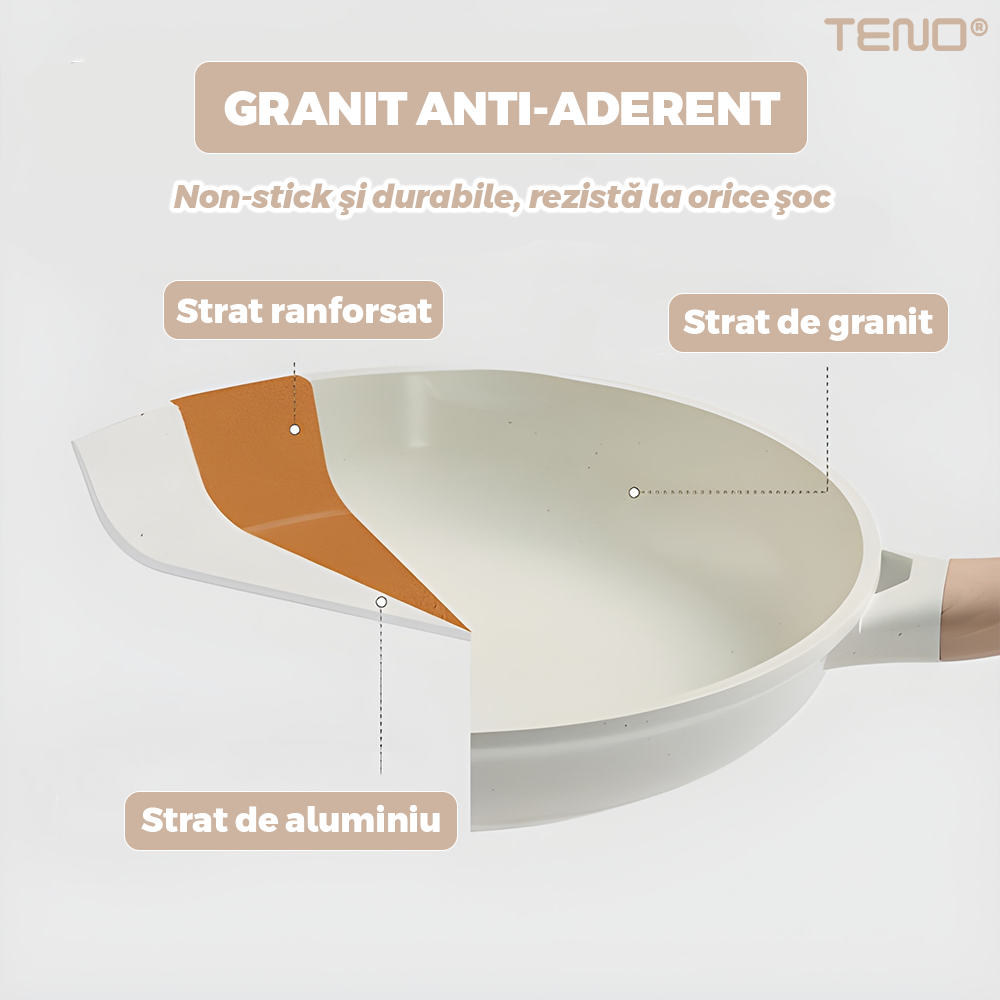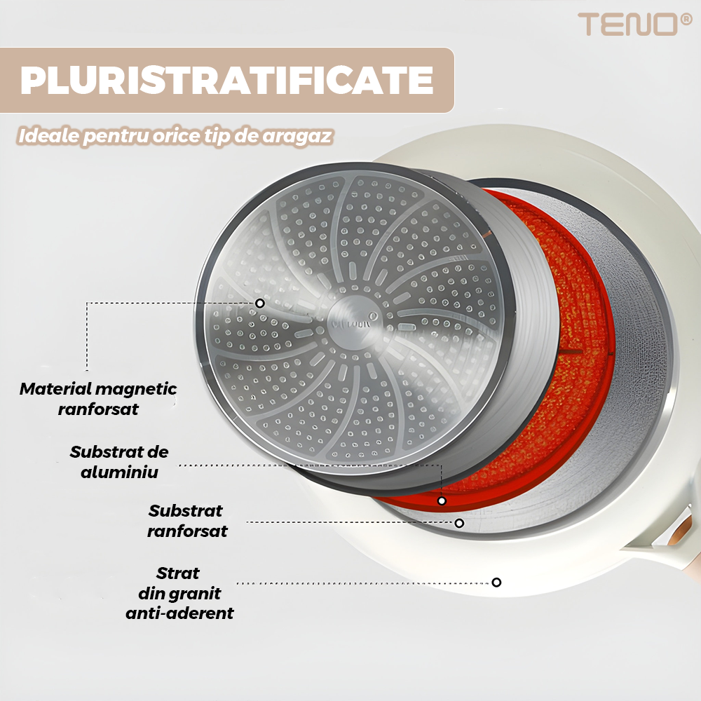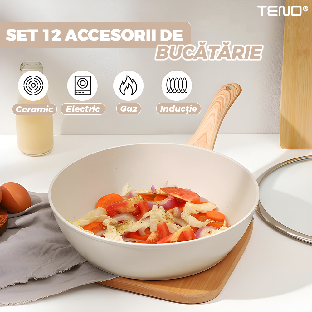 Set 12 Piese Oale si Tigai Teno2243, set de gatit cu capac din silicon, pluristratificate, compatibile cu plita cu inductie/ceramica/gaz, antiaderente, termorezistente, bej