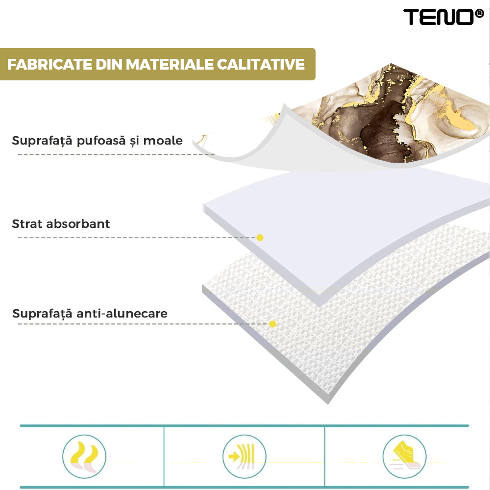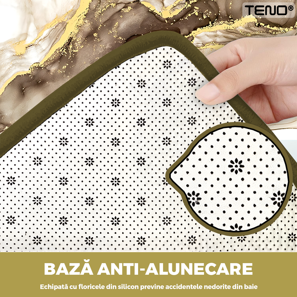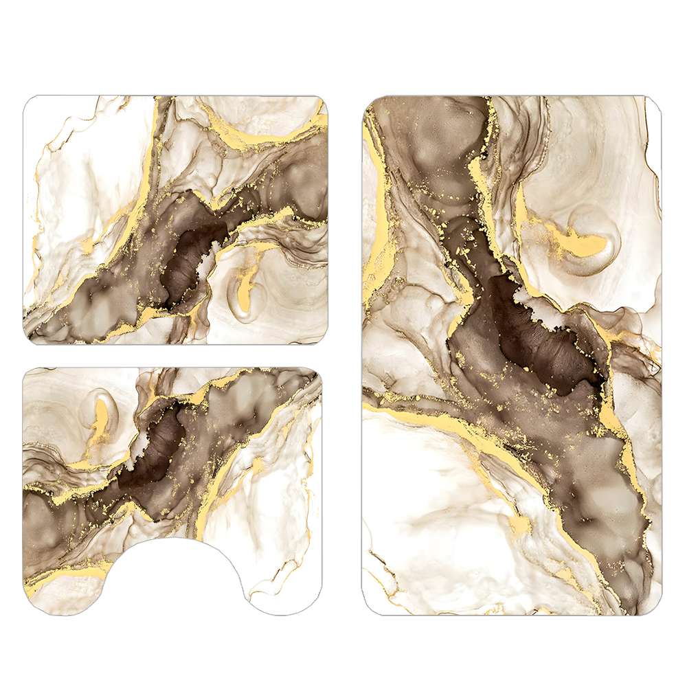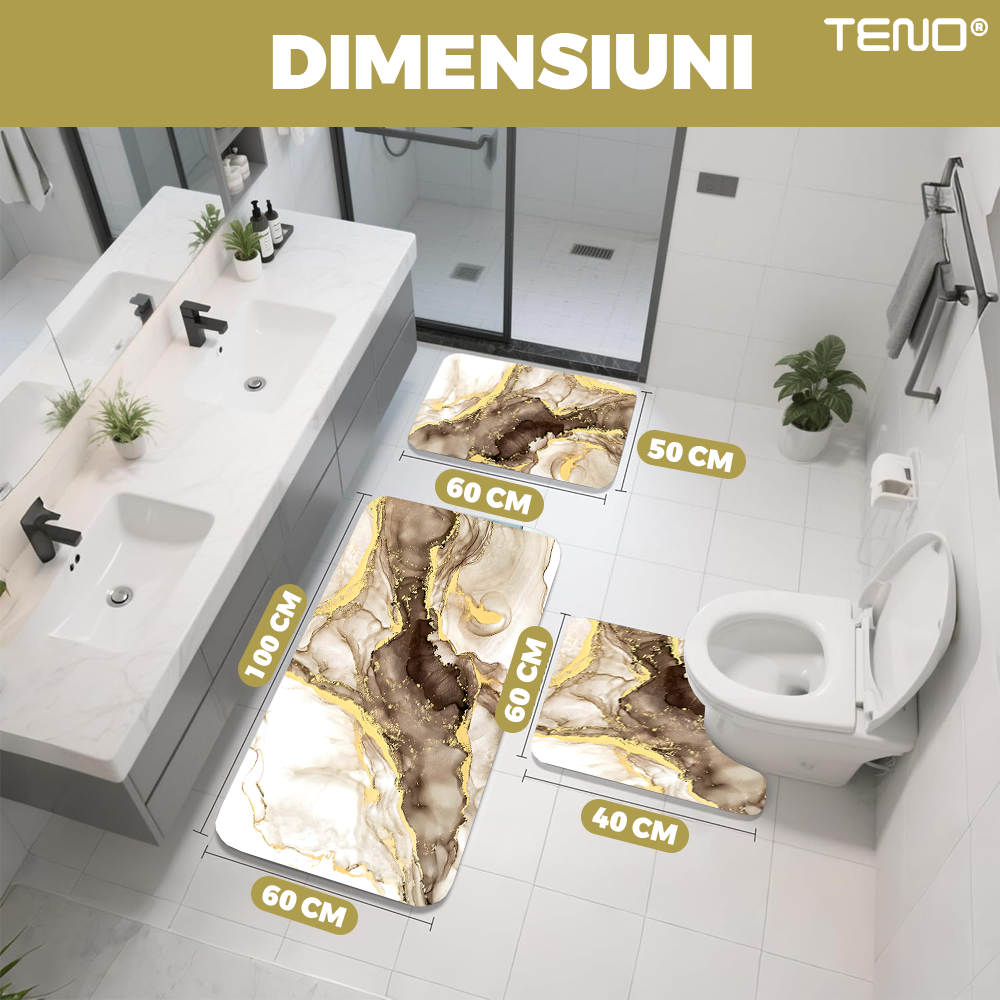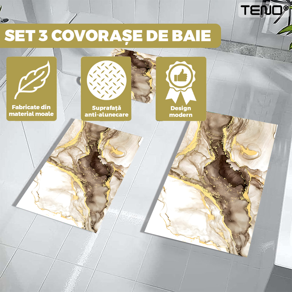 Set 3 Covoare de Baie Universale Teno1877, spuma, ultra-absorbante, anti-alunecare, pluristratificate, model marmura, 3 dimensiuni, bej/auriu