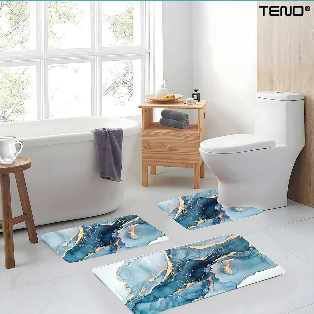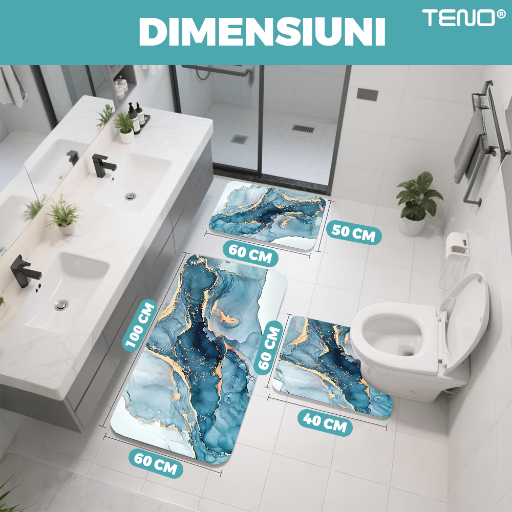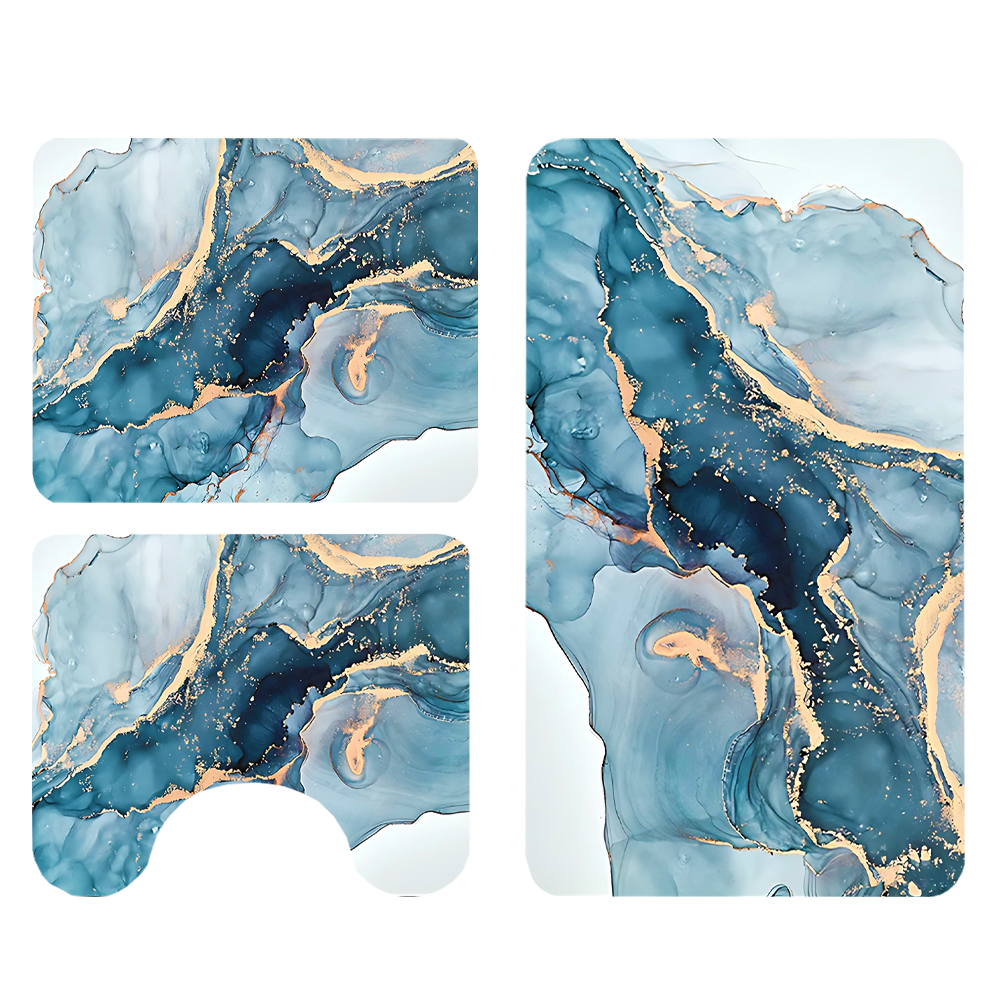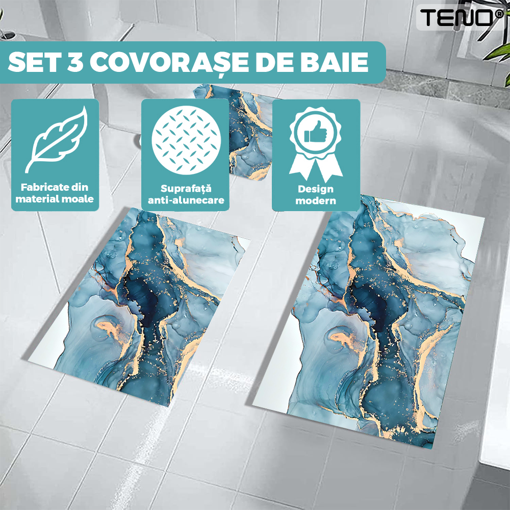 Set 3 Covoare de Baie Universale Teno1879, spuma, ultra-absorbante, anti-alunecare, pluristratificate, model marmura, 3 dimensiuni, albastru