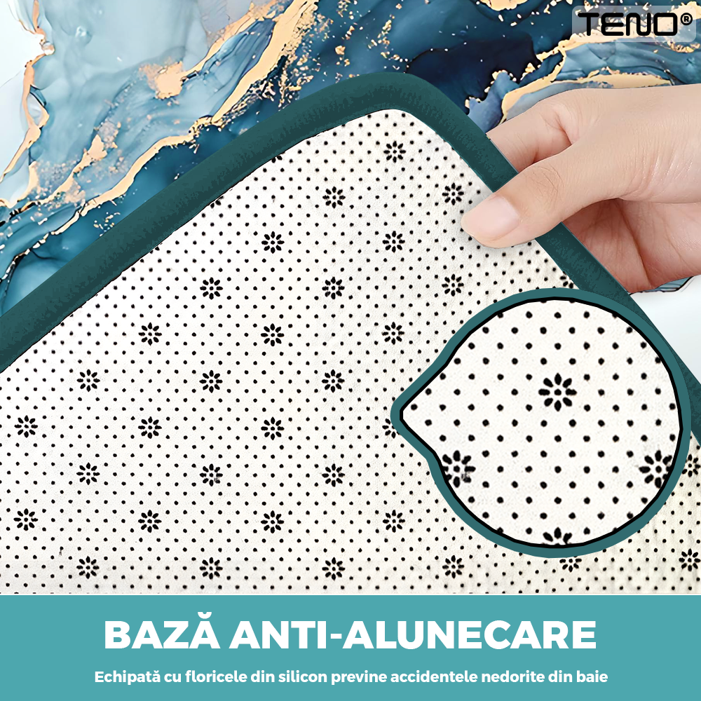 Fiecare covoras este prevazut cu o baza speciala anti alunecare, care ofera stabilitate pe suprafetele umede si reduce riscul accidentelor. Ideal pentru utilizarea in baie, unde siguranta este o prioritate.