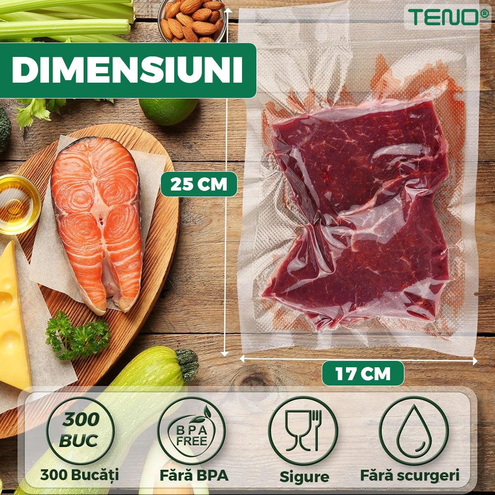 Set 300 Pungi pentru Vidat Universale Teno2634, 25cm x 17cm, compatibile cu orice aparat de vidat, gofrate, reutilizabile, rezistente la caldura, transparente