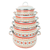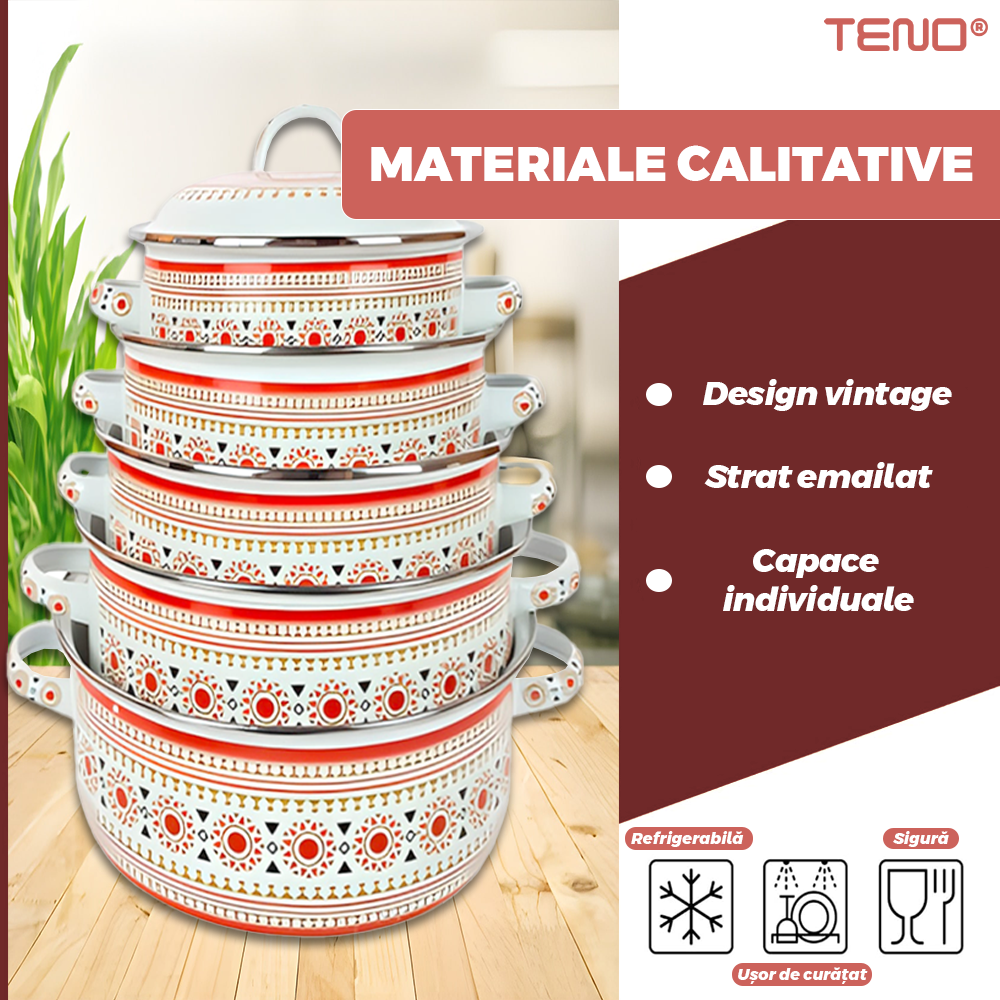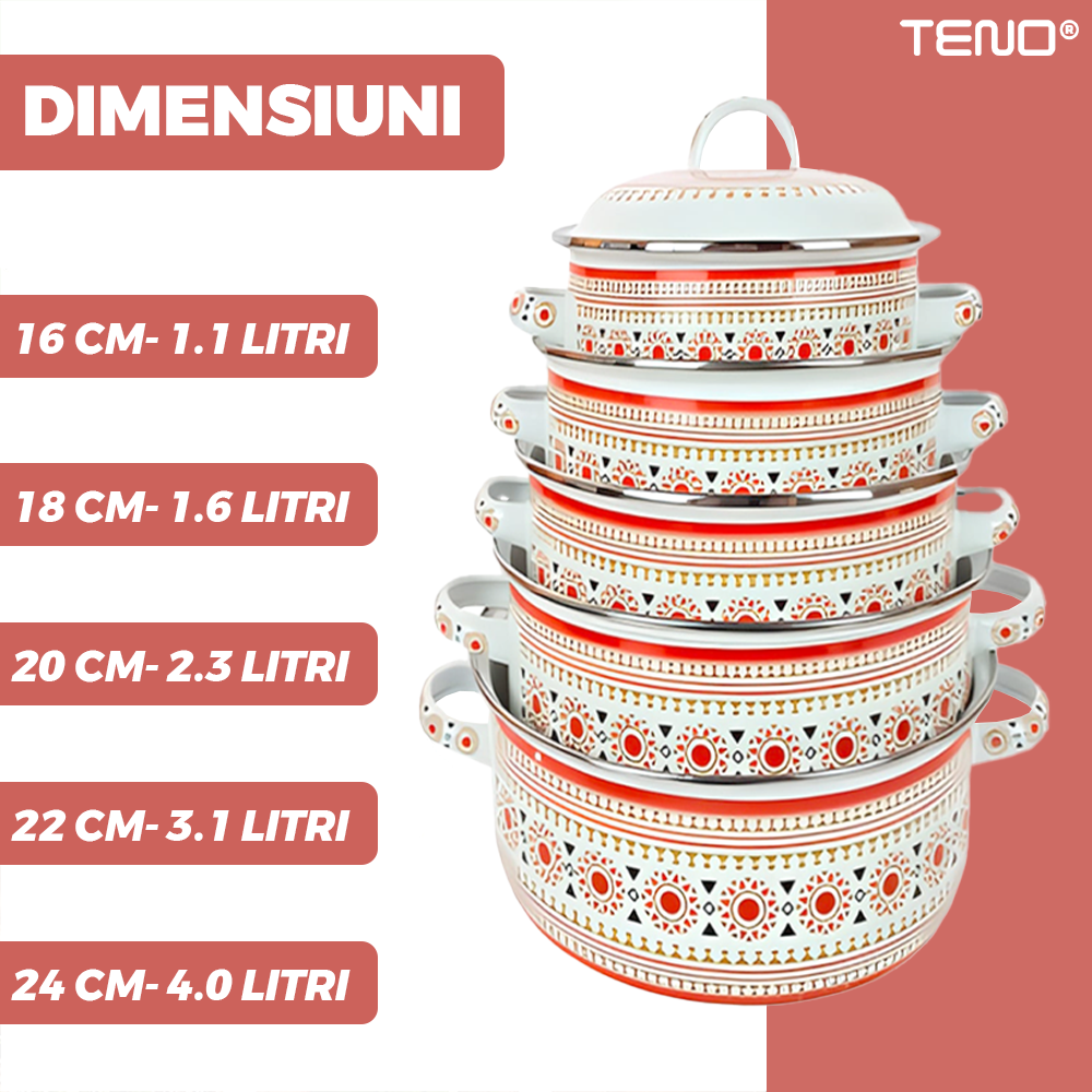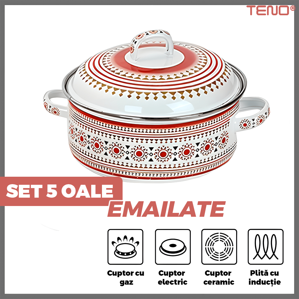 Set 5 Oale Emailate Teno2063, capace incluse, rezistente, pentru fiert/copt/prajit, 5 dimensiuni, capacitate 1-4 l, 16/18/20/22/24 cm, alb/rosu