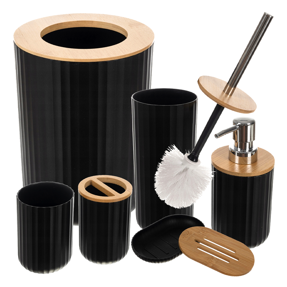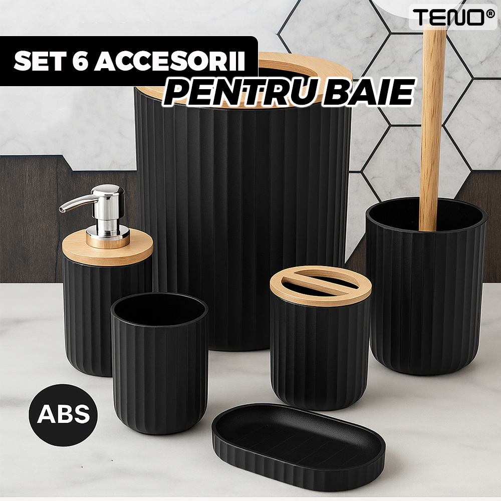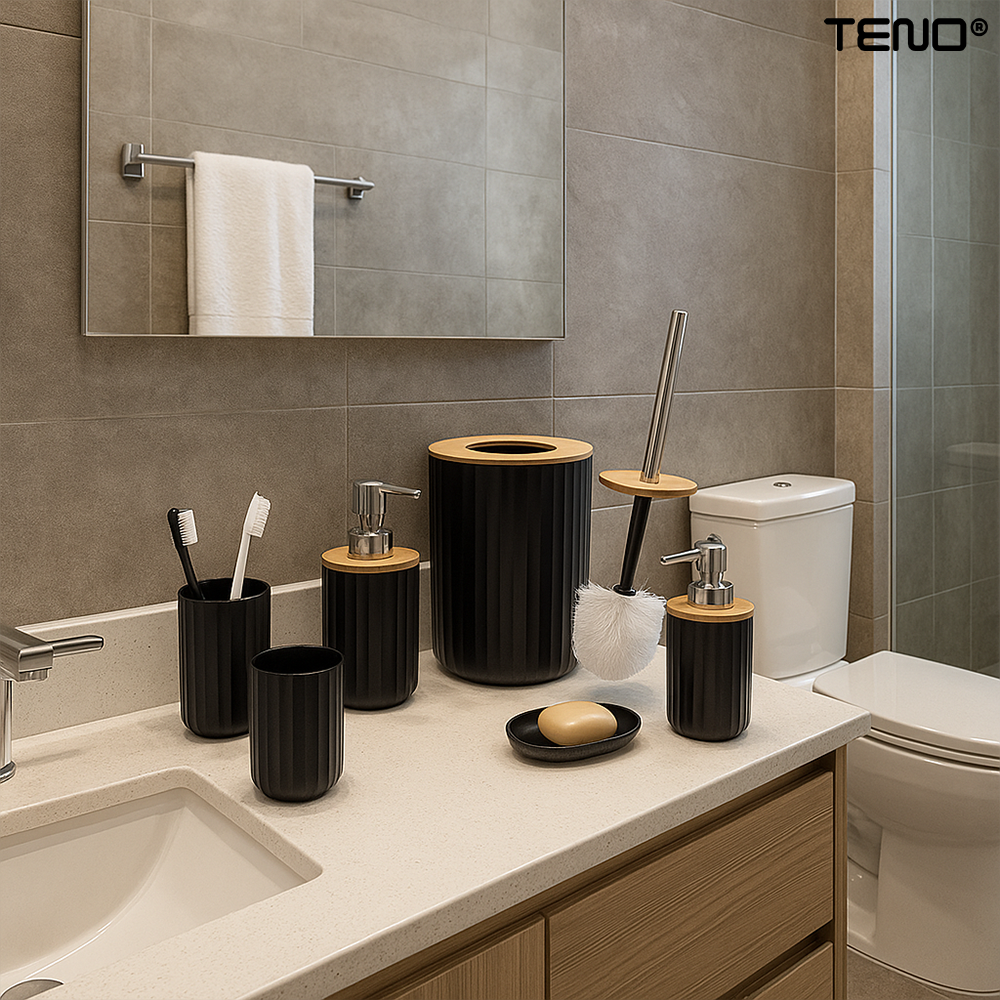 Set 6 Accesorii de Baie Teno2563, dispenser de sapun, suport de periute, perie de toaleta, suport sapun, cos de gunoi, detalii din bambus, materiale rezistente, design minimalist, striatii, negru