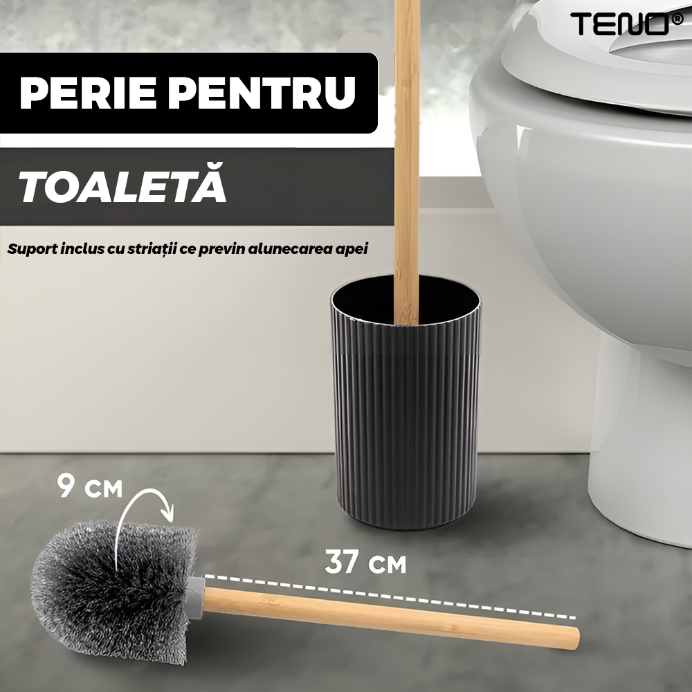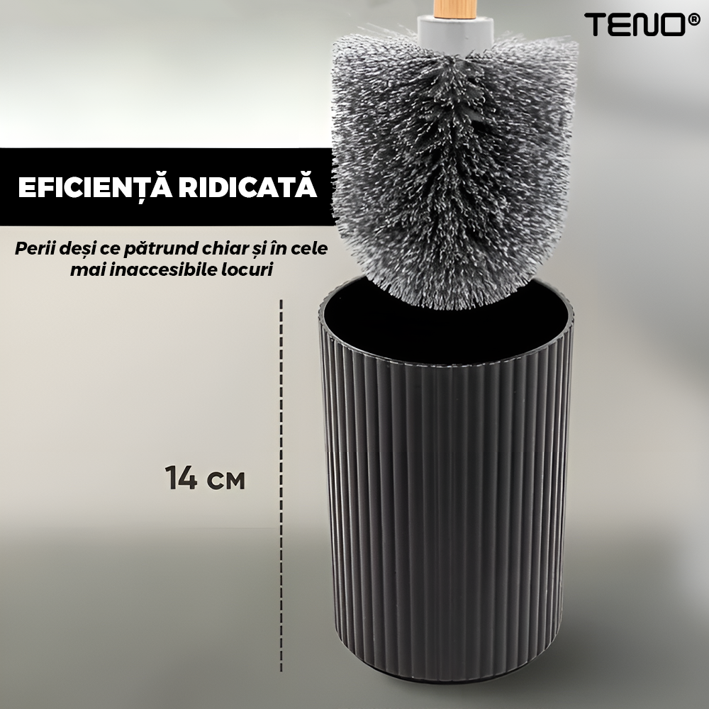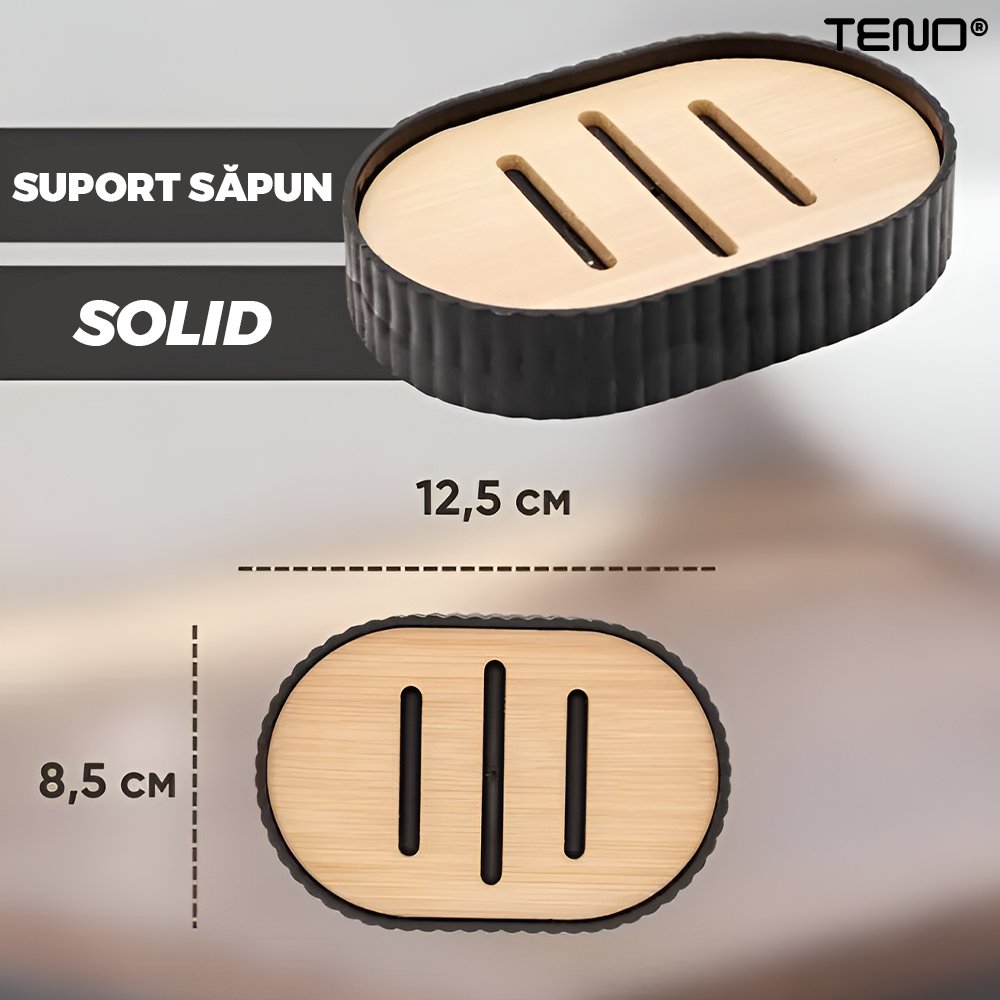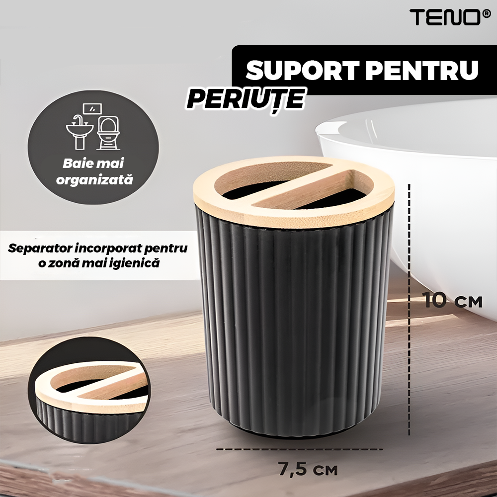 Set 6 Accesorii de Baie Teno2563, dispenser de sapun, suport de periute, perie de toaleta, suport sapun, cos de gunoi, detalii din bambus, materiale rezistente, design minimalist, striatii, negru