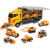 Set Camion Trailer de Jucarie pentru Transport Teno2512, seria utilaje de constructie, 6 masinute incluse, bulldozer, utilaje, tir, accesorii mobile, lansator si rampa frontala, platforma tractare, galben