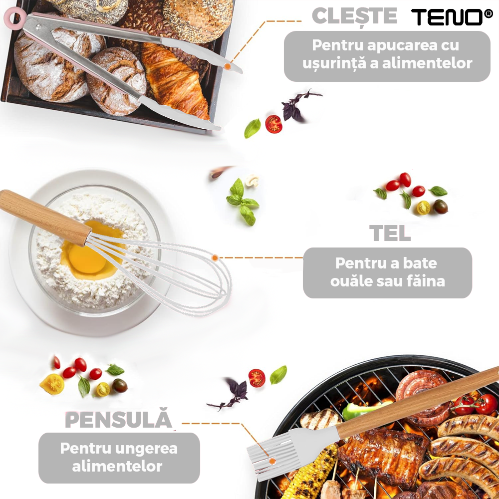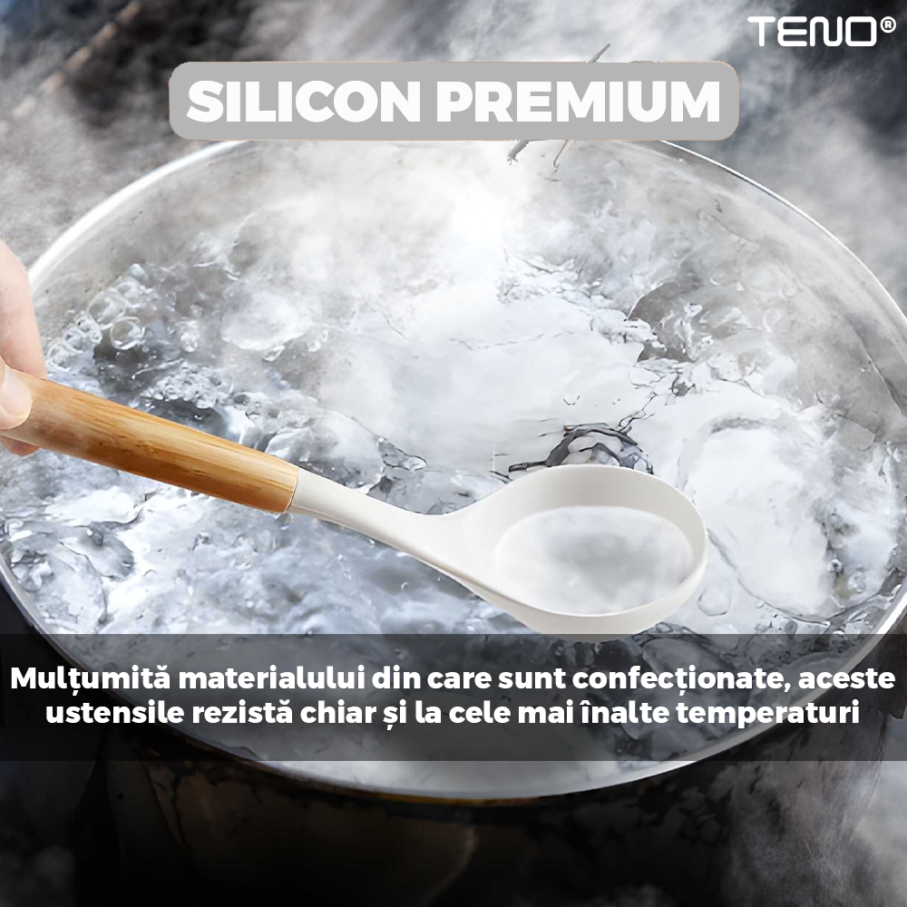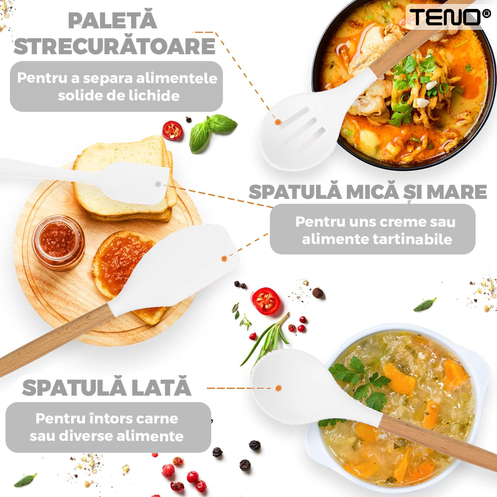 Durabilitate si Rezistenta: Fiecare ustensila este fabricata din silicon de inalta calitate, rezistent la caldura si la zgarieturi. Aceasta inseamna ca veti putea utiliza aceste ustensile pentru multi ani in bucataria dvs. fara sa-si piarda din calitate sau sa se deterioreze.