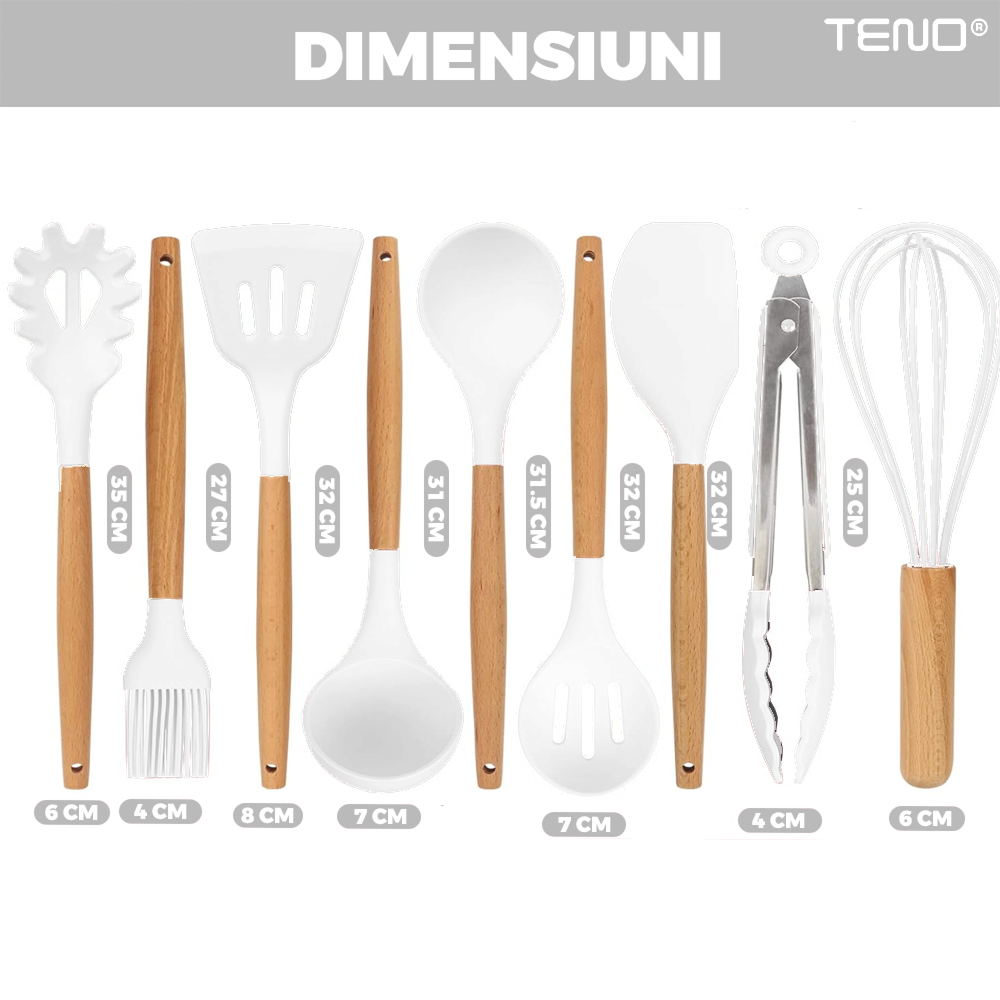 Varietate de Ustensile: Setul include 12 ustensile esentiale, precum linguri, spatule, teluri, si multe altele, care va vor ajuta sa faceti fata oricarui fel de mancare sau reteta. Nu veti mai simti niciodata nevoia de alt set de ustensile.
