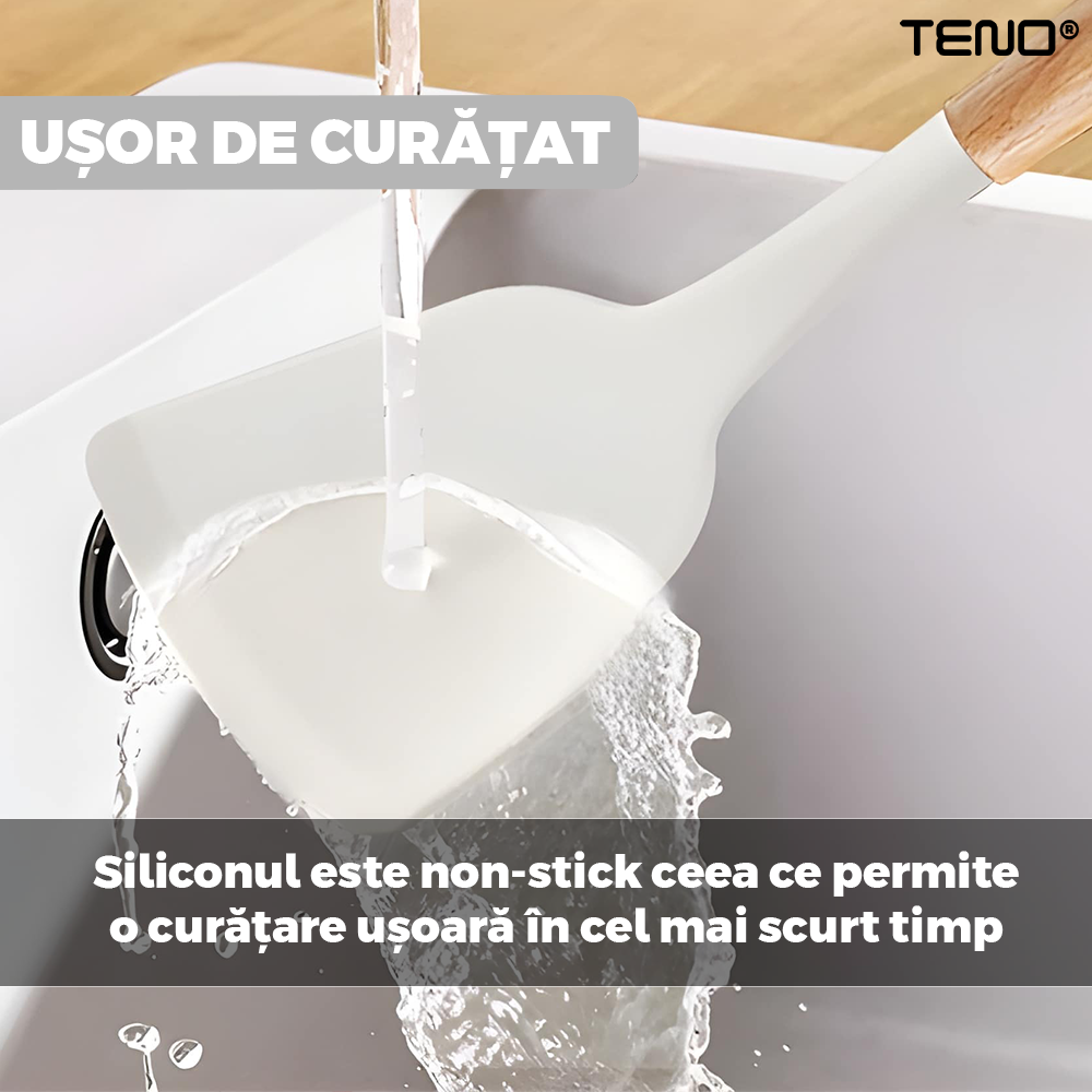 Usor de Curatat: Spalarea acestor ustensile este o adevarata placere. Siliconul antiaderent permite curatarea rapida si usoara. Aceste ustensile pot fi curatate manual sau in masina de spalat vase.