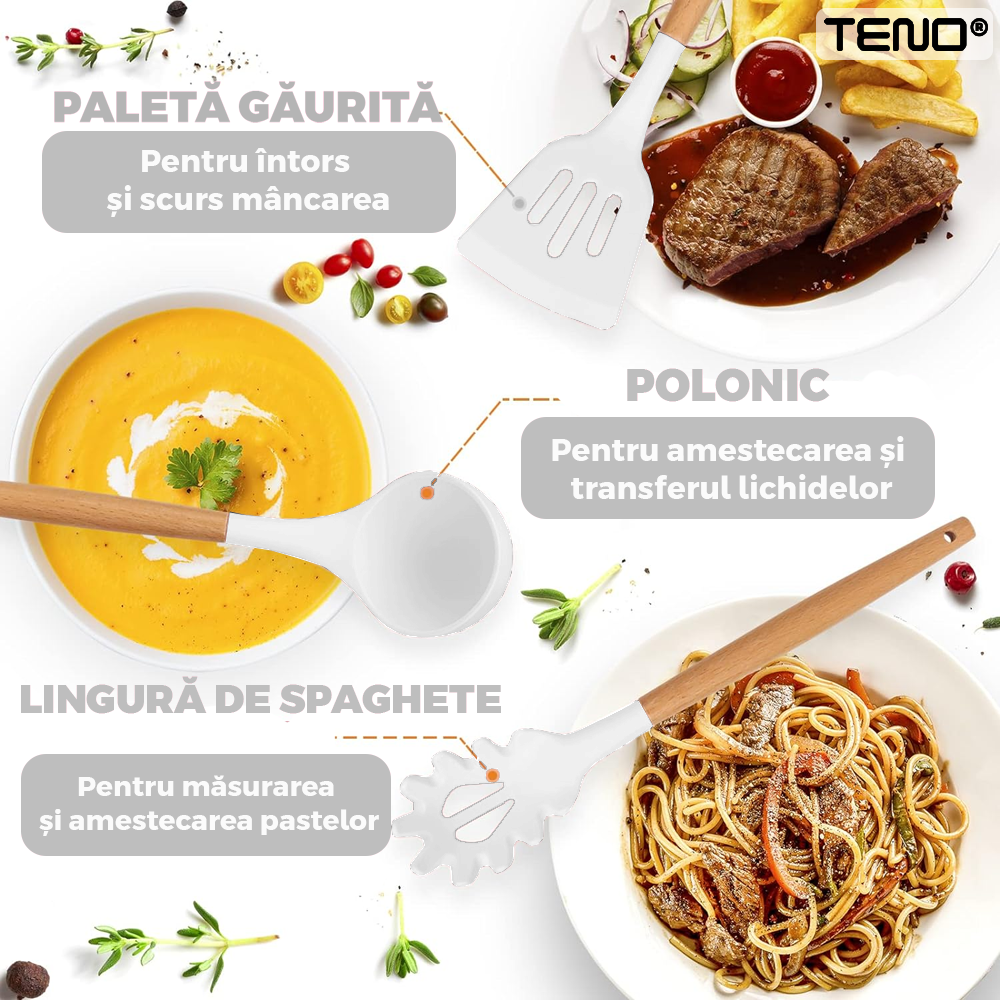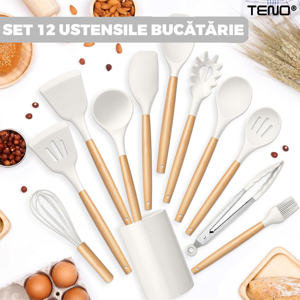 Descoperiti setul perfect de ustensile de bucatarie care va va simplifica viata in bucatarie - Setul nostru de 12 ustensile de bucatarie din silicon, antiaderente, sigure si usor de curatat!