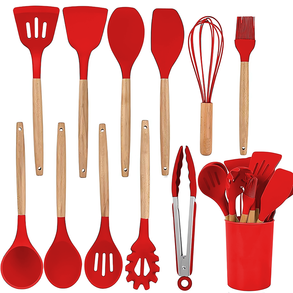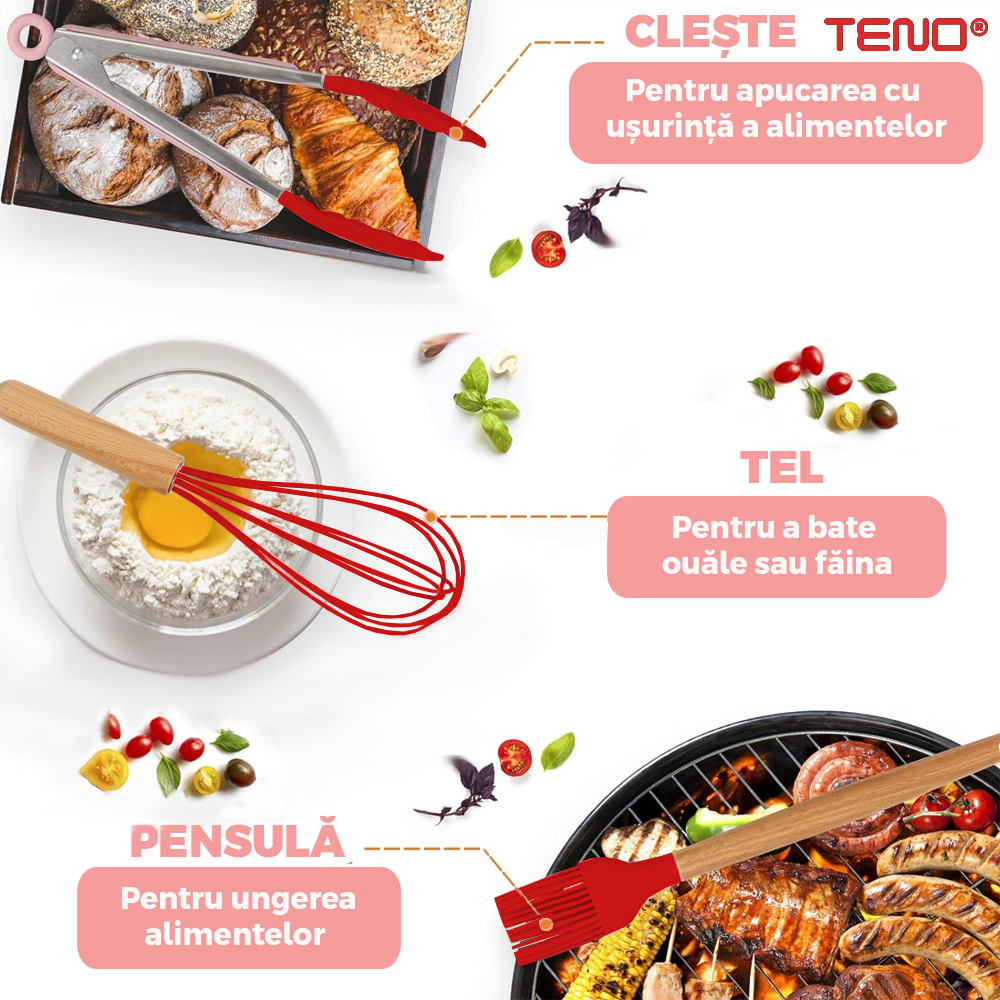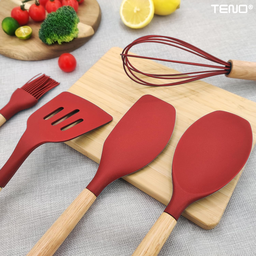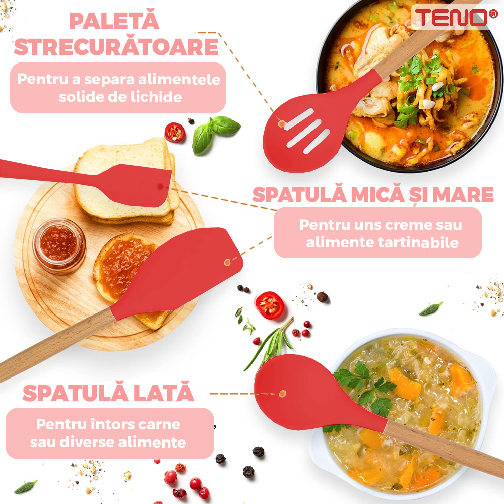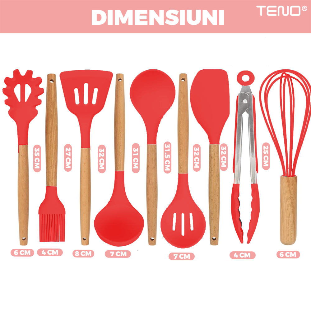 Set Ustensile Bucatarie 12 Piese Silicon Alimentar Teno2121, termorezistente, antiaderente, sigure, suport inclus, rosu