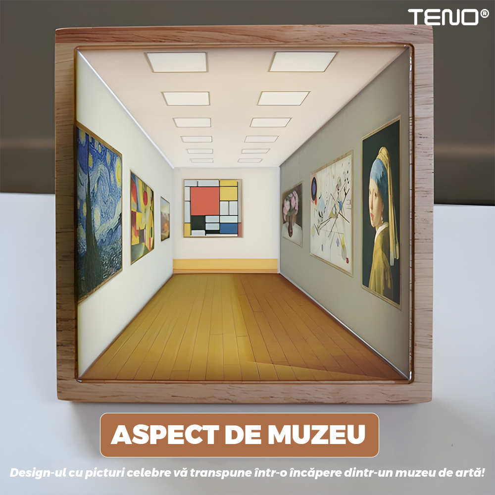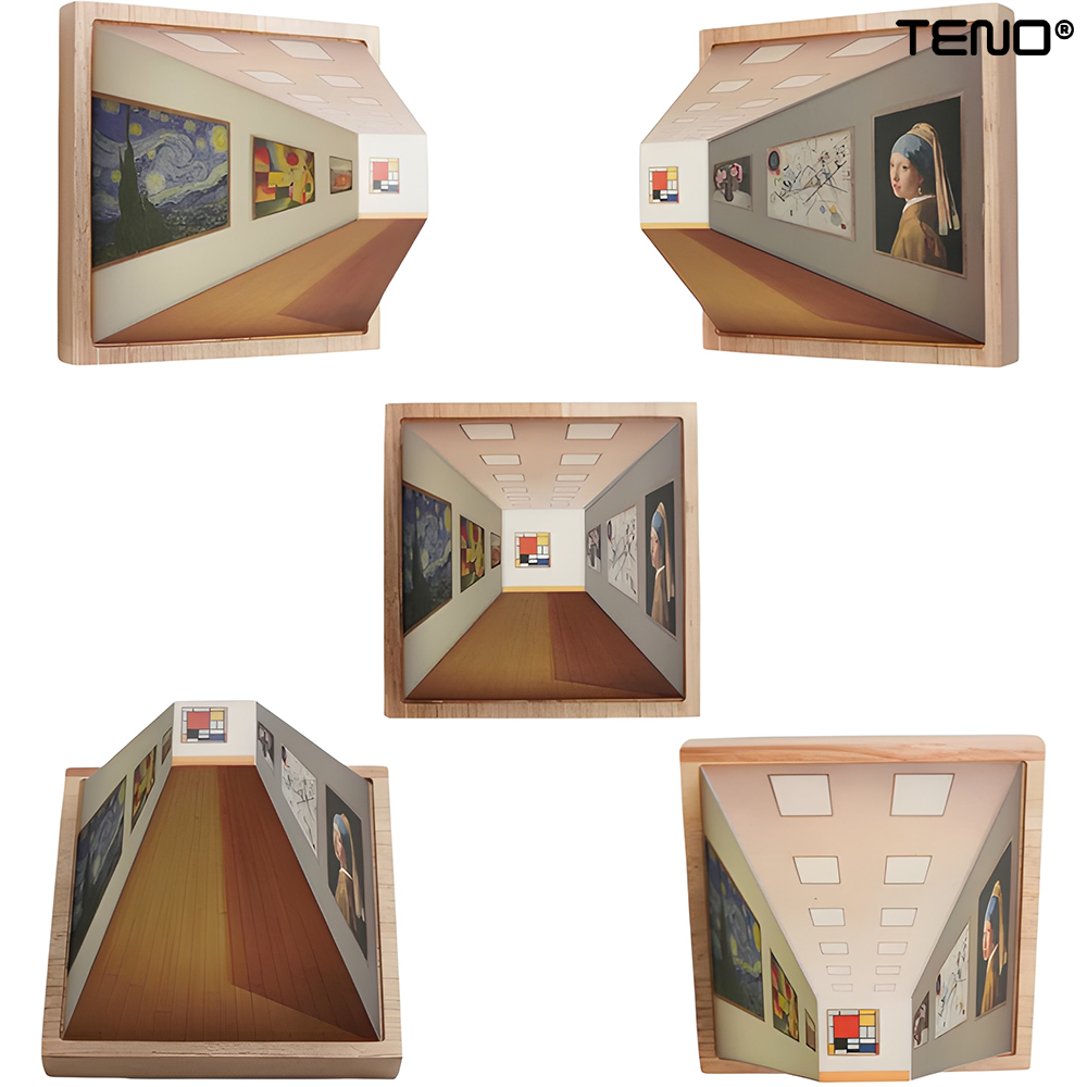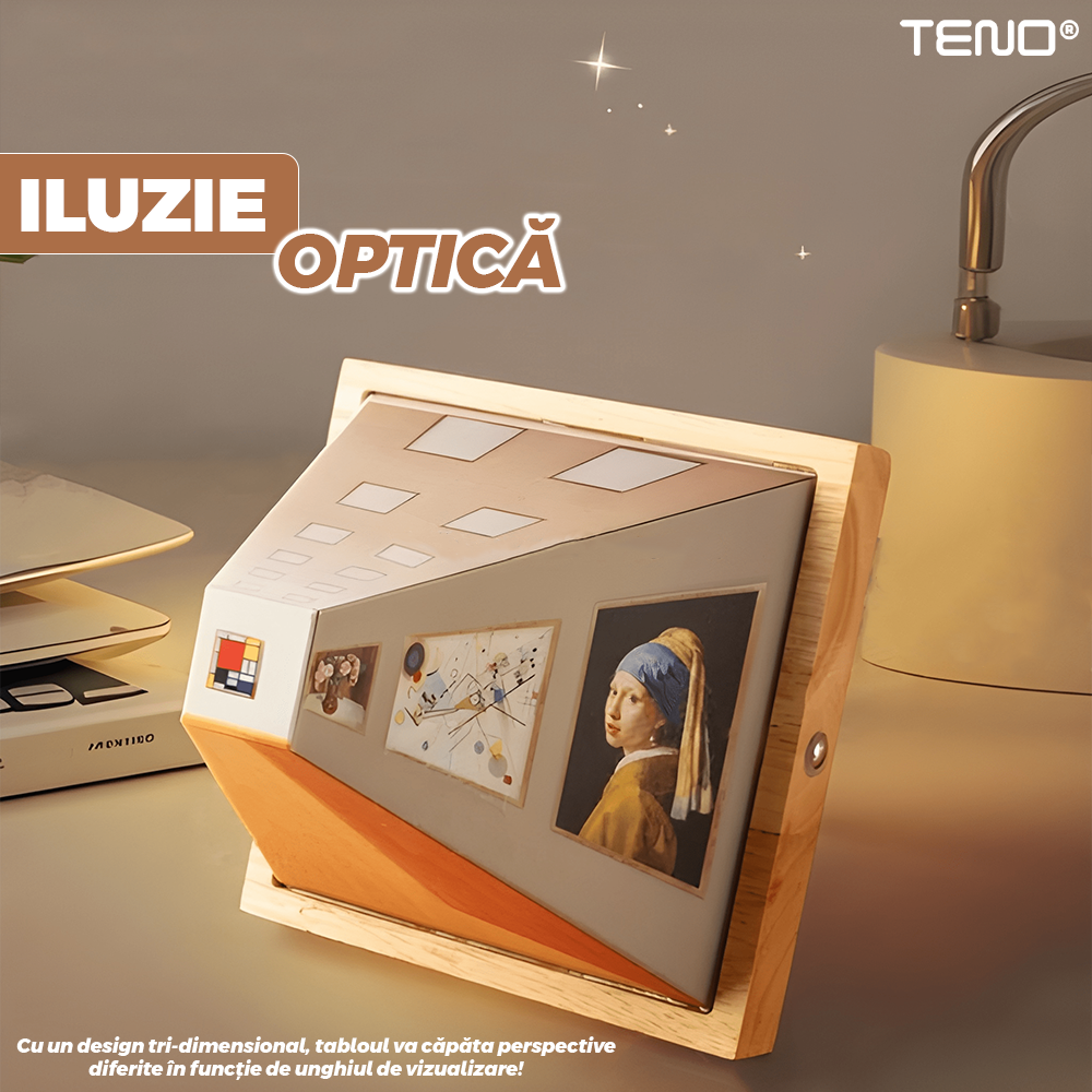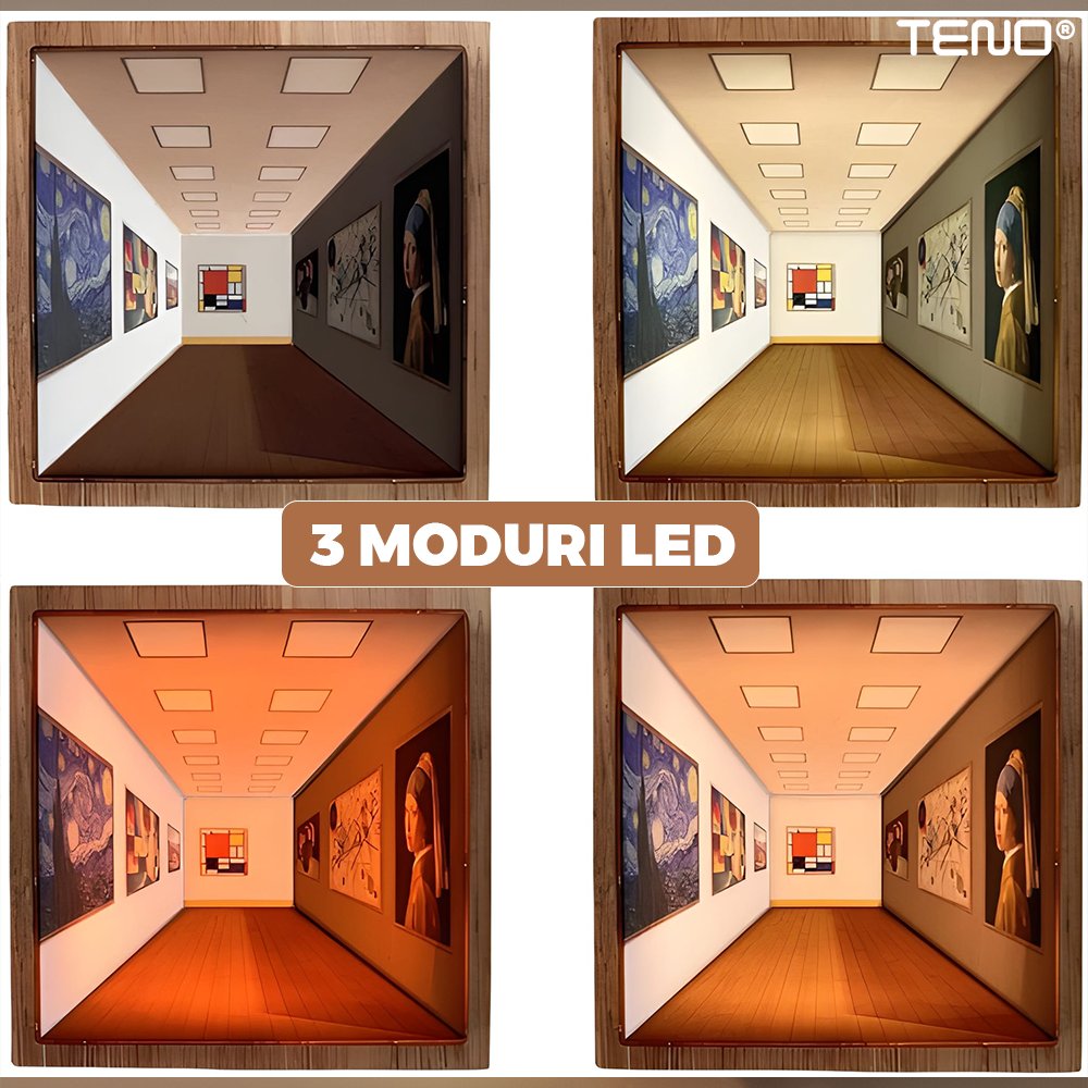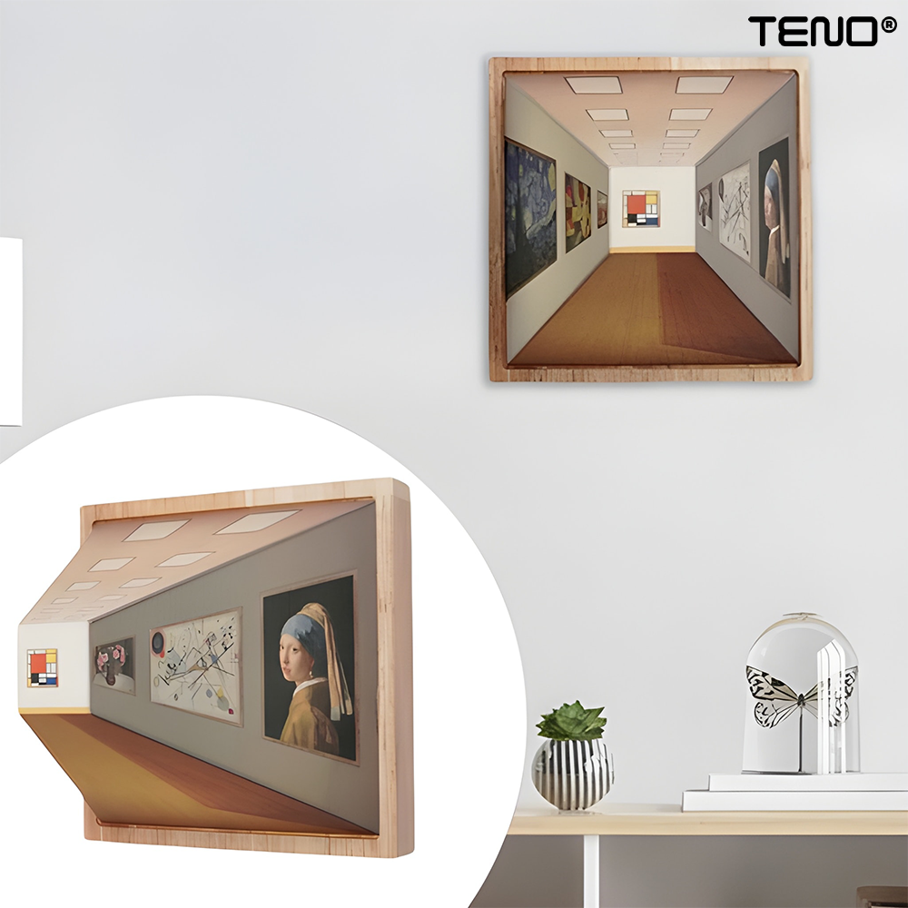 Tablou Iluzie Teno2162, picturi celebre, design 3D, diverse perspective, rama din lemn, lumini LED, naked eye, 19 x 19 x 15 cm, maro